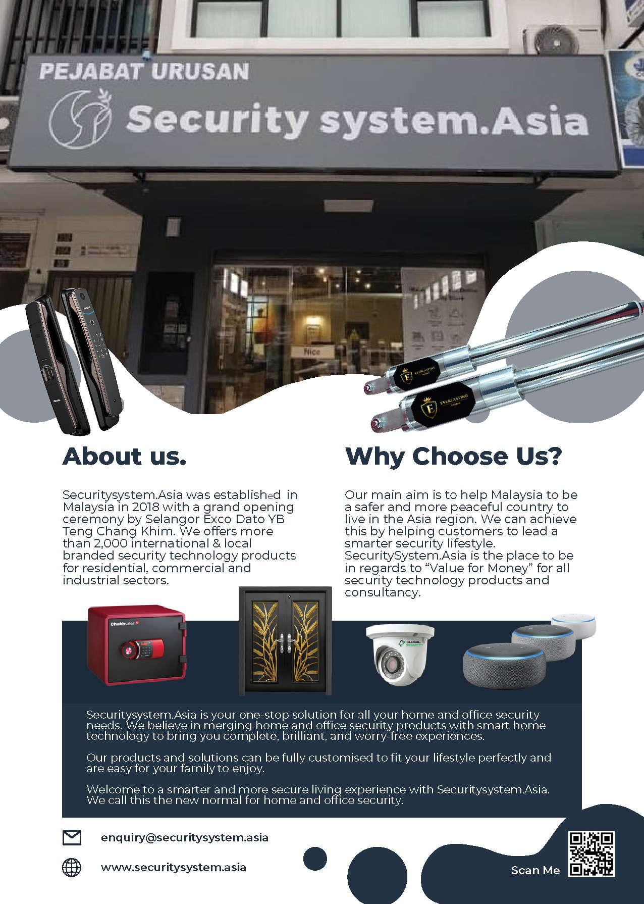 Secu ritysystem.Asia was established in Mala),sra rn 2Ol8 wrth a grand openrng ceremony by Selangor Exco Dato YB Teng Chang Khim. We offers more than 2,OOO international& local branded secu rity technology products for residential, commercial and ind ustrial sectors.