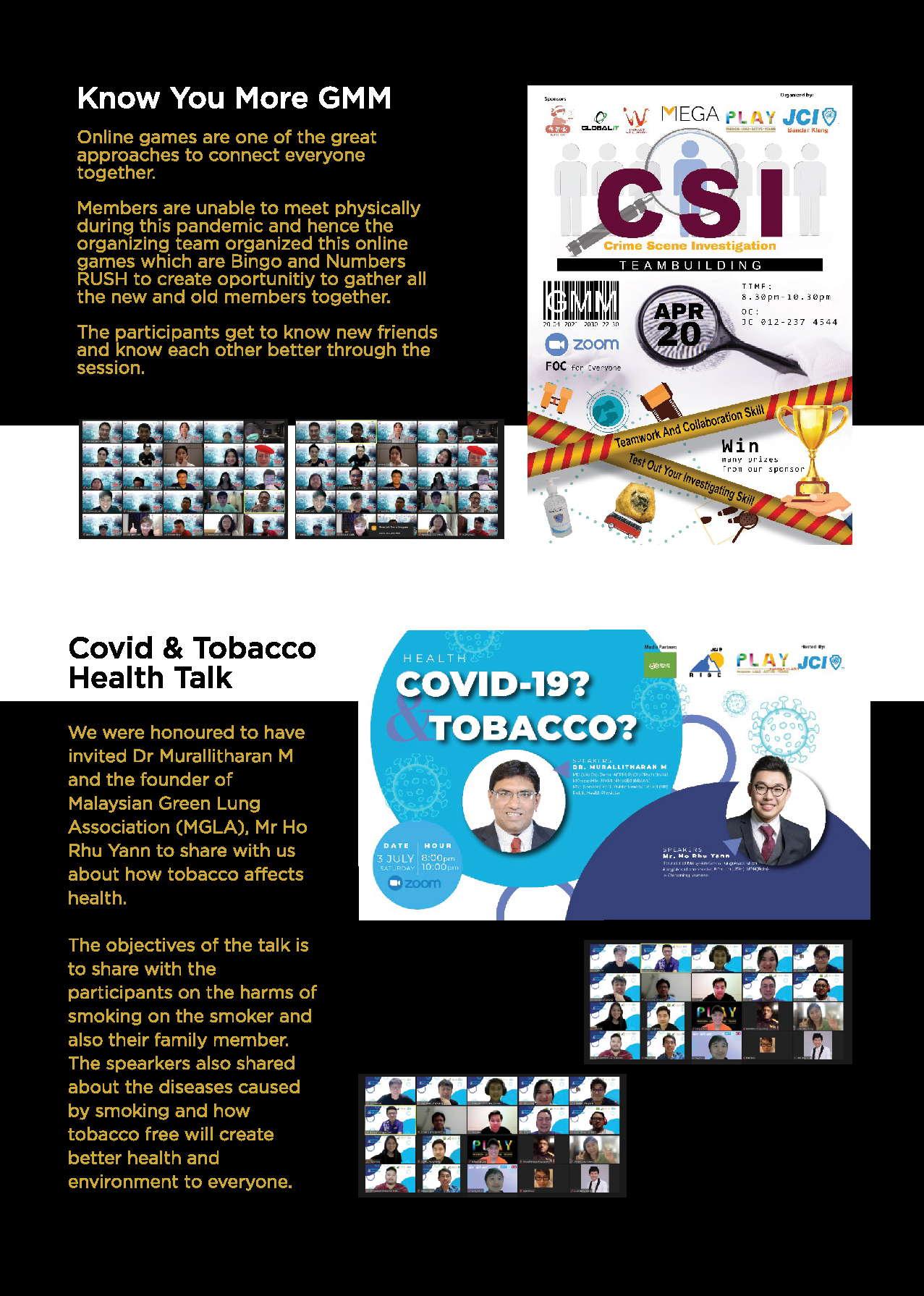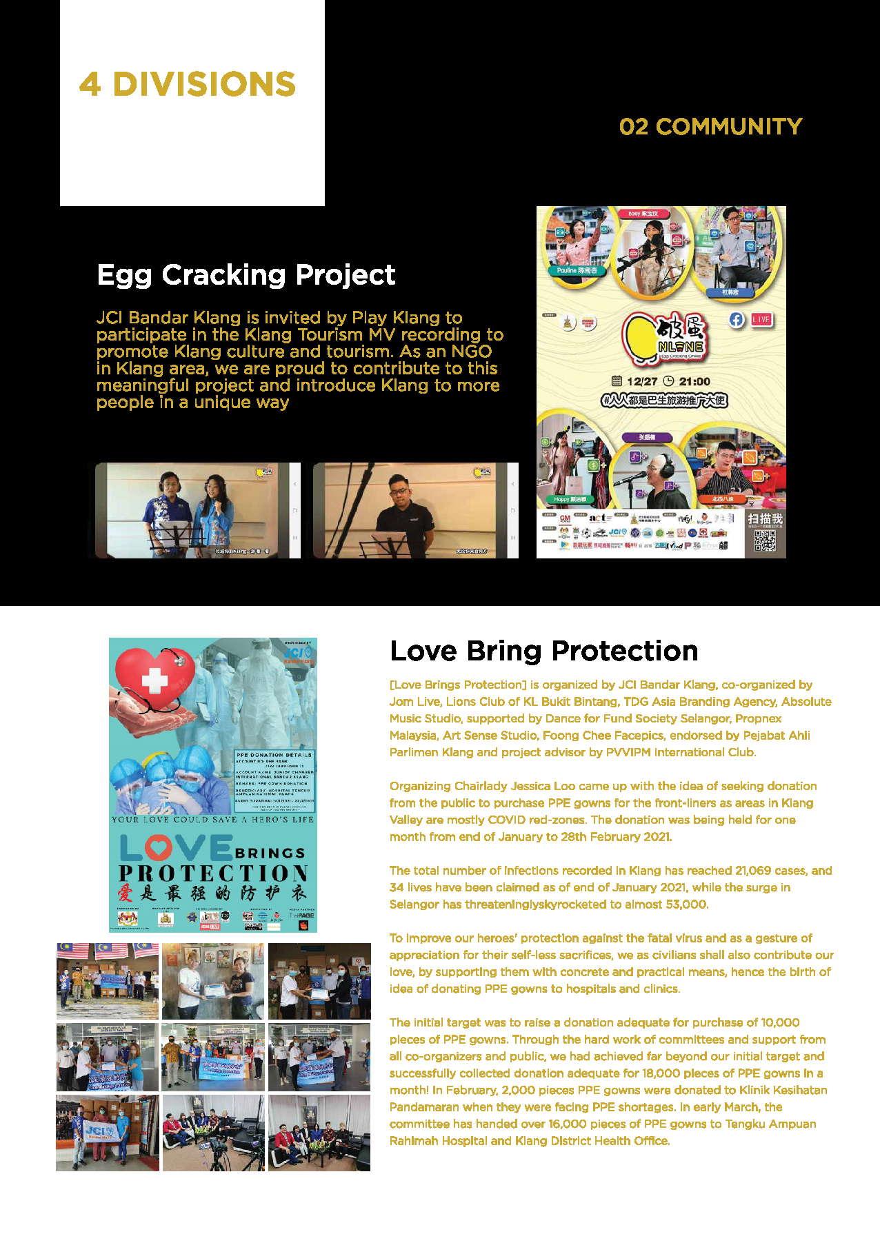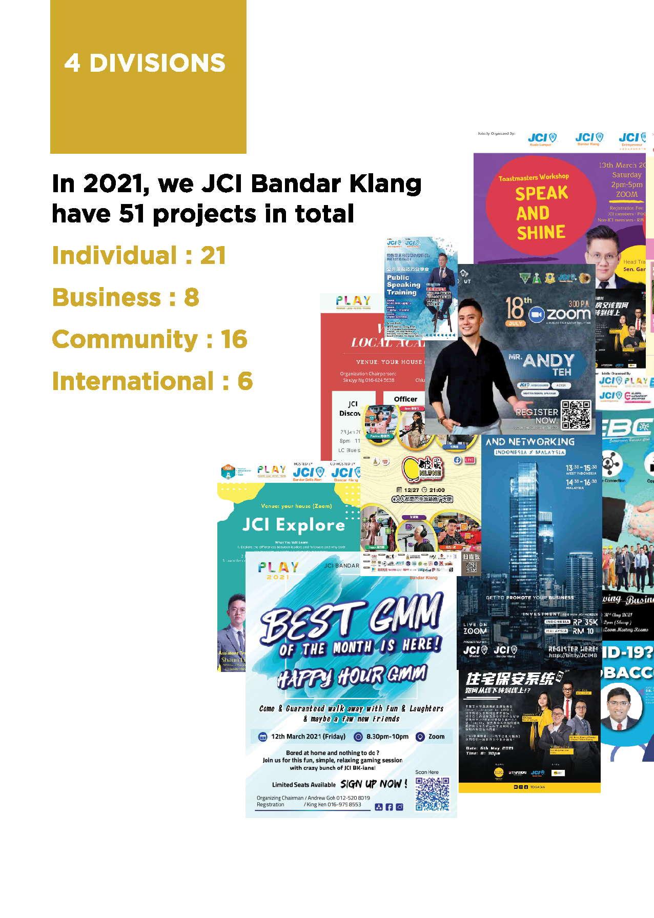 Thank you to all my PLAY team, especially the board of directors and Project Chairpersons who worked together hand in hand and showed your relentless effort in completing a year of service for our beloved organization. lt gives me great pride to be a leader of JCI Bandar Klang. Despite of the pandemic, JCI Bandar Klang managed to organize more than 50 meaningful, impactful & remarkable projects in 2021.