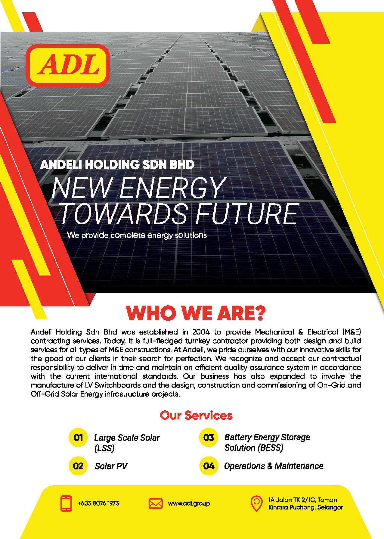 Andeli Holding Sdn Bhd wos estoblished in 2OO4 to provide Mechonicol & Electricol (M&E) controcting services. Todoy, it is full-fledged turnkey controctor providing both design ond build services for oll types of M&E constructions. At Andeli, we pride ourselves with our innovotive skills for the good of our clients in their seorch for periection. We recognize ond occept our @ntroctuol responsibility to deliver in time ond mointoin on efficient quolity ossuronce q6tem in occordonce with the current internotionol stondords. Our business hos olso exponded to involve the monufocture of LV Switchboords ond the design, construction ond commissioning of On-Grid ond Off-Grid Solor Energy infrostructure projects.
