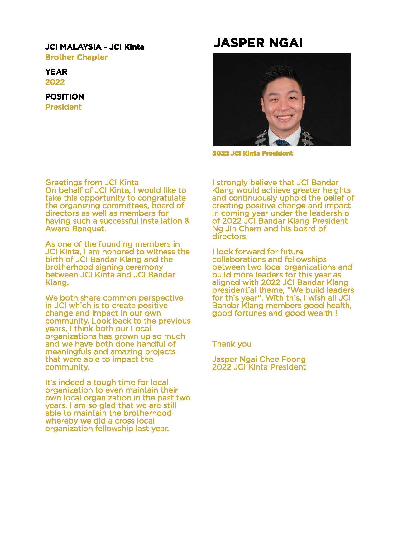 Last but not least, I wish and believe that JCI Bandar Klang would achieve a greater height under the leadership of President Ng Jin Chern and his board of directors in the year 2022.