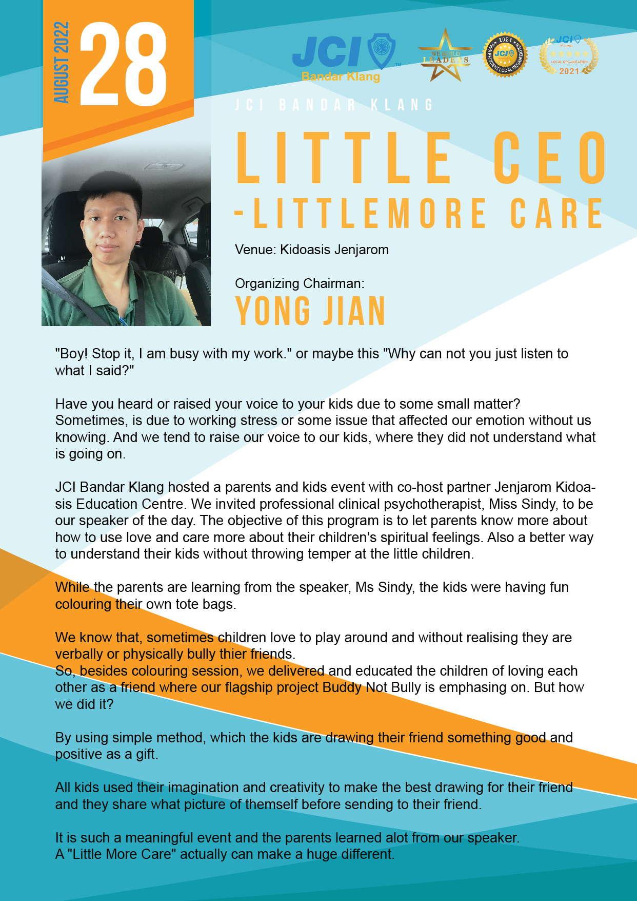 JCI Bandar Klang hosted a parents and kids event with co-host partner Jenjarom Kidoasis Education Centre. We invited professional clinical psychotherapist, l\4iss Sindy, to be our speaker of the day. The objective of this program is to let parents know more about how to use love and care more about their children's spiritual feelings. Also a better way to understand their kids without throwing temper at the little children.