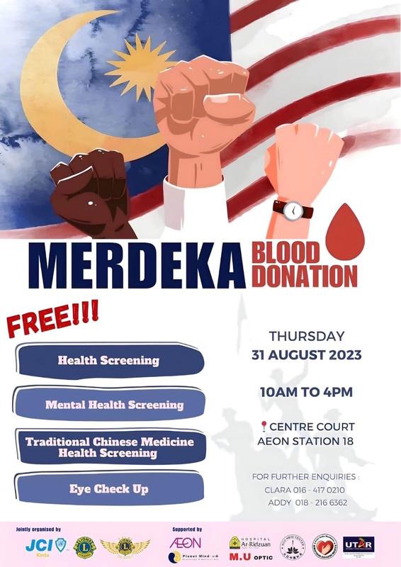 In the spirit of unity and giving back to the community, JCI Kinta proudly joined forces with the Lions Club of Ipoh Midtown to host a Merdeka Blood Donation Drive in conjunction with Malaysia's 66th Independence Day on 31st August 2023. This meaningful event took place at the Centre Court of Ipoh Aeon Station 18. We were honoured to have YB Goh See Hua as our esteemed Guest of Honour, gracing us with his presence and underscoring the importance of such community-driven initiatives.
