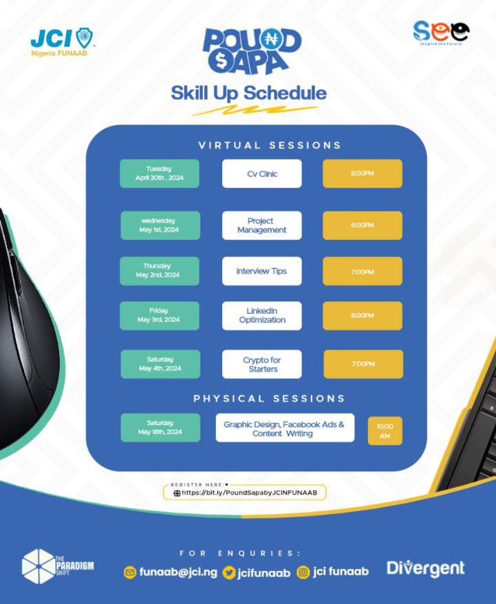 The major ac vity of the month on the local organiza on was week long virtual skill up webinar from the Directorate of Skills and Development themed ''POUND SAPA”. clarity of the subject of discourse.