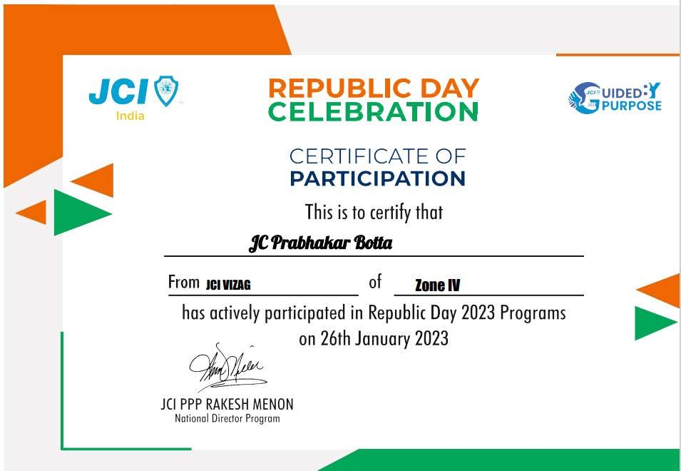 JCI Vizag received a certificate from National Director Programs, JCI PPP Rakesh Menon for participating in Republic Day 2023 Program on 26th January 2023.