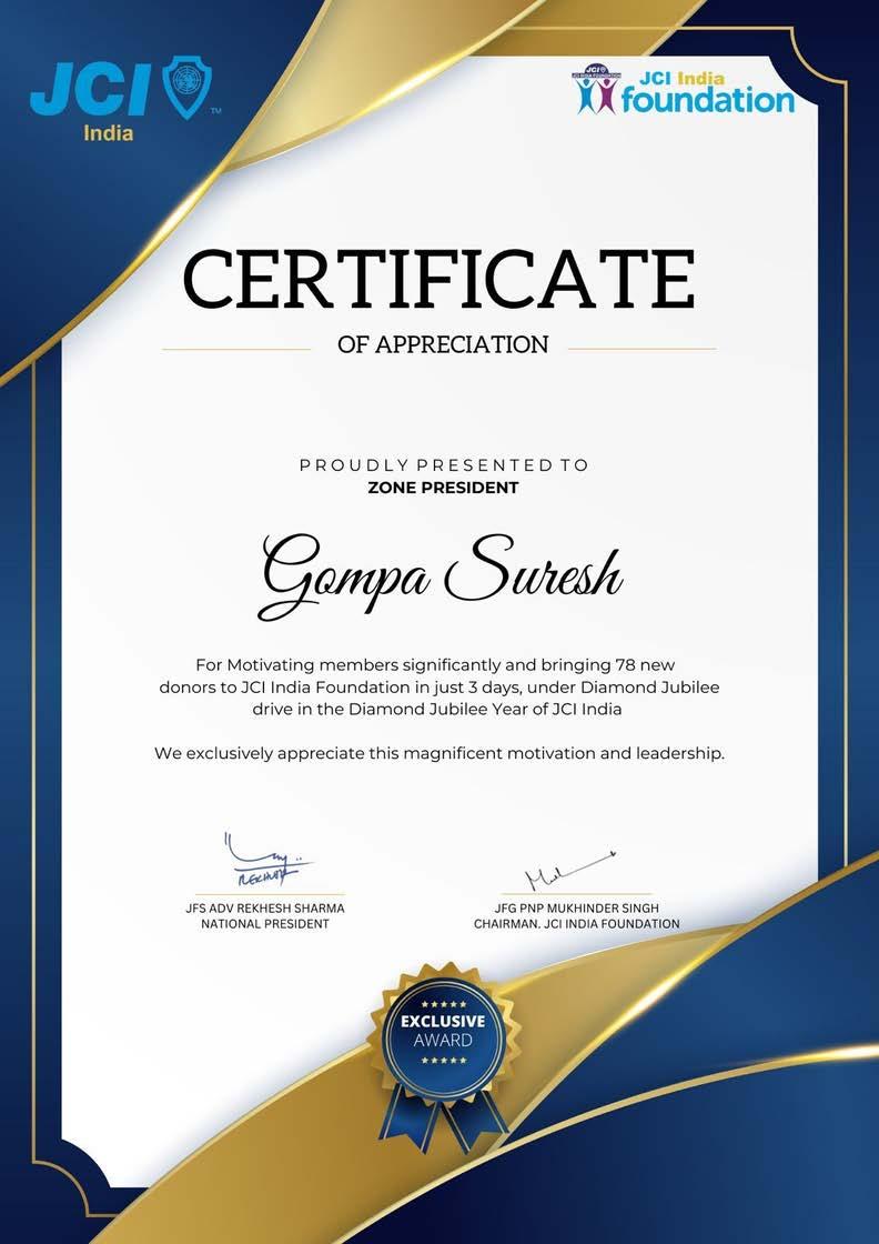 JCI Vizag has received a Certificate of Appreciation from JCI India for achieving Positive Membership Growth in2024.