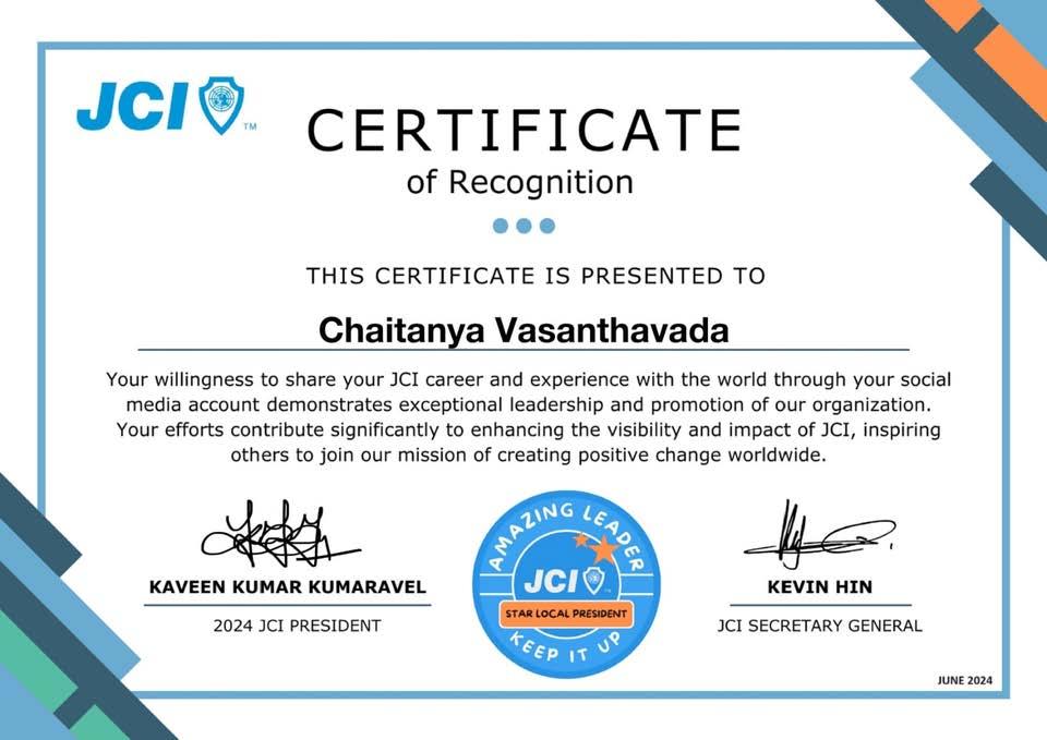 JCI Vizag president has received a certificate of recognition from JCI President Kaveen Kumar Kumaravel for his participation on Star President Program.