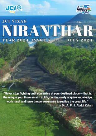 The EighthEdition ofJCIVizag‘smonthlybulletin NIRANTHAR givesyoua briefoverviewofthedifferentactivitiesdonebyJCIVizag,andvarious announcementsmadebyJCIIndiaandbyZoneIVinthemonthofJuly2024.