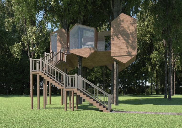 This treehouse is located in Skaneateles, New York, it is a short term rental treehouse intended for two people to spend time away in nature. The four rotated volumes create divisions of space with less need for physical walls for privacy. The pointed and angled bottoms are used to hide the structural supports attached to the trees, allowing for more protection of these components from the elements. The angled bottoms also allow for more storage within the treehouse which can be accessed via trap doors. The trees running through the treehouse are encased in glass to maintain a weathertight building, as well as being integrated into the building’s rainwater collection system. This project was completed as a group with Audrey Delia and Monica Yee, in which I contributed to the design and created the diagrams and renderings.