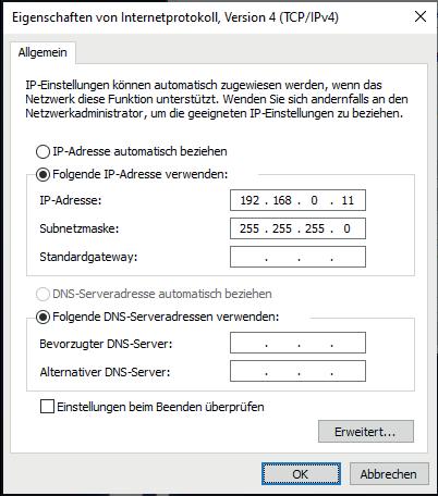 Anschließend verbinden Sie Ihren PC mit dem Controller. Zur Verbindungsherstellung muss der verwendete PC über das Netzwerkkabel mit dem Controller verbunden werden. Außerdem müssen sich beide Geräte im selben IP-Raum befinden.