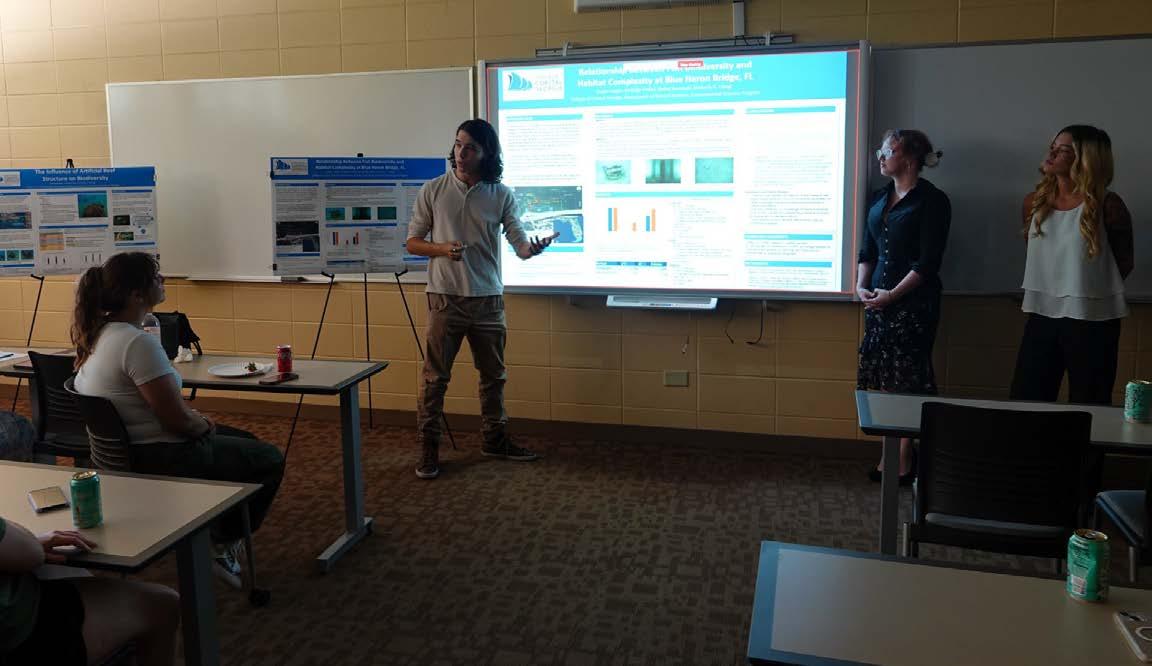 e Blue Heron Bridge, located in Riviera Beach, Florida, is one of the most popular dive and snorkel sites, known for its exciting underwater experience featuring arti cial reefs and diverse marine life. e College of Coastal Georgia took advantage of this exceptional location to o er students a unique, hands-on opportunity to research marine life through a new summer course—scienti c diving. In this course, students learned how to conduct research dives and later presented their projects at the College’s rst Scienti c Diving Research Poster Presentation.