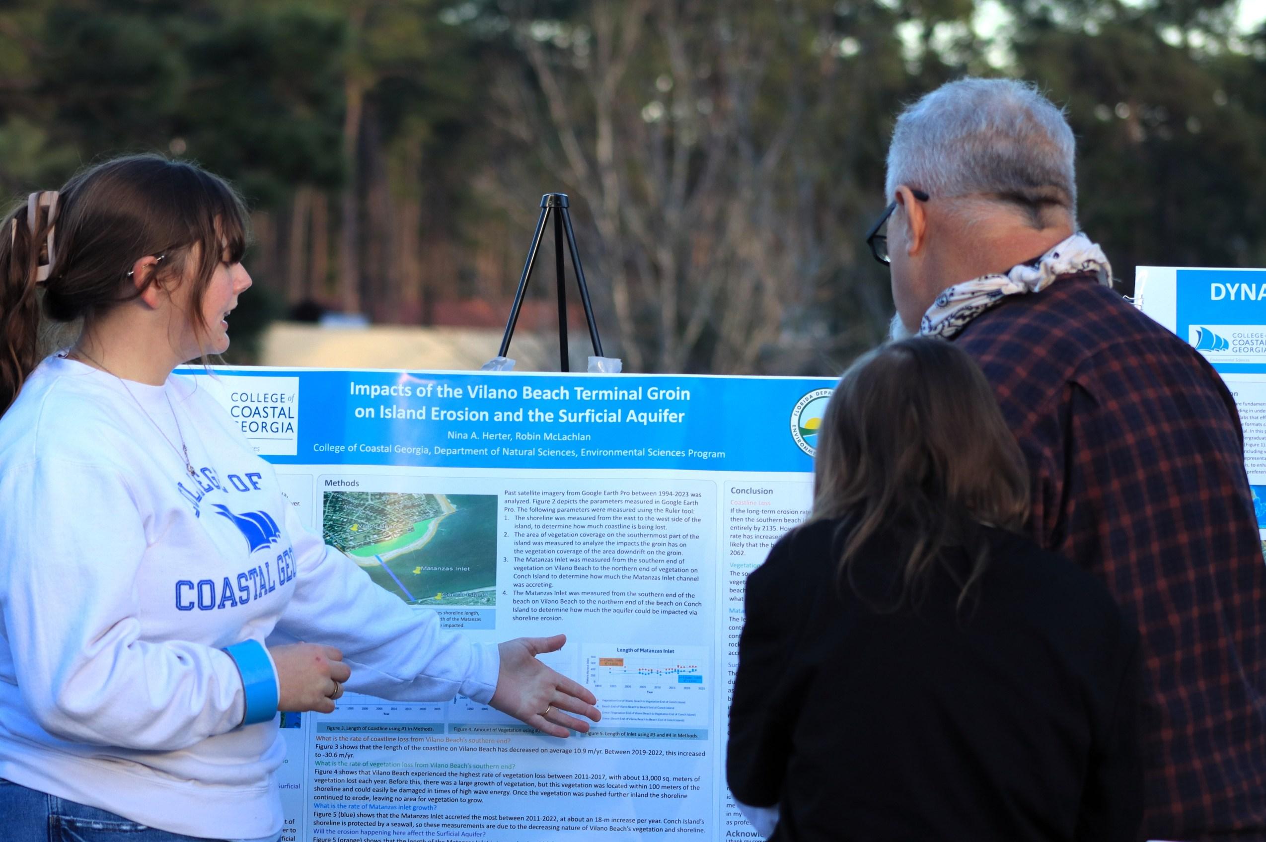 Student Nina Herter presents her research to community members at Salty’s Shrimp Boil & Shanties on the Roof event.