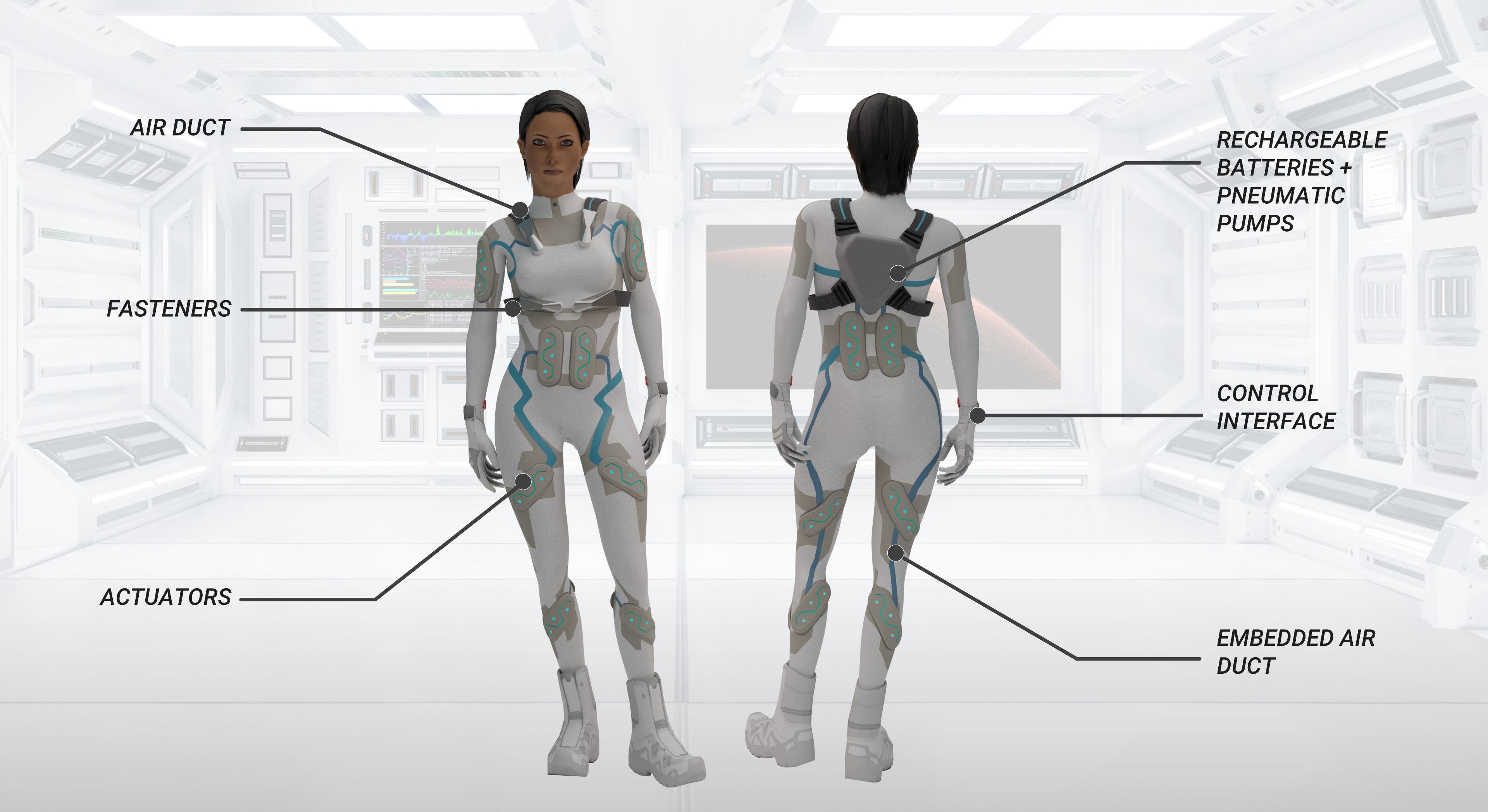 THE BIO-SOFT SUIT HAS AN IMPORTANT POLITICAL ROLE, AS A WAY OF ACTIVISM, RELYING ON THE COLLECTIVE POWER OF INDIVIDUALS: THE CREW MEMBERS, TO MAKE THINGS RIGHT IN TERMS OF HUMAN IMPACT OVER NATURE, REFLECTED ON THEIR ENERGY AND WATER CONSUMPTION, AND CARBON FOOTPRINT. THE SUIT’S LIGHTS CAN HELP THE CREW EXPERIENCE A SENSE OF COMMUNITY; IF A COLLECTIVE