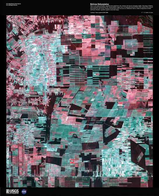 17 Bolivian DeforestationOnce a vast carpet of healthy vegetation, the Amazon rainforest is changing rapidly. This image of Bolivia shows dramatic deforestation in the Amazon Basin. Loggers have cut long paths into the forest, while ranchers have cleared large blocks for their herds. Fanning out from these clearcut areas are settlements built in radial arrangements of fields and farms. Healthy vegetation appears bright red in this image.
