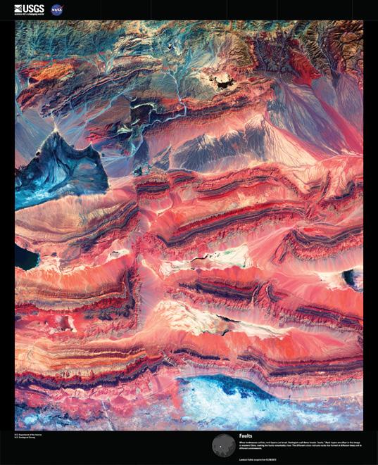 1 Faults - When landmasses collide, rock layers can break. Geologists call these breaks “faults.” Rock layers are offset in this image in western China, making the faults remarkably clear. The different colors indicate rocks that formed at different times and in different environments.