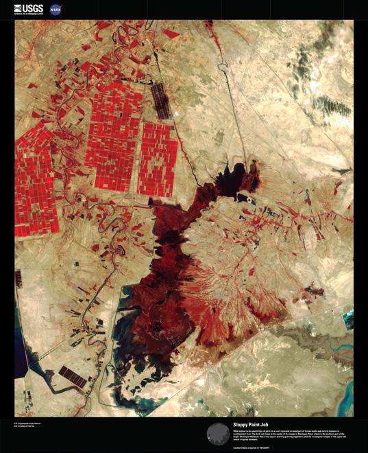 8 What appears to be smatterings of paint on a wall represents an amalgam of human-made and natural features in southwestern Iran. The dark red shape in the center of the image is Shadegan Pond, which is the northern part of the larger Shadegan Wetlands. Red areas depict actively growing vegetation, and the rectangular shapes in the upper left reveal irrigated farmland.