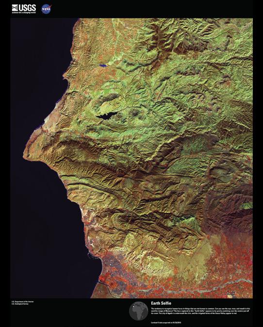 19 Earth Selfie - The tendency to recognize human faces in things that are not human is common. Can you see the eye, nose, and mouth in this satellite image of Morocco? The face captured in this “Earth Selfie” appears to be quietly watching over the waters just off its coast. The city of Agadir is underneath the chin, and the irrigated farms of the Souss Valley appear in red.