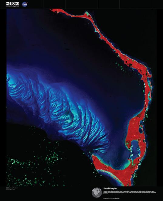 7 Shoal Complex - The main feature here, near Eleuthera Island in the Bahamas, is the Schooner Cays shoal complex. The tidal sand ridges, parabolic bars, and intervening channels explode in a blue rhythm. The Bahamas have the third most extensive coral reef in the world.