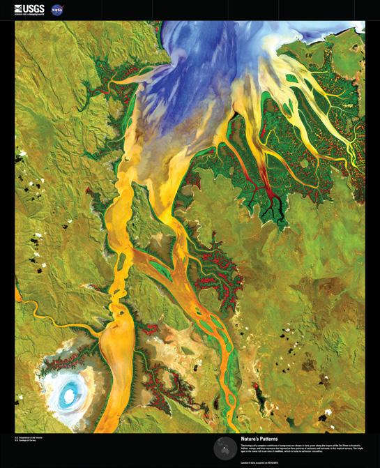 4 Nature’s PatternsThe biologically complex conditions of mangroves are shown in dark green along the fingers of the Ord River in Australia. Yellow, orange, and blue represent the impressive flow patterns of sediment and nutrients in this tropical estuary. The bright spot at the lower left is an area of mudflats, which is home to saltwater crocodiles.