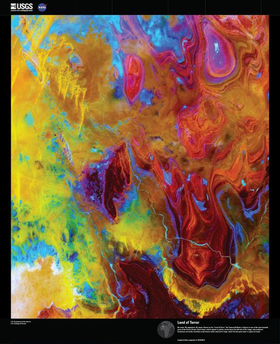3 Land Of Terror - No Water. No vegetation. No oases. Known as the “Land of Terror,” the Tanezrouft Basin in Algeria is one of the most desolate parts of the Sahara Desert. Sand dunes, which appear in yellow, streak down the left side of the image, and sandstone formations carved by relentless wind erosion make concentric loops, much like the grain seen in a piece of wood.