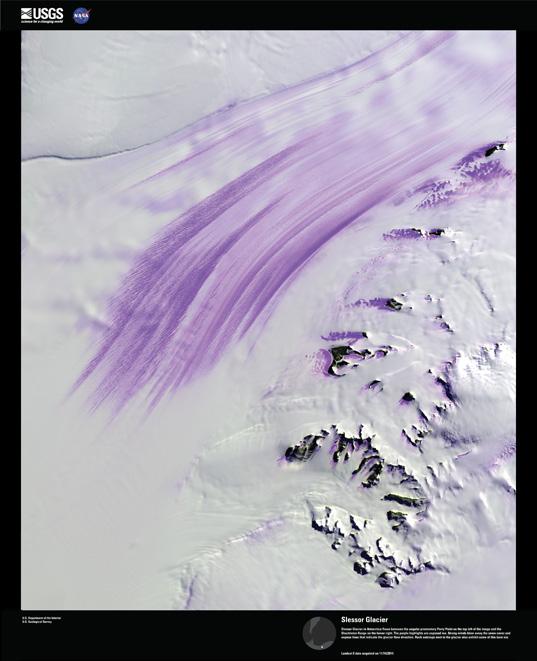 13 Slessor Glacier in Antarctica flows between the angular promontory Parry Point on the top left of the image and the Shackleton Range on the lower right. The purple highlights are exposed ice. Strong winds blow away the snow cover and expose lines that indicate the glacier flow direction. Rock outcrops next to the glacier also exhibit some of this bare ice.