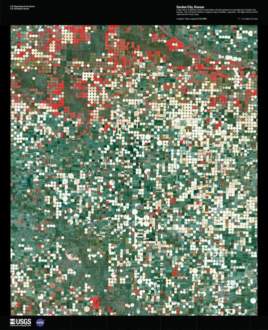 11 Garden City, KansasCenter pivot irrigation systems created these circular patterns in cropland near Garden City, Kansas. The red circles indicate irrigated crops of healthy vegetation. The light-colored circles represent harvested crops.