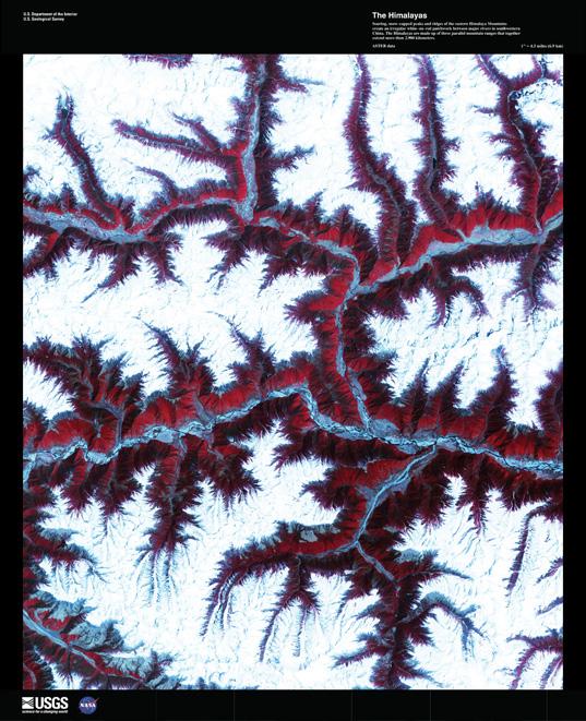 14 Himalayas - Soaring, snow-capped peaks and ridges of the eastern Himalaya Mountains create an irregular white-on-red patchwork between major rivers in southwestern China. The Himalayas are made up of three parallel mountain ranges that together extend more than 2,900 kilometers.