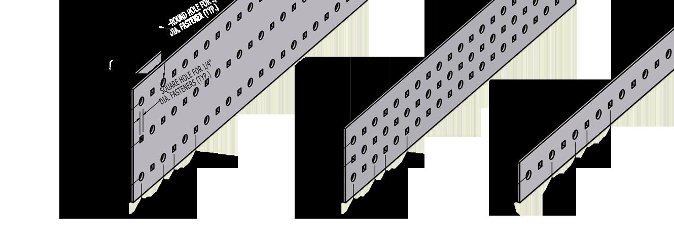 TUBETRACK® standard flat sections are available in 4 corrosionresistant metals and 3 widths. TUBETRACK® components are factory inspected for quality of fabrication detail, finish, straightness, and appearance. Flat details are shown for standard size, part numbers, materials, widths, lengths, and gages.