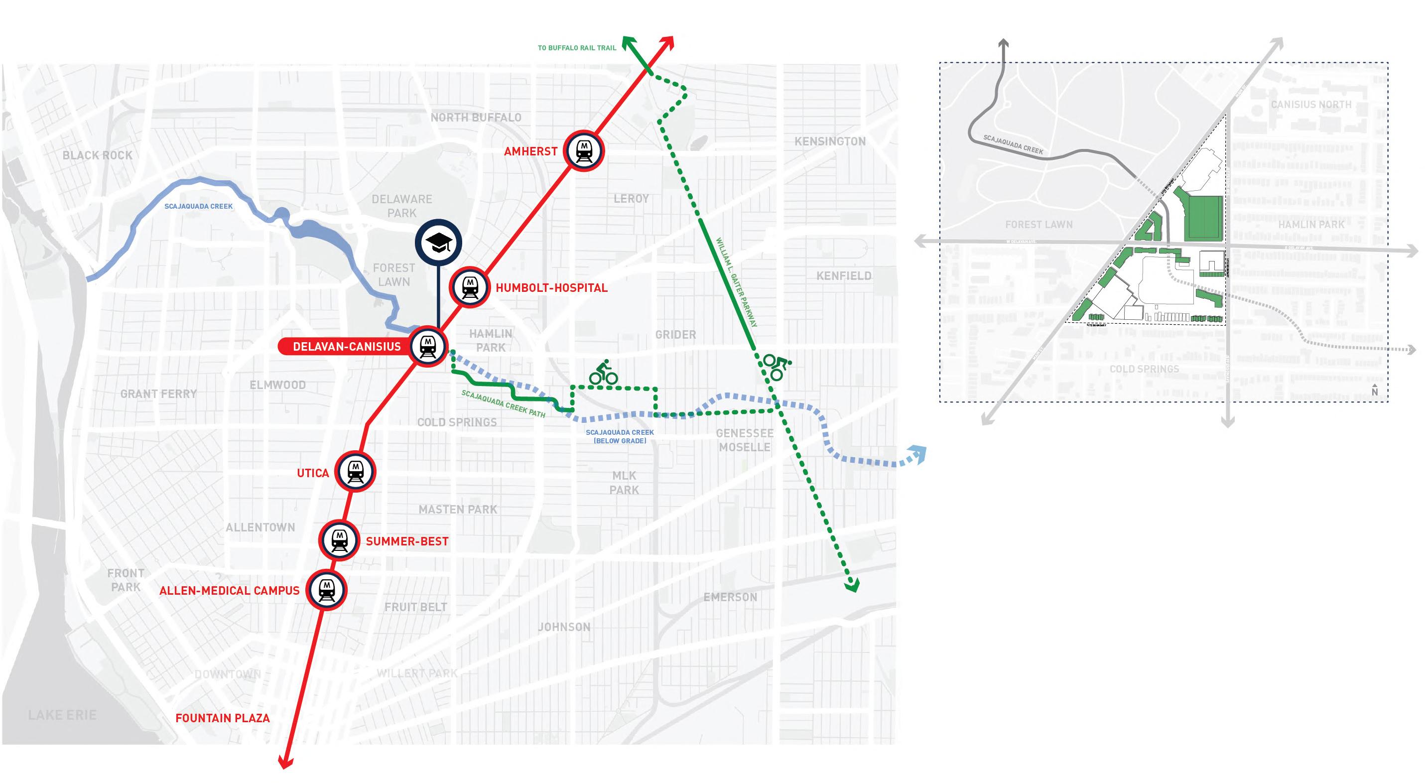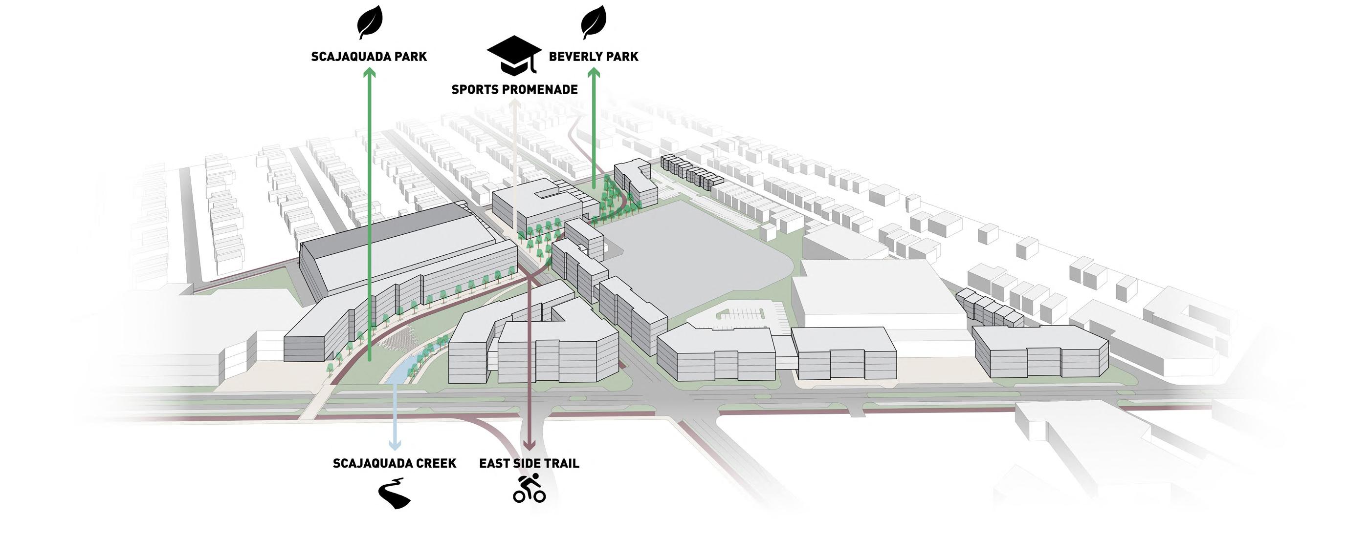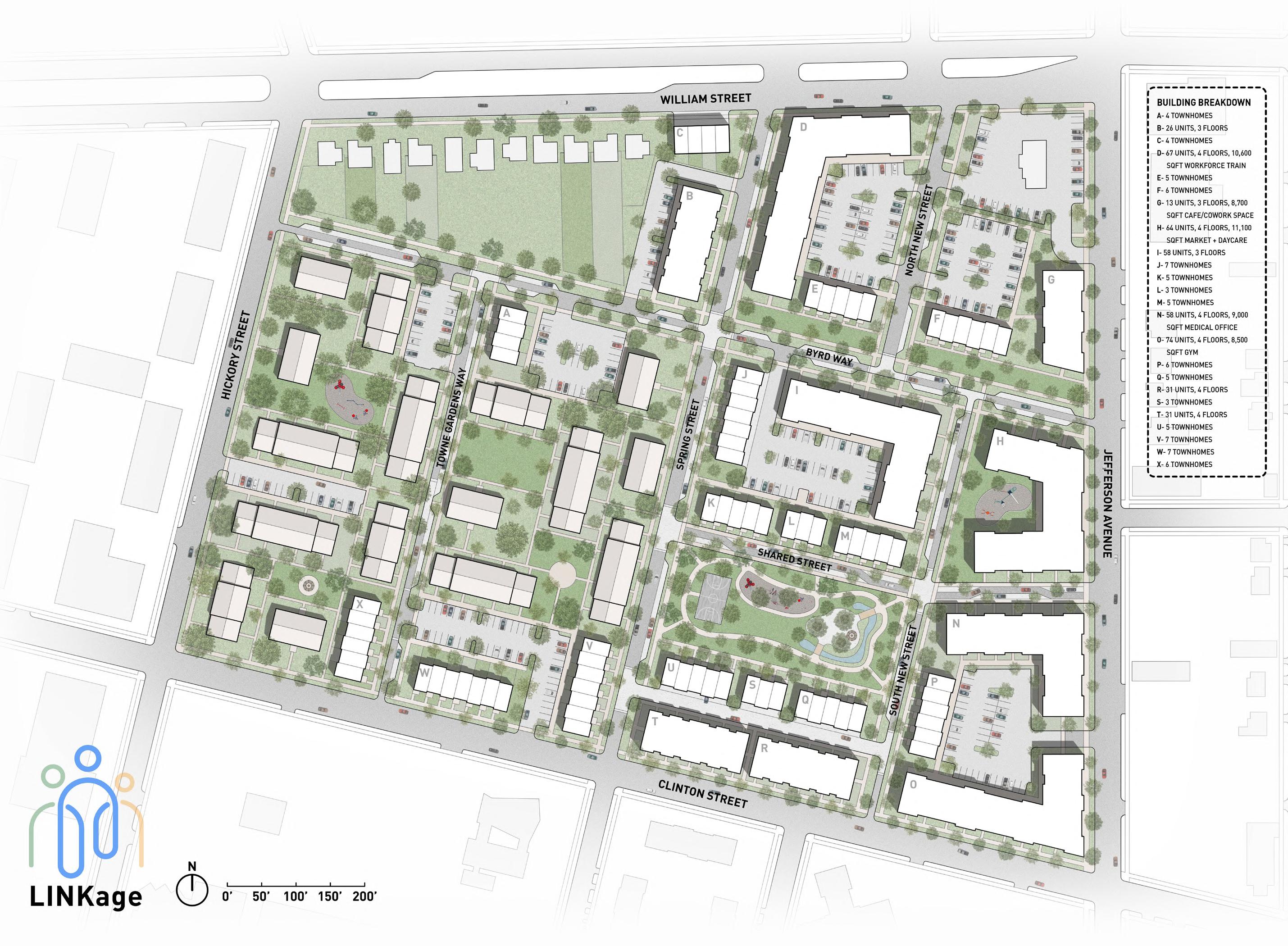 Towne Gardens, owned by BFC Partners, is an existing apartment complex in Buffalo, NY. The company is exploring options to update the site to become a more inclusive and affordable housing development. LINKage is envisioned as a sociable age in place neighborhood that connects residents of all ages and income. The mixed use development encourages residents to grow within the community based on the services and convenience of program location. By reconnecting the missing links such as a healthcare clinic, co-working space, daycare, fresh food market, a gym, and workforce training center, and many housing options, the resources will help improve the quality of life for all residents.