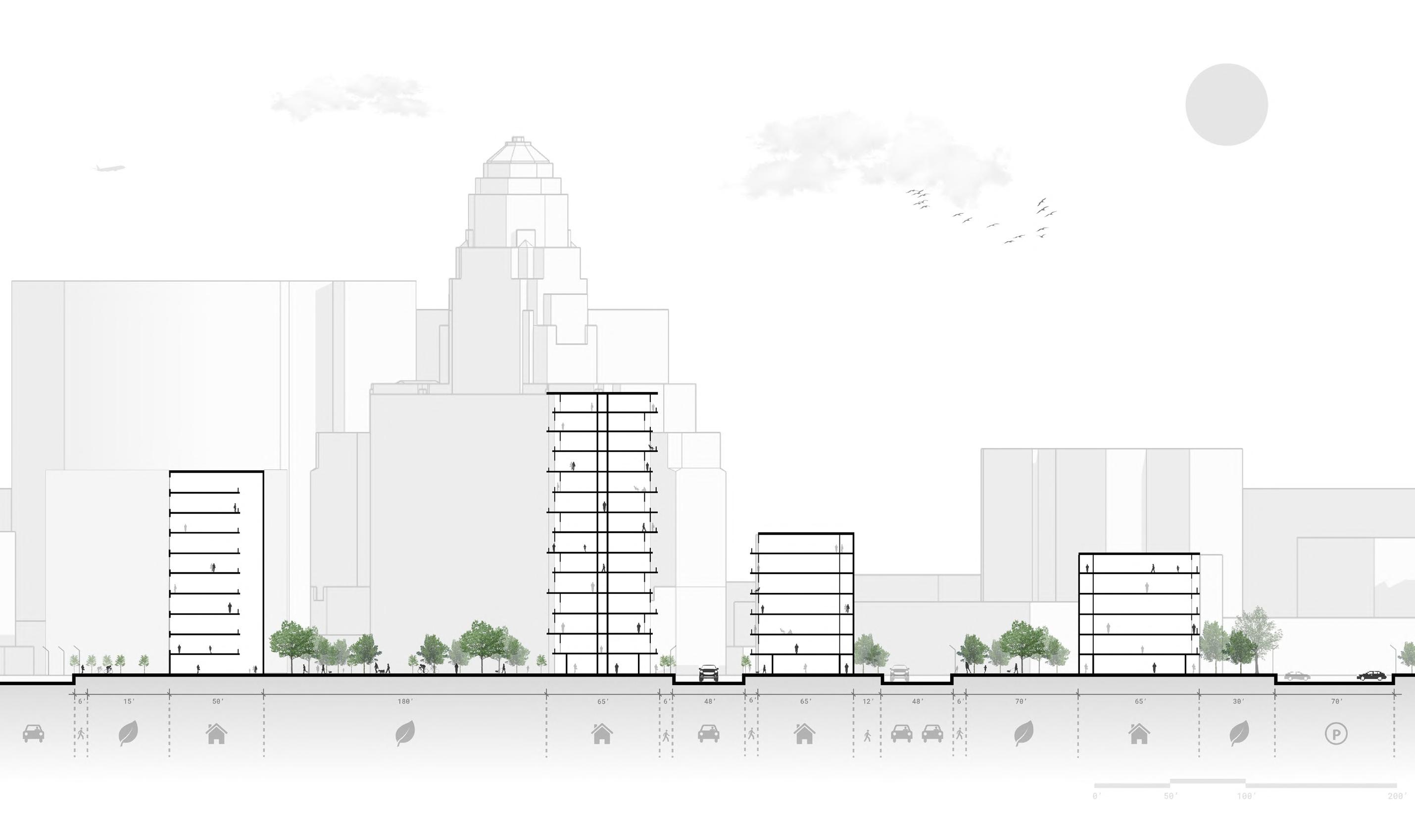 Site section facing Buffalo City Hall revealing streetscape and mixed use building interiors
