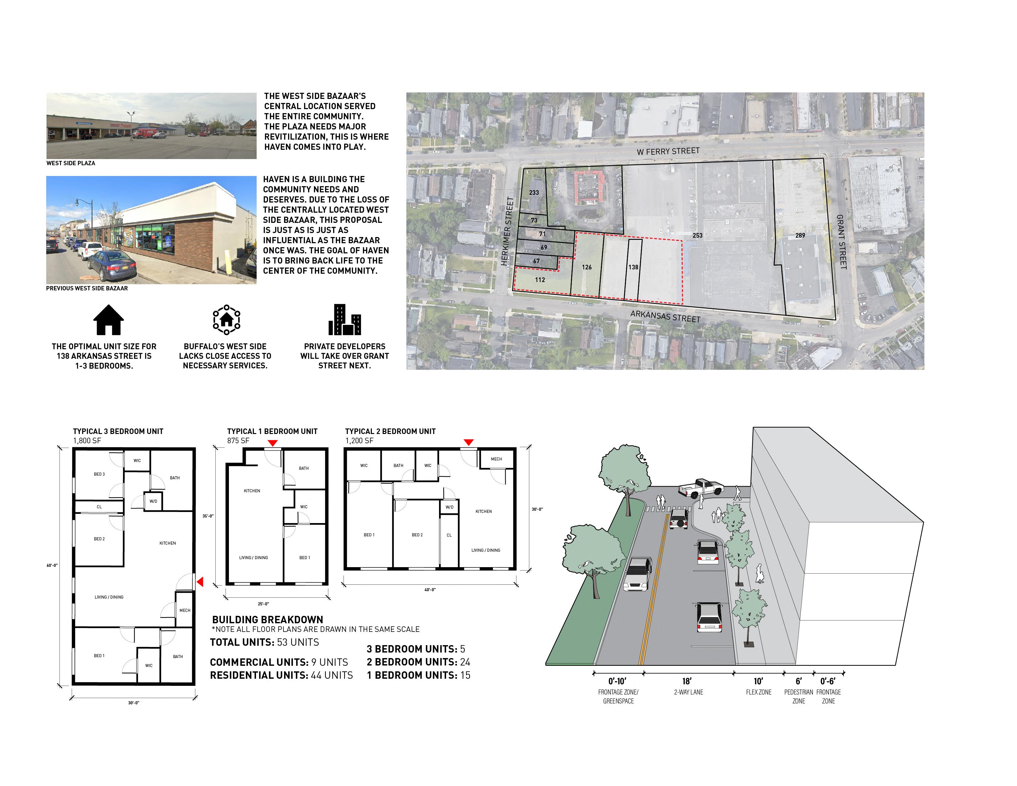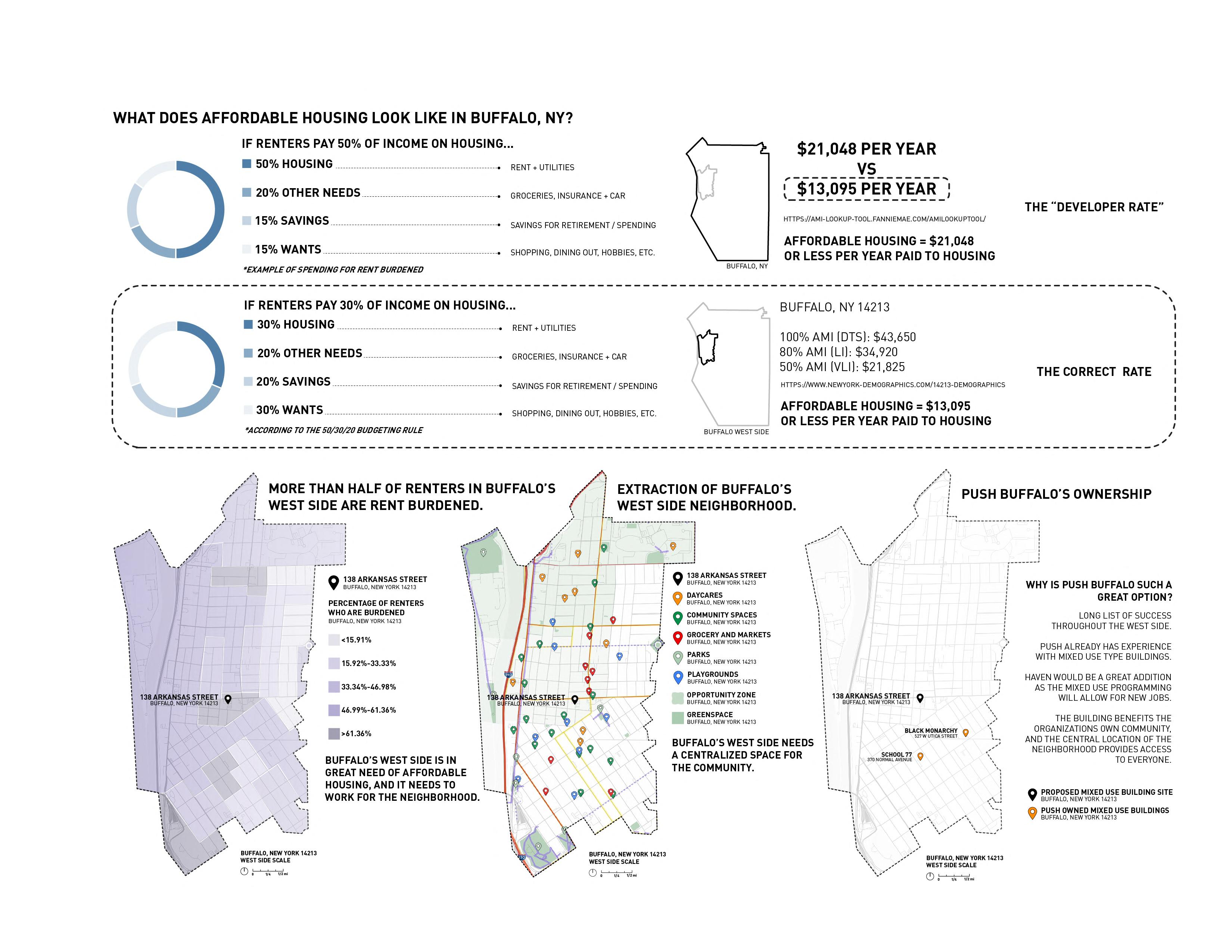 Banham Fellow Maya Porath is an architectural designer, educator, and organizer. The 2023 POWER Studio interrogates the political and economic structure of Buffalo’s built environment. We started by exploring and mapping multiple scales of real estate ownership in Buffalo ranging from individuals to development empires. The studio then shifted to studying policies, funding, ownership models, production, and the construction process. The final project of the studio was a culmination of our research; an intervention method of our choice to better the neighborhood. Rent in Buffalo is too expensive leaving more than 50% of renters overburdened. Constructing a mixed use building will provide affordable housing, commercial programming in the center of the neighborhood, and jobs for residents of the west side. Haven is a need, not a want. 04