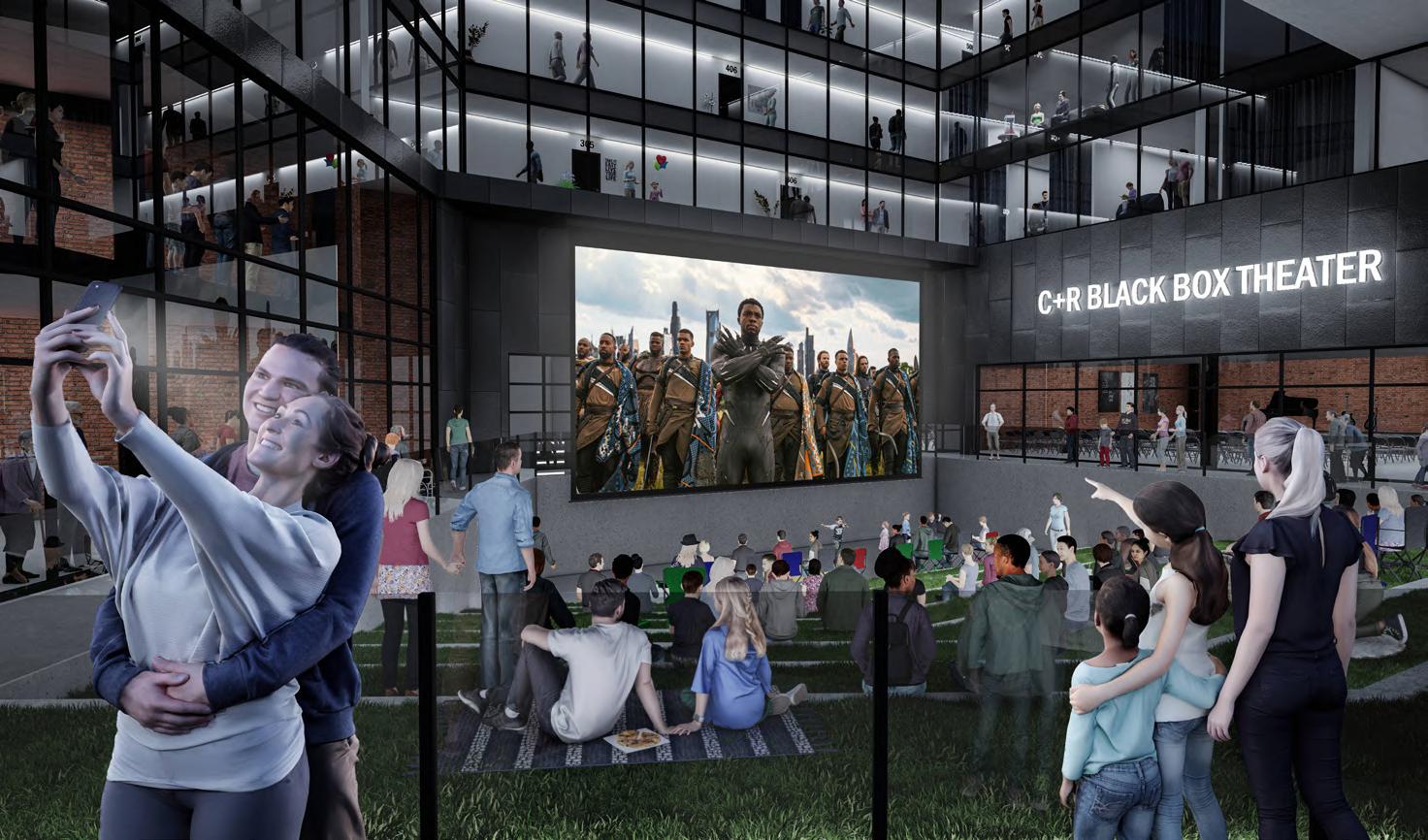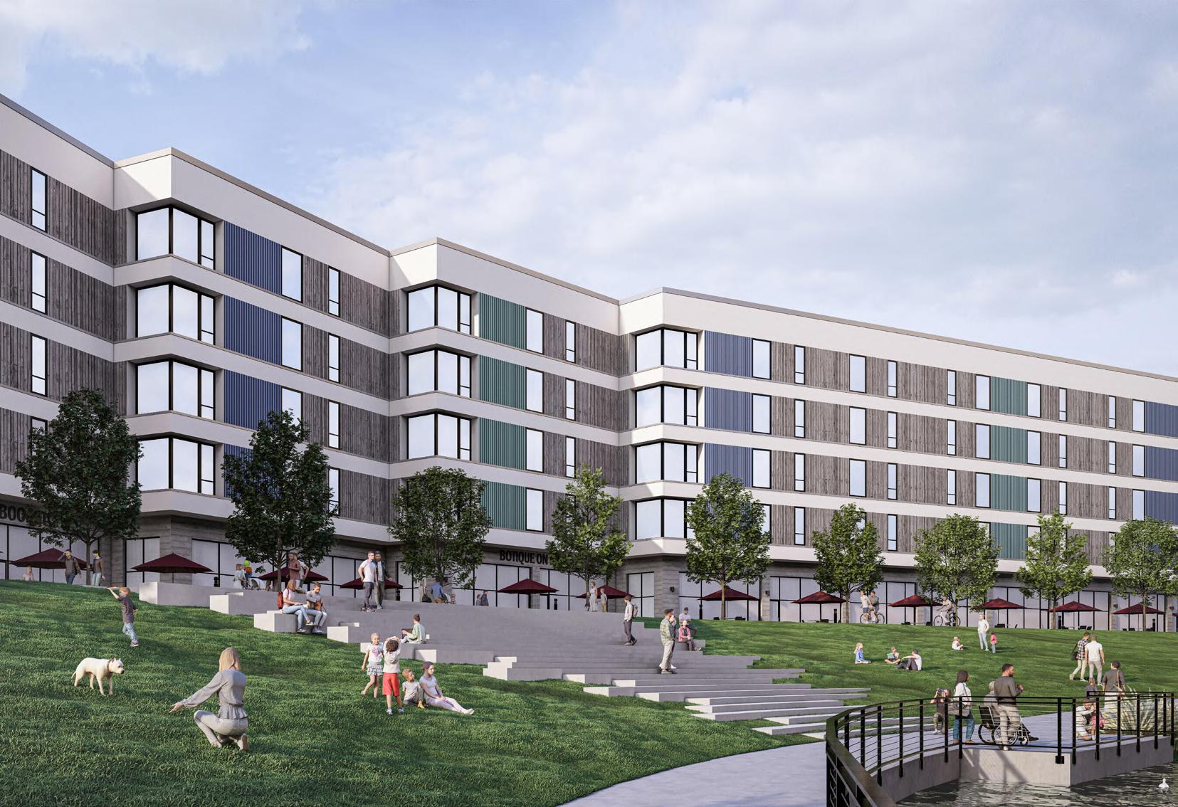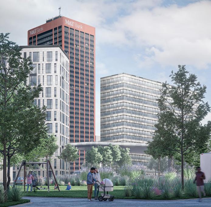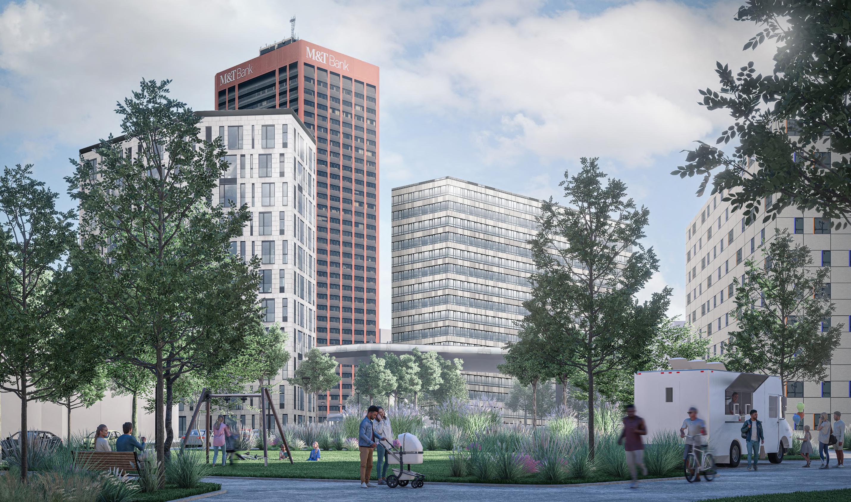 Rendering from the greenscaped terrace facing the existing M&T Tech HUB, the proposed tech HUB, and the elevated viewing platform