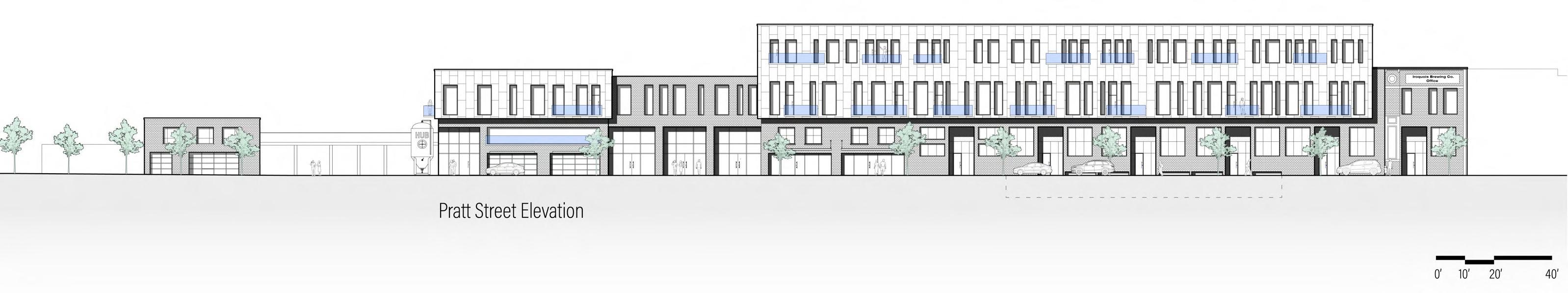 230 Pratt Street elevation showing the new build brew house [left], and adaptive reuse design [right]