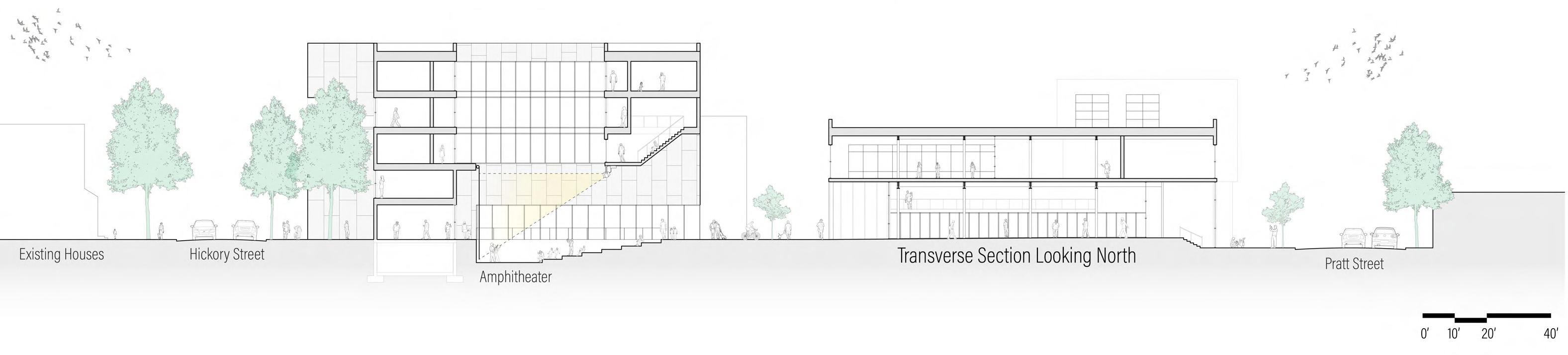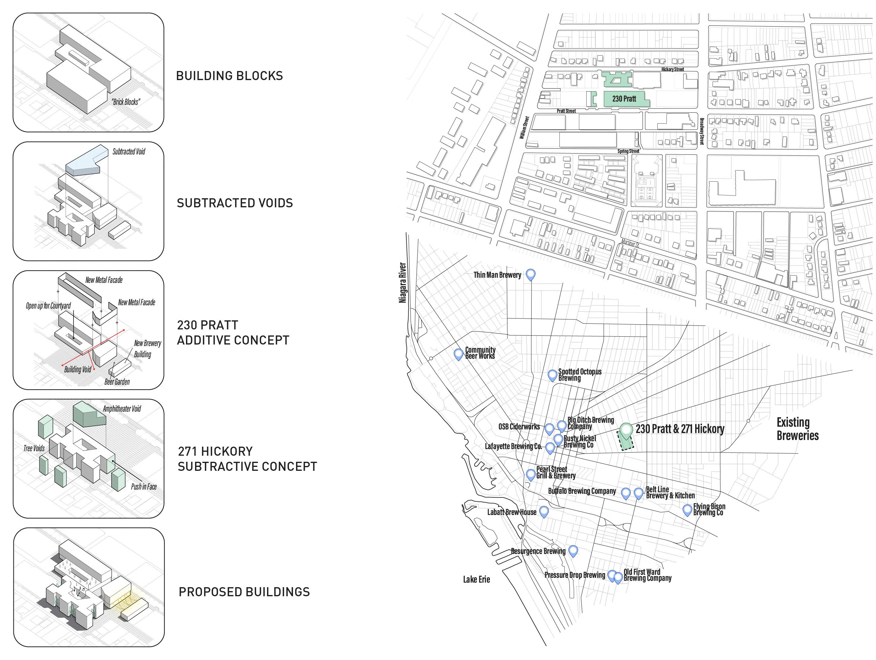 HUB is an acronym for Housing. Unity. Brewing. Historically, 230 Pratt Street was known as the Iroquois Brewing Company,. so we decided to reintegrate a Brewery into our design as we believe they are cross generational and can be a great start at developing a community. Breweries are extremely popular in Buffalo, and the atmosphere that they bring is the main reason for their rising popularity. Across the piazza is 271 Hickory, a new build proposal built around an amphitheater which is linked to 230 Pratt Street through a subtractive process. This subtracted process allows for cut-in balconies along the facade, the preservation of large trees on the site, and added privacy for surrounding neighbors while allowing natural light into the units.