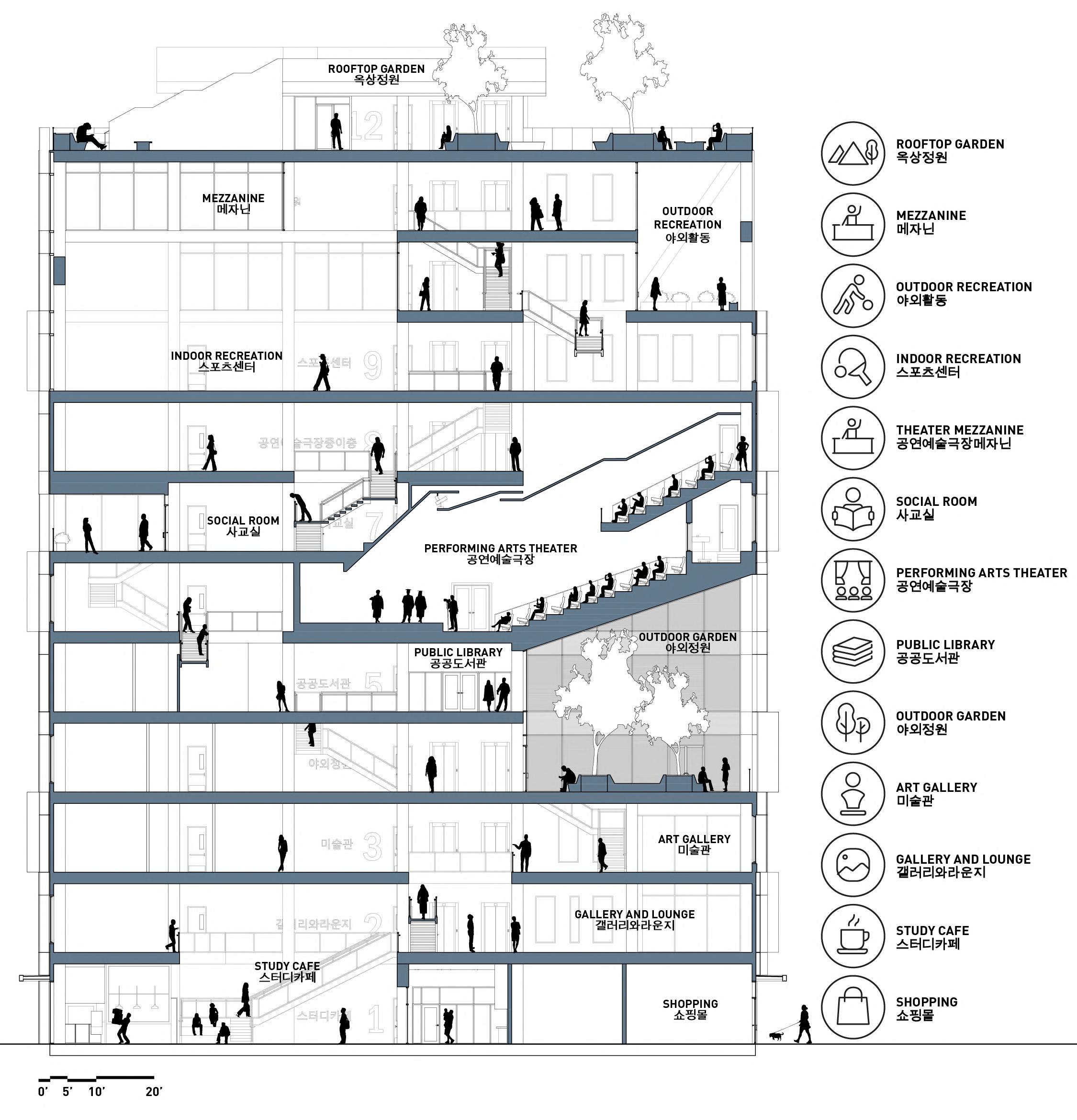 HUB [Housing, Unity, Brewing] site section revealing the amphitheater design [left] and brew house [right]