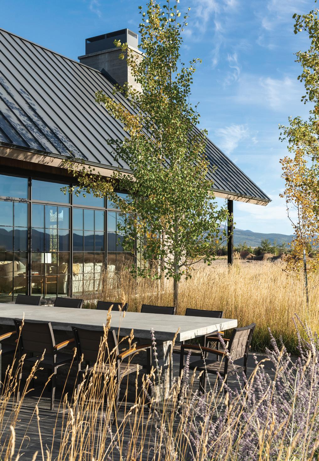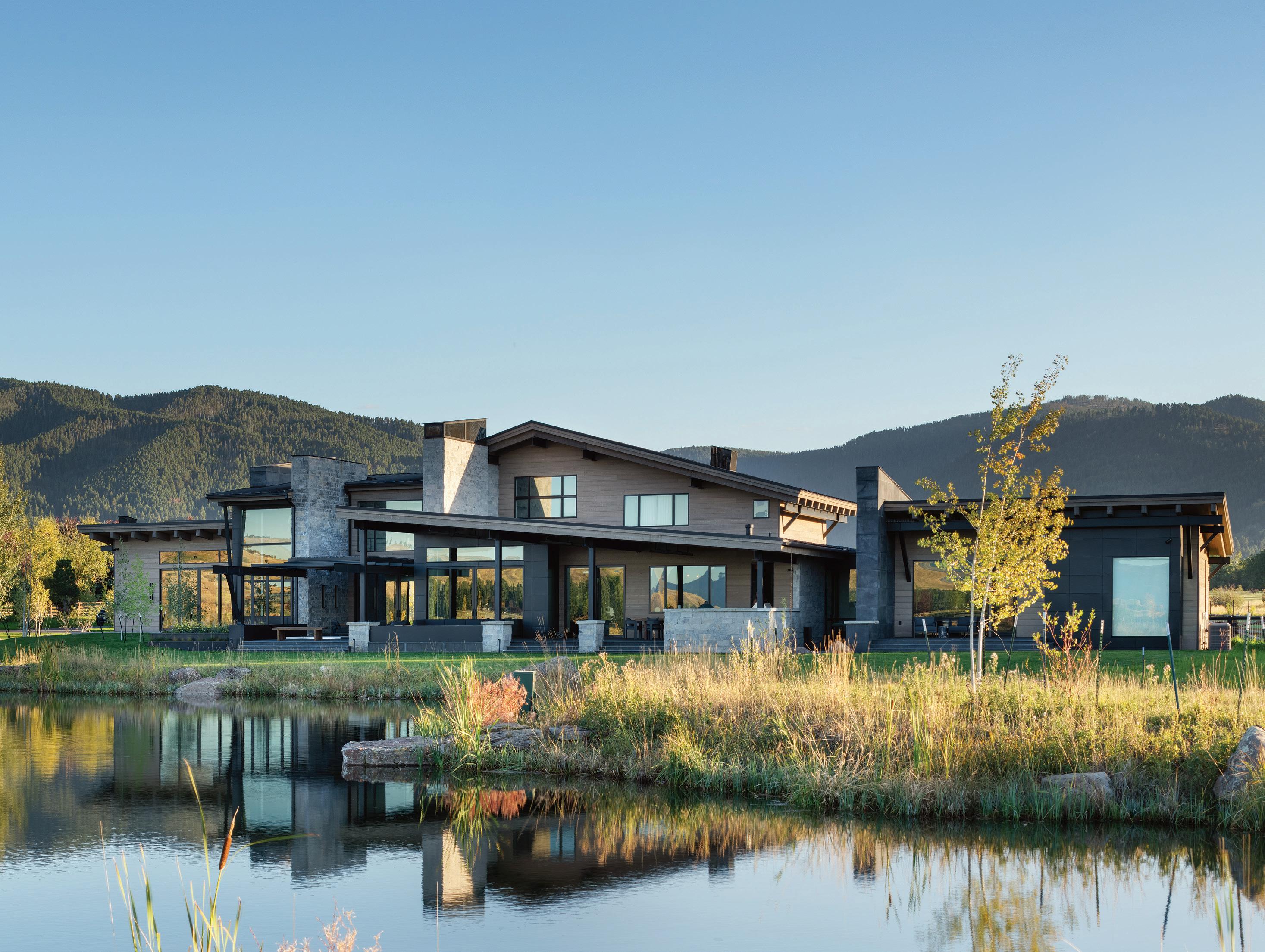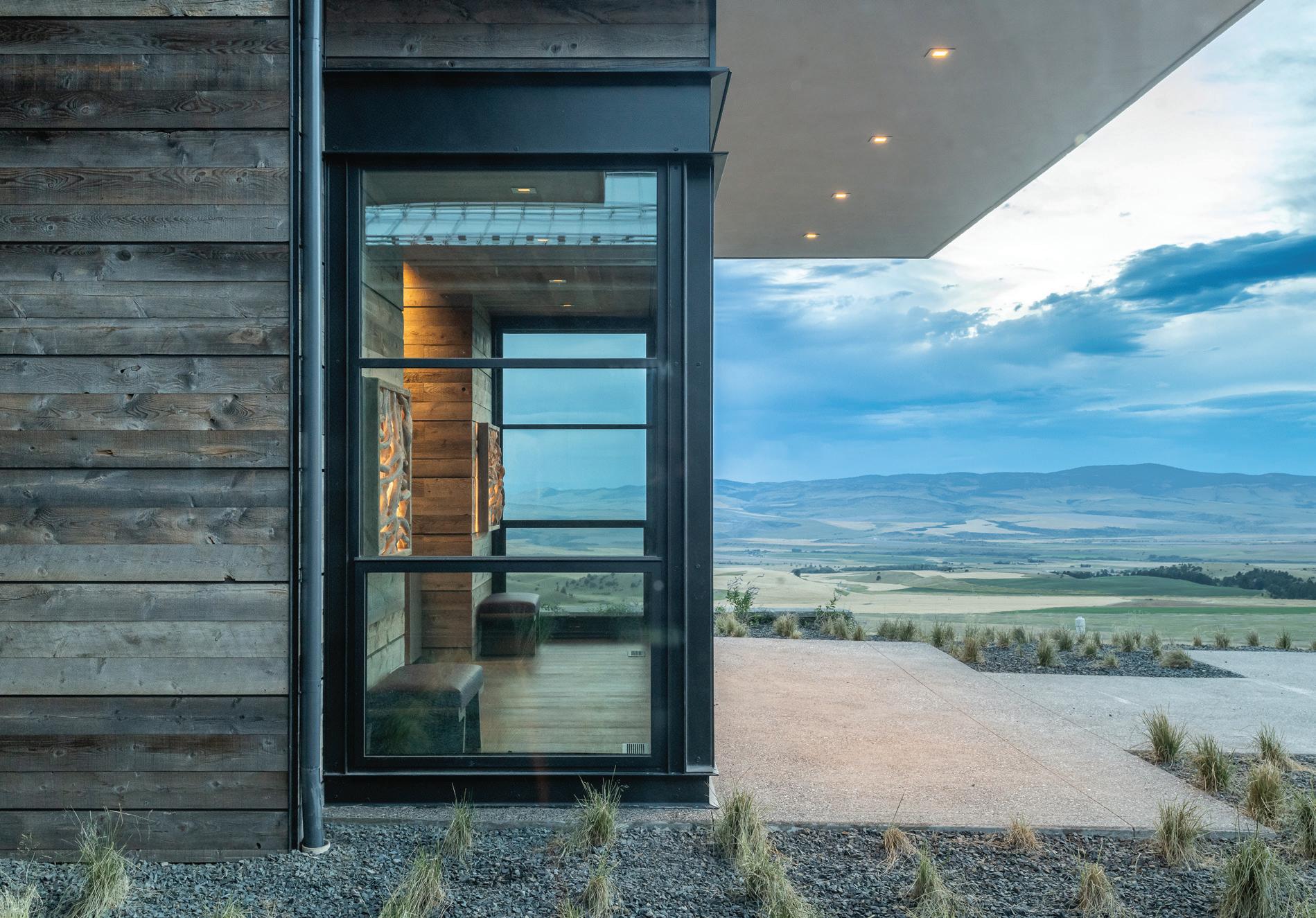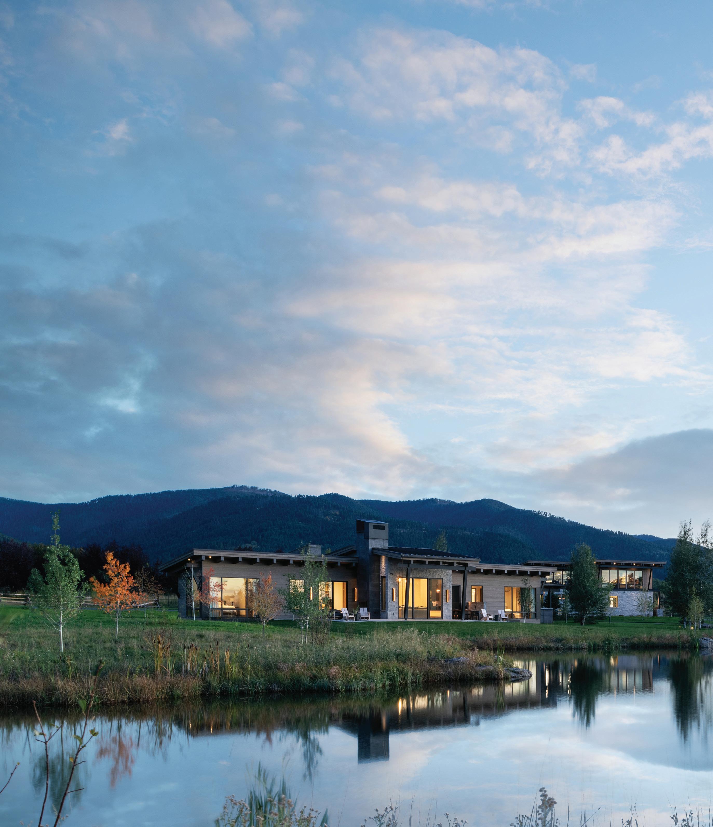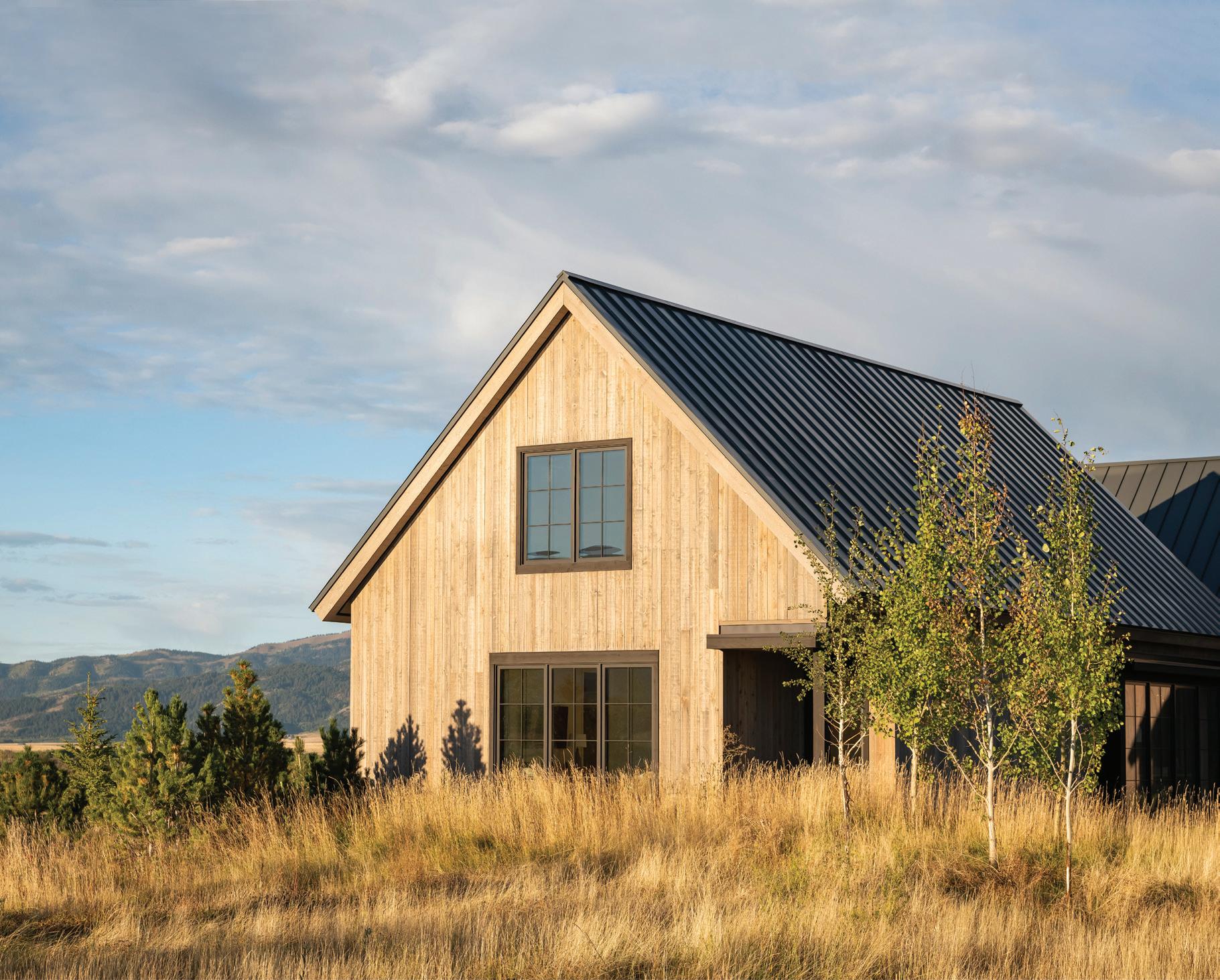 “The northwest-facing home has incredible views to the west, some Teton views to the north, and looks over ranchland that is in a protected agricultural conservation easement, so there will not be future development,” says principal architect Jamie Farmer of Farmer Payne Architects. “Its Westerncontemporary style is a mix of traditional gable forms, timeless materials, clean-lined modern glass walls, and steel trusses.”
