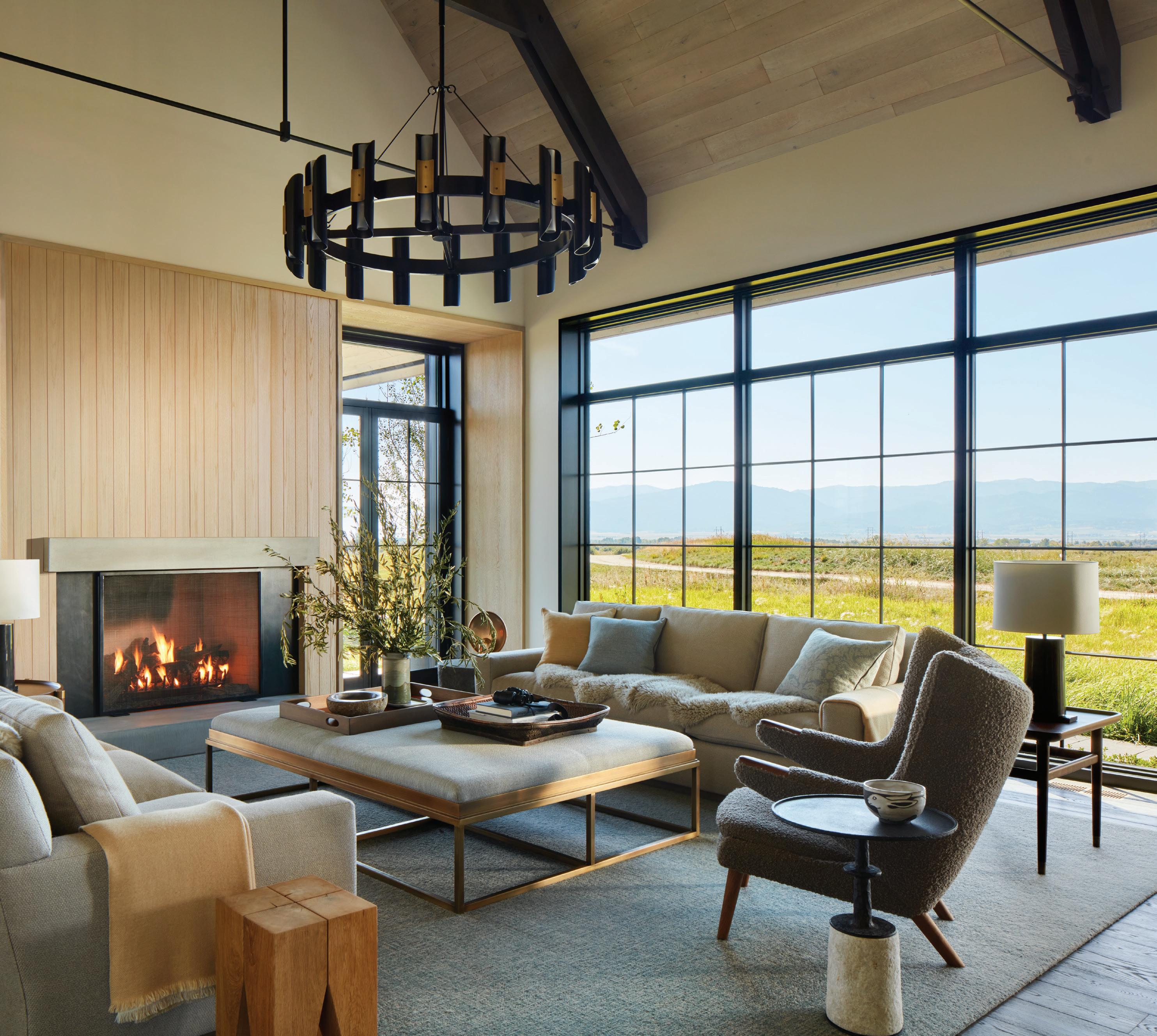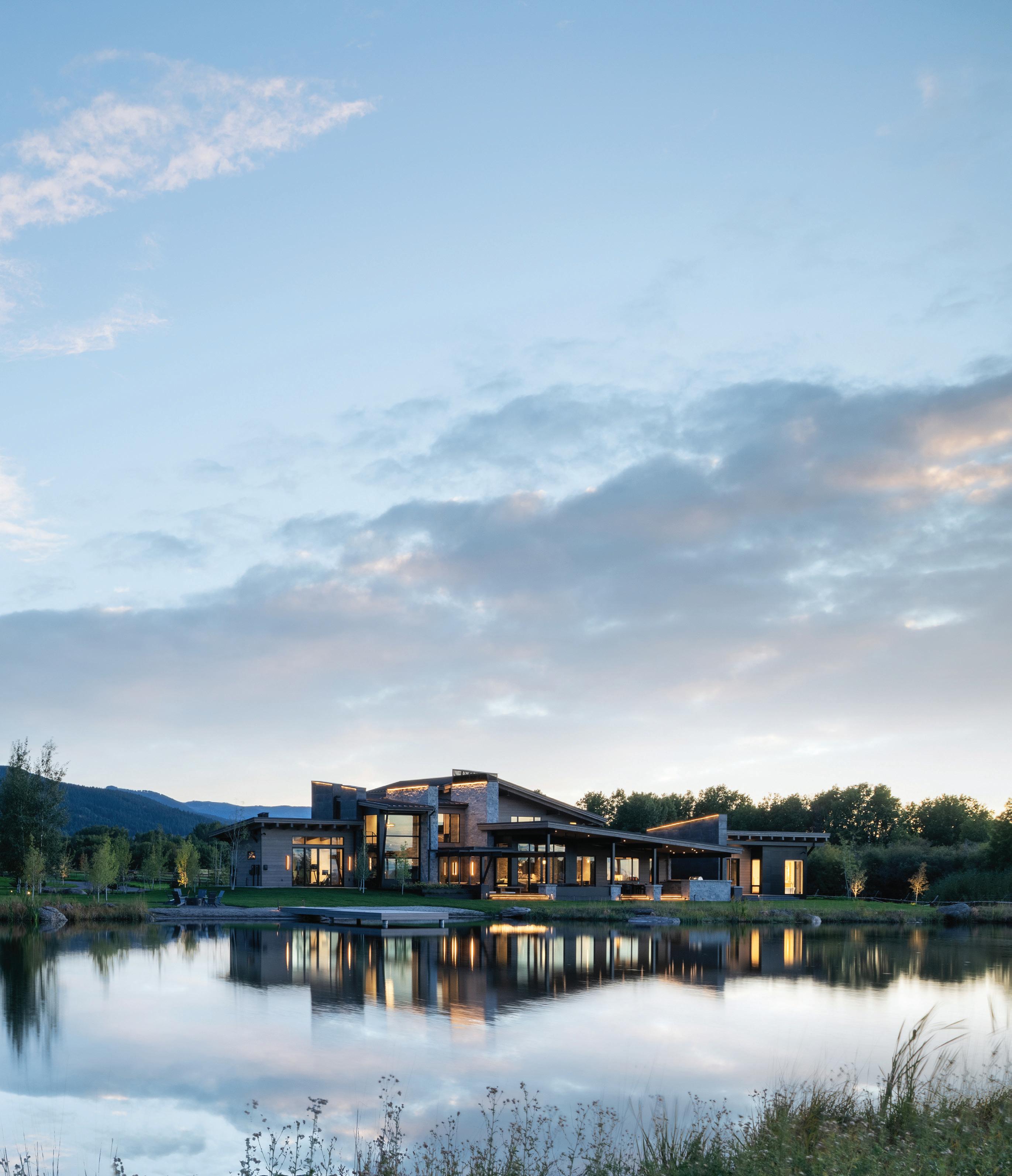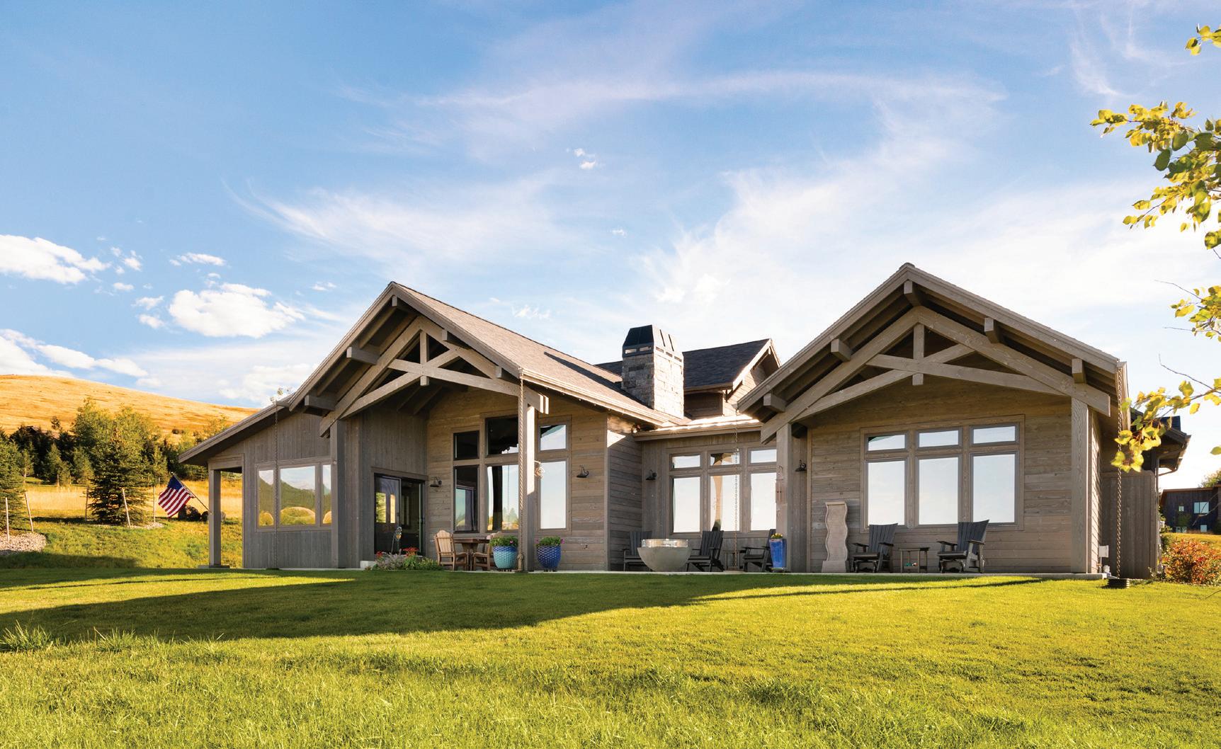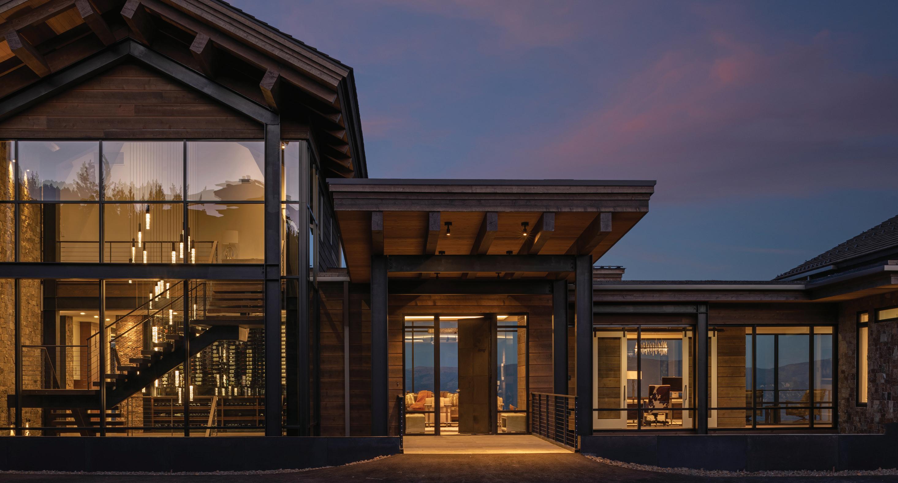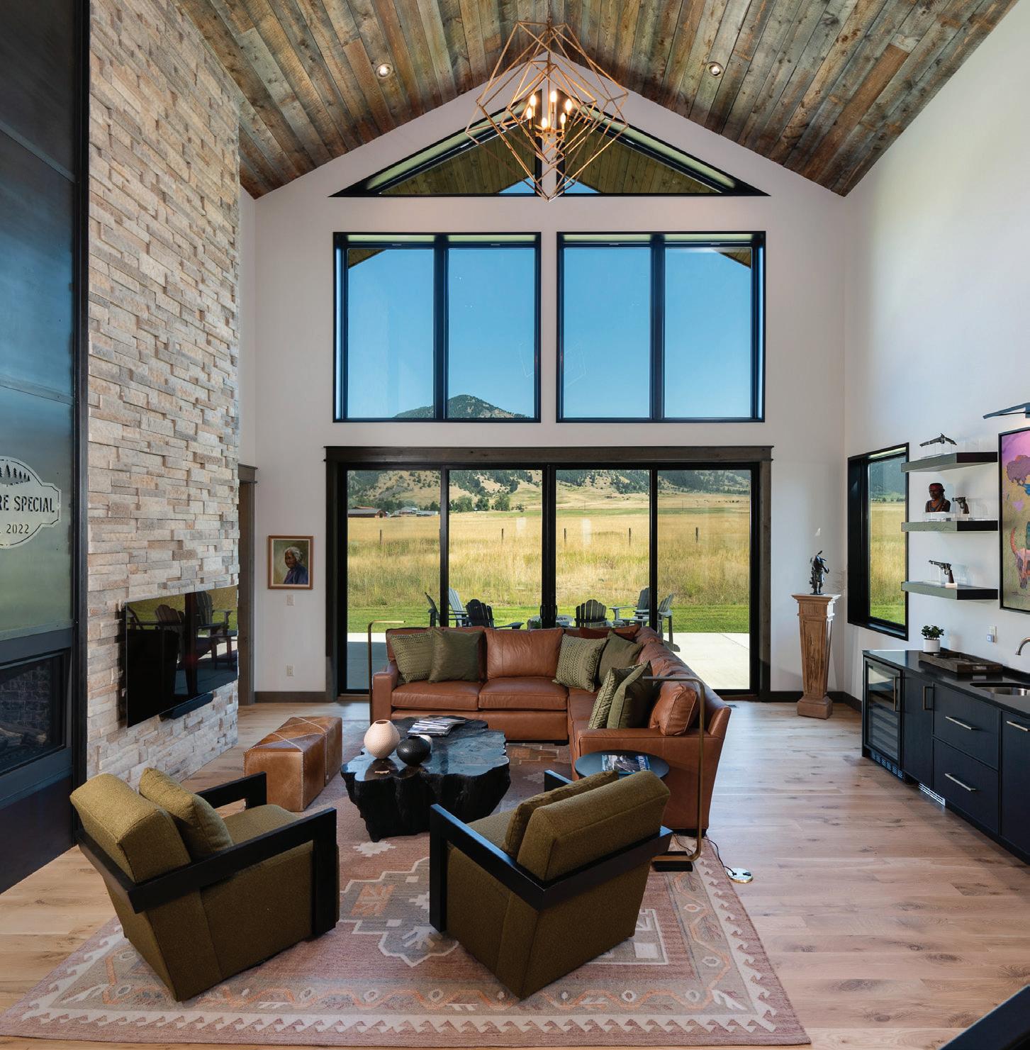 “The northwest-facing home has incredible views to the west, some Teton views to the north, and looks over ranchland that is in a protected agricultural conservation easement, so there will not be future development,” says principal architect Jamie Farmer of Farmer Payne Architects. “Its Westerncontemporary style is a mix of traditional gable forms, timeless materials, clean-lined modern glass walls, and steel trusses.”