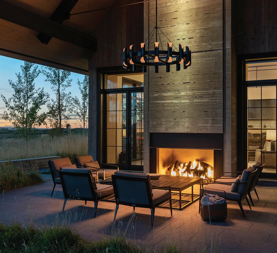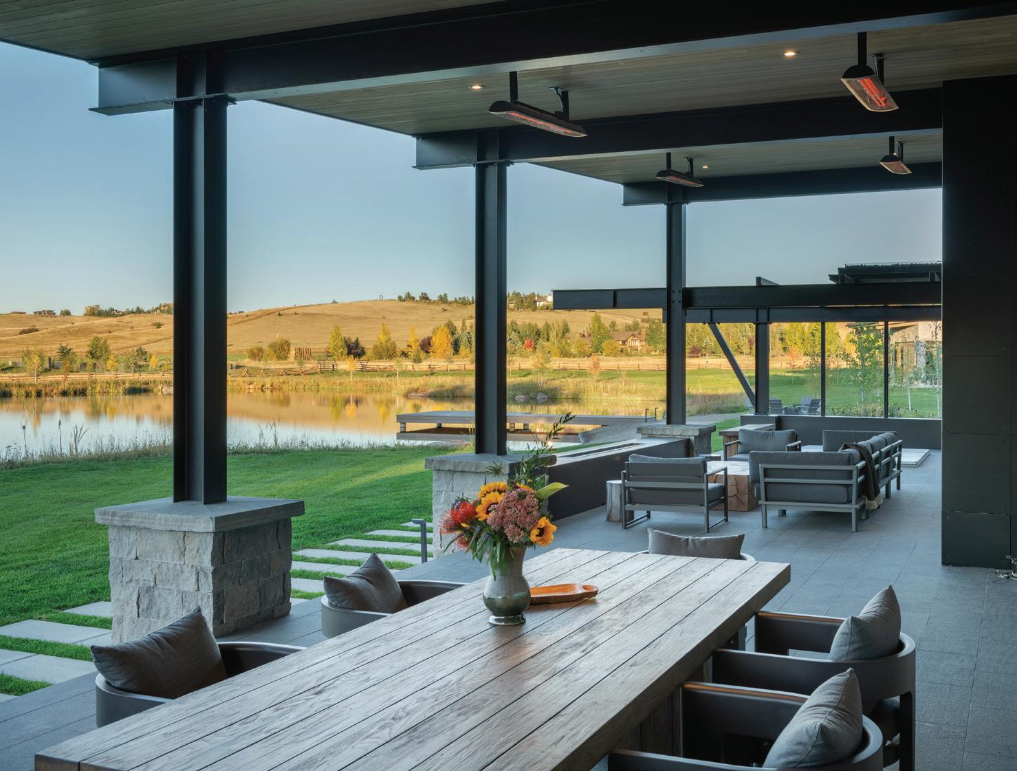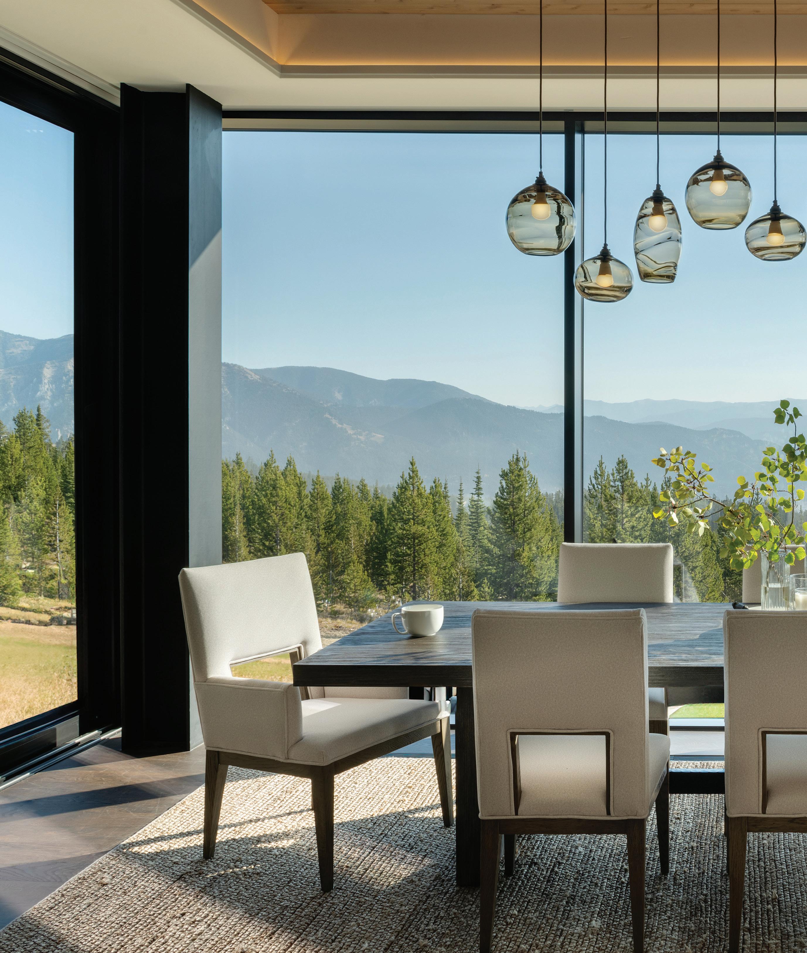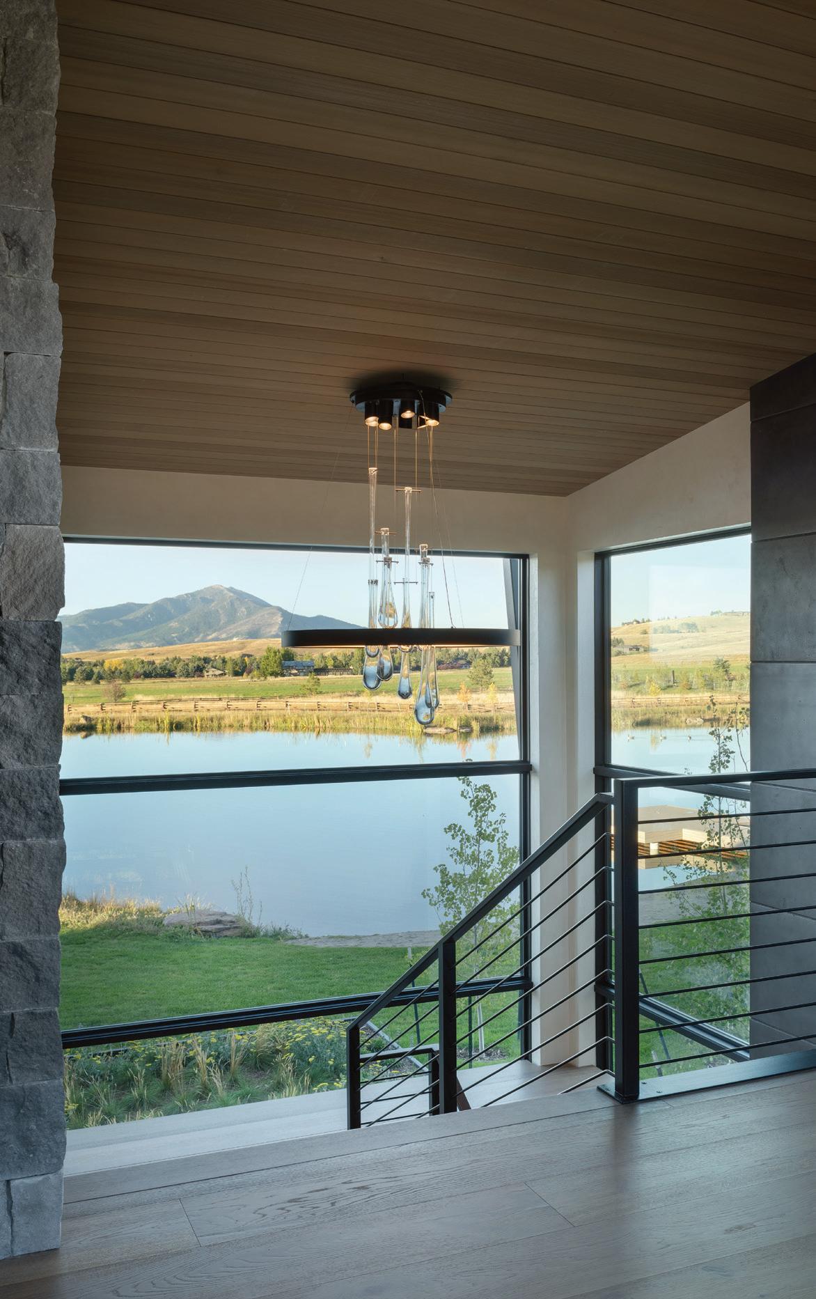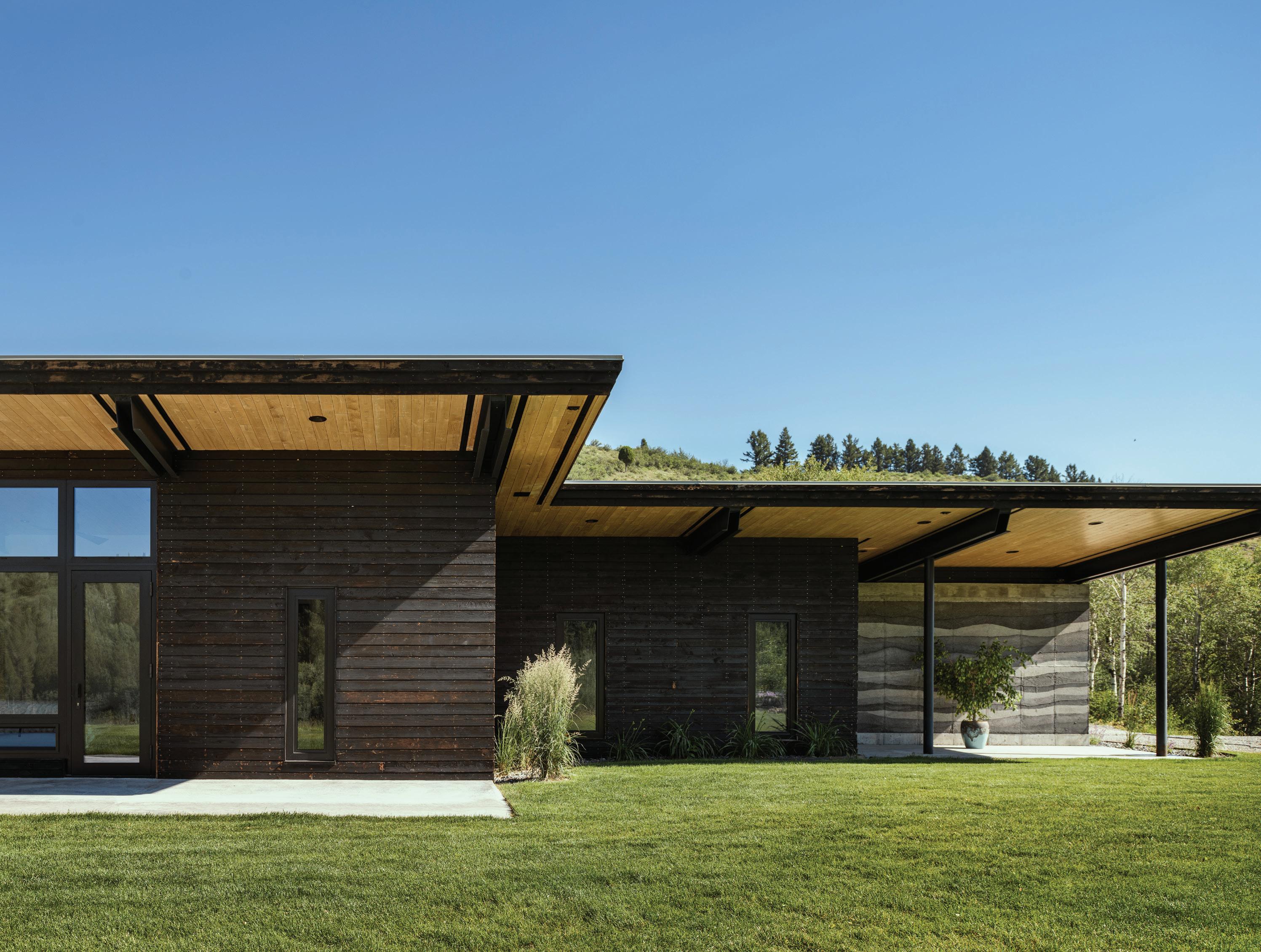 “The northwest-facing home has incredible views to the west, some Teton views to the north, and looks over ranchland that is in a protected agricultural conservation easement, so there will not be future development,” says principal architect Jamie Farmer of Farmer Payne Architects. “Its Westerncontemporary style is a mix of traditional gable forms, timeless materials, clean-lined modern glass walls, and steel trusses.”