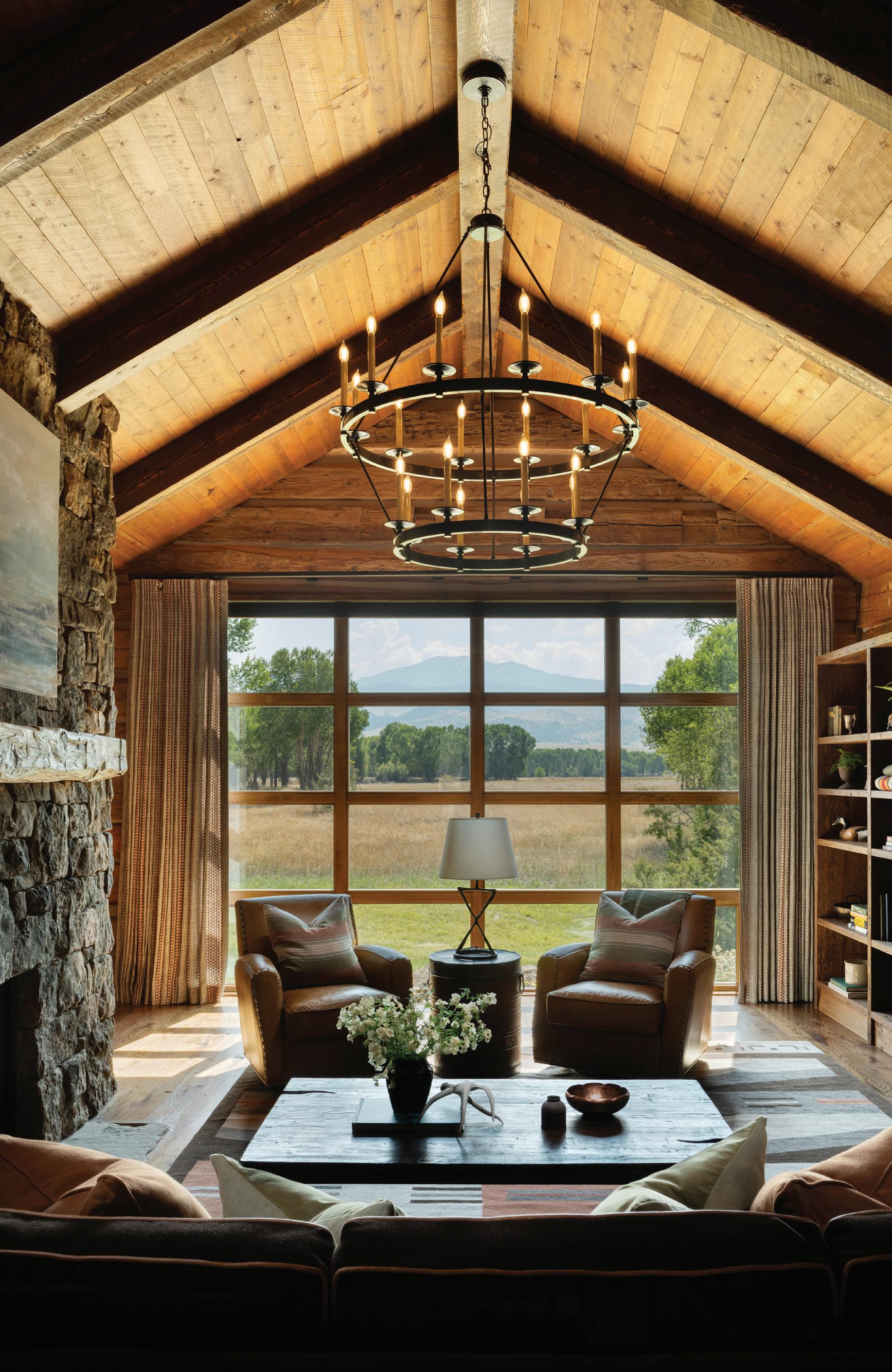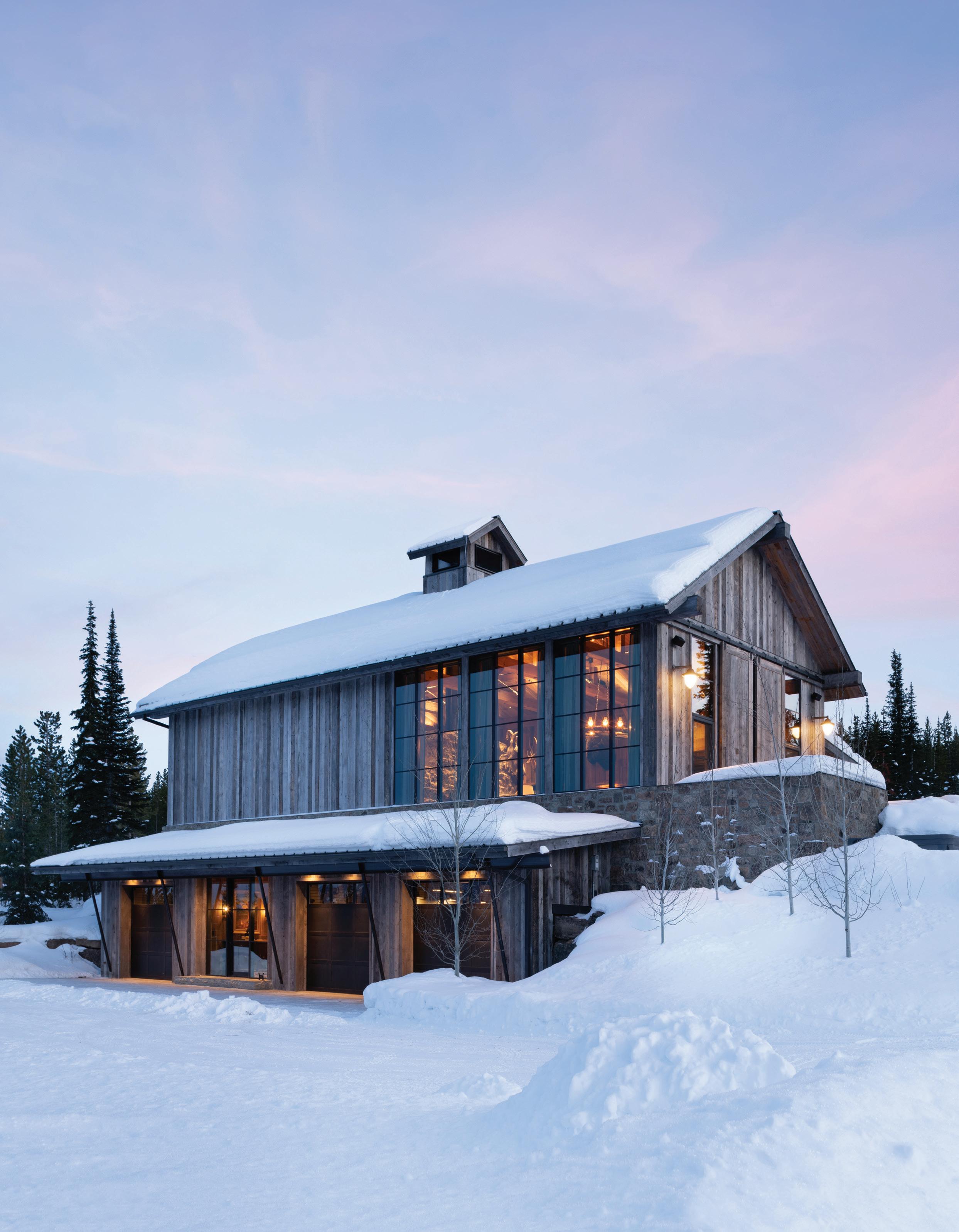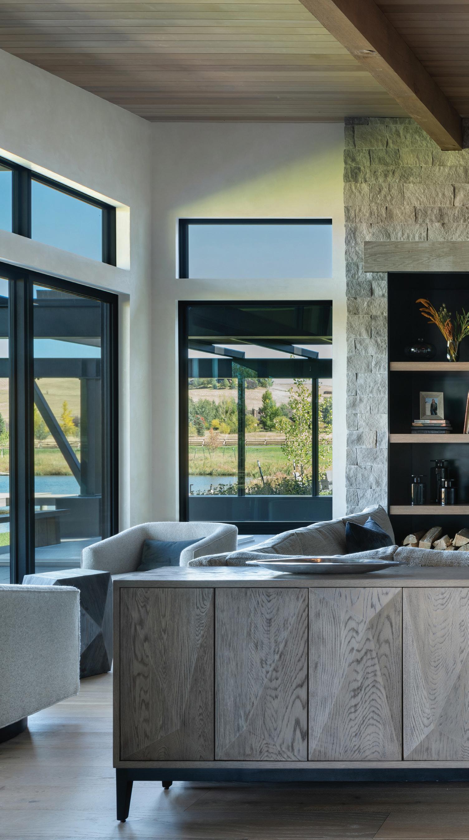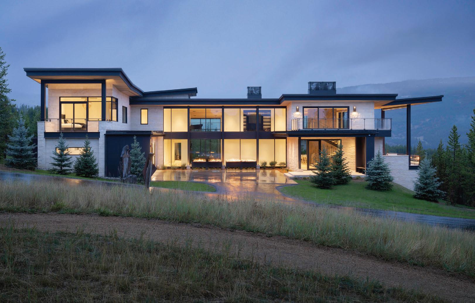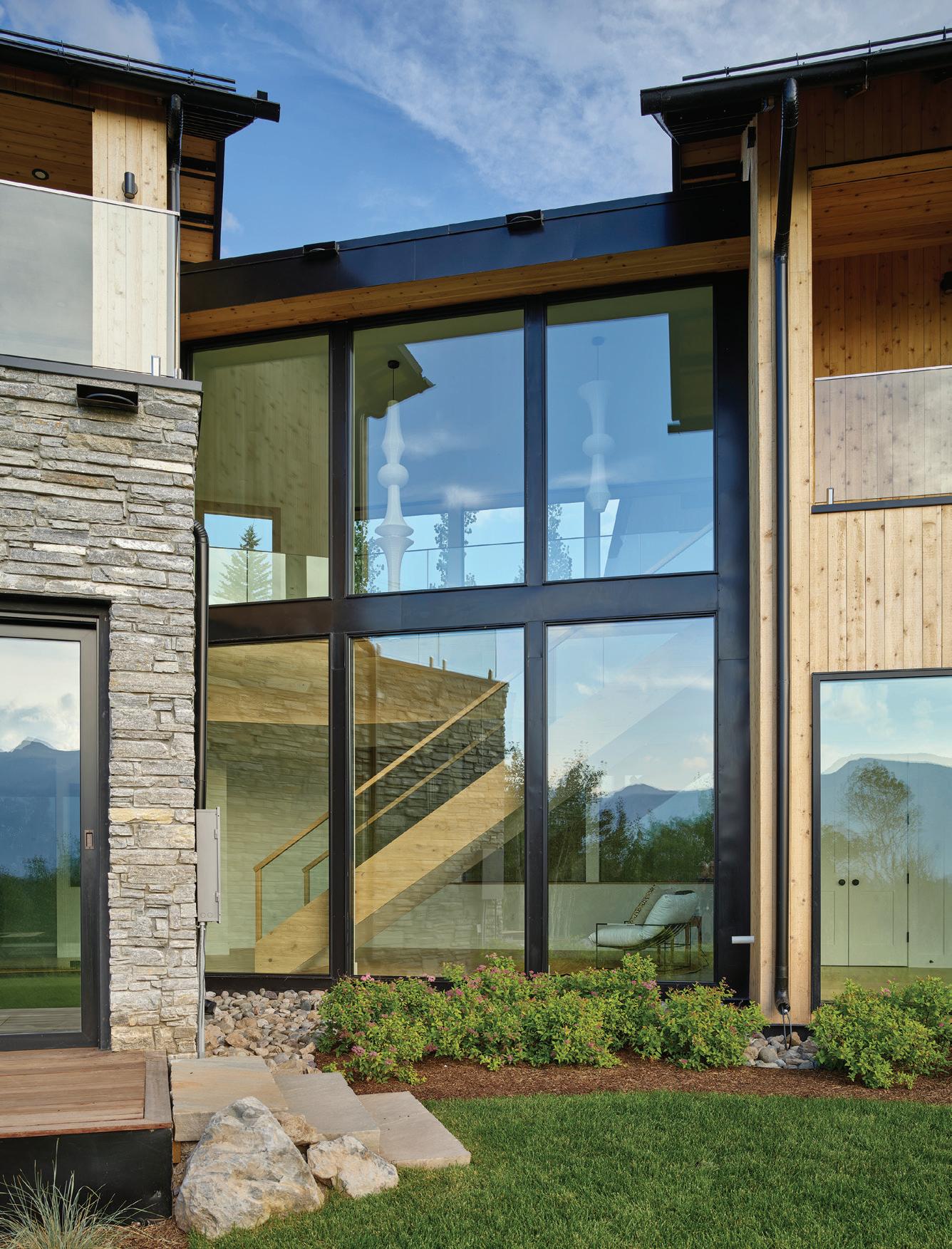 “The northwest-facing home has incredible views to the west, some Teton views to the north, and looks over ranchland that is in a protected agricultural conservation easement, so there will not be future development,” says principal architect Jamie Farmer of Farmer Payne Architects. “Its Westerncontemporary style is a mix of traditional gable forms, timeless materials, clean-lined modern glass walls, and steel trusses.”