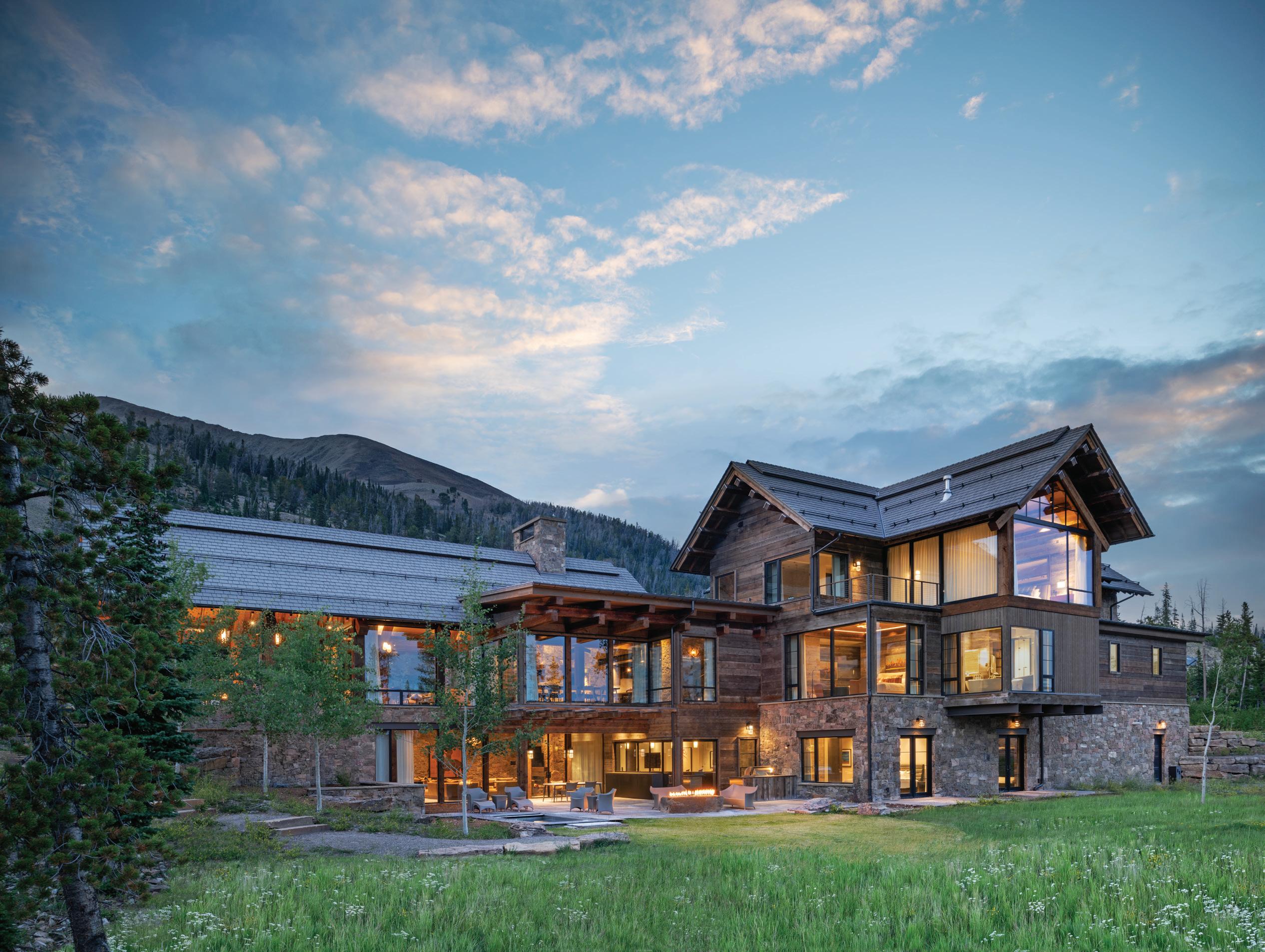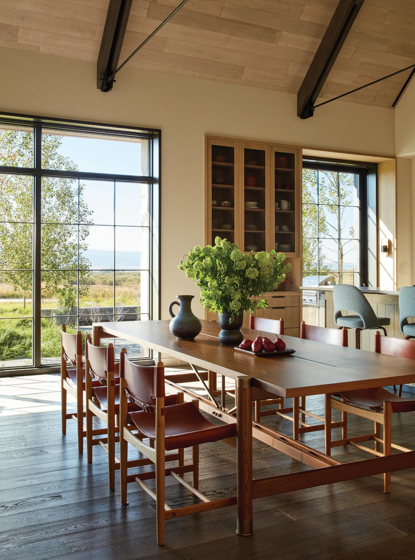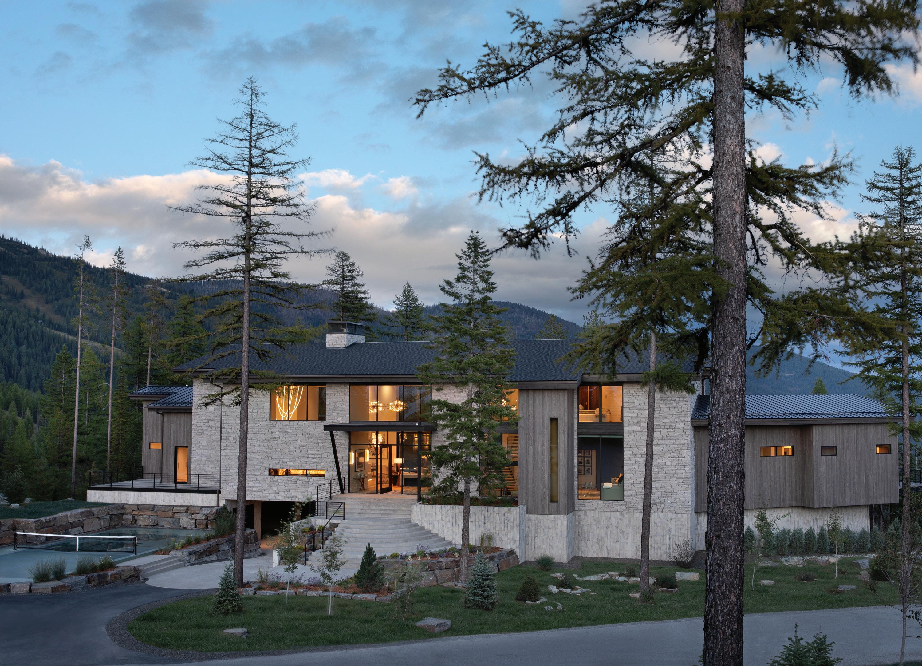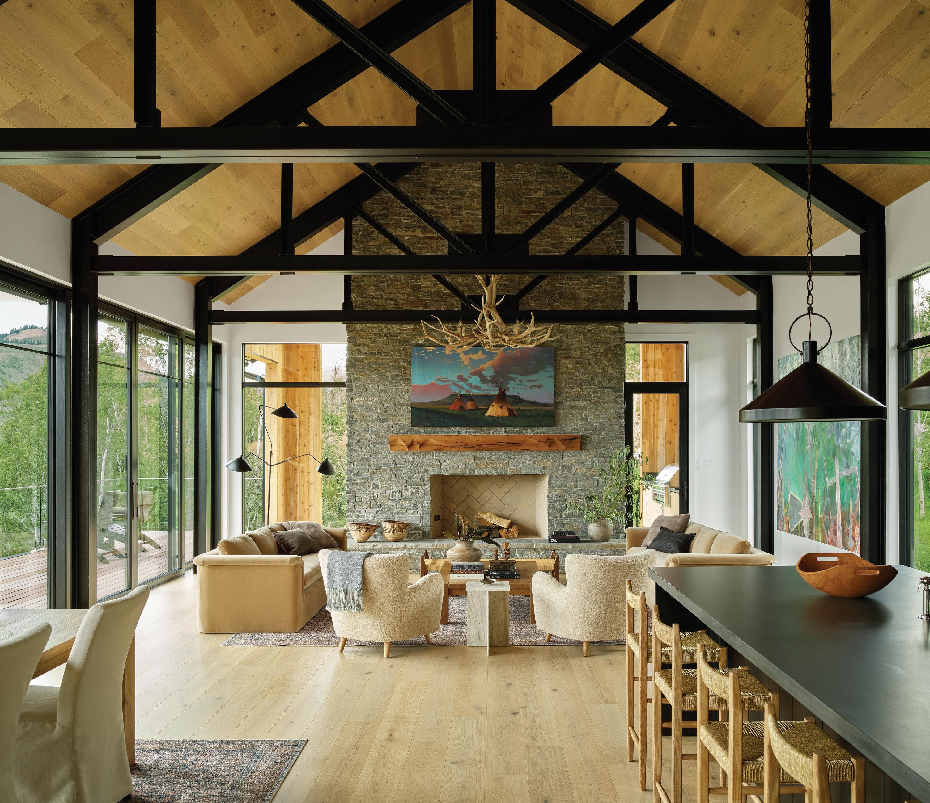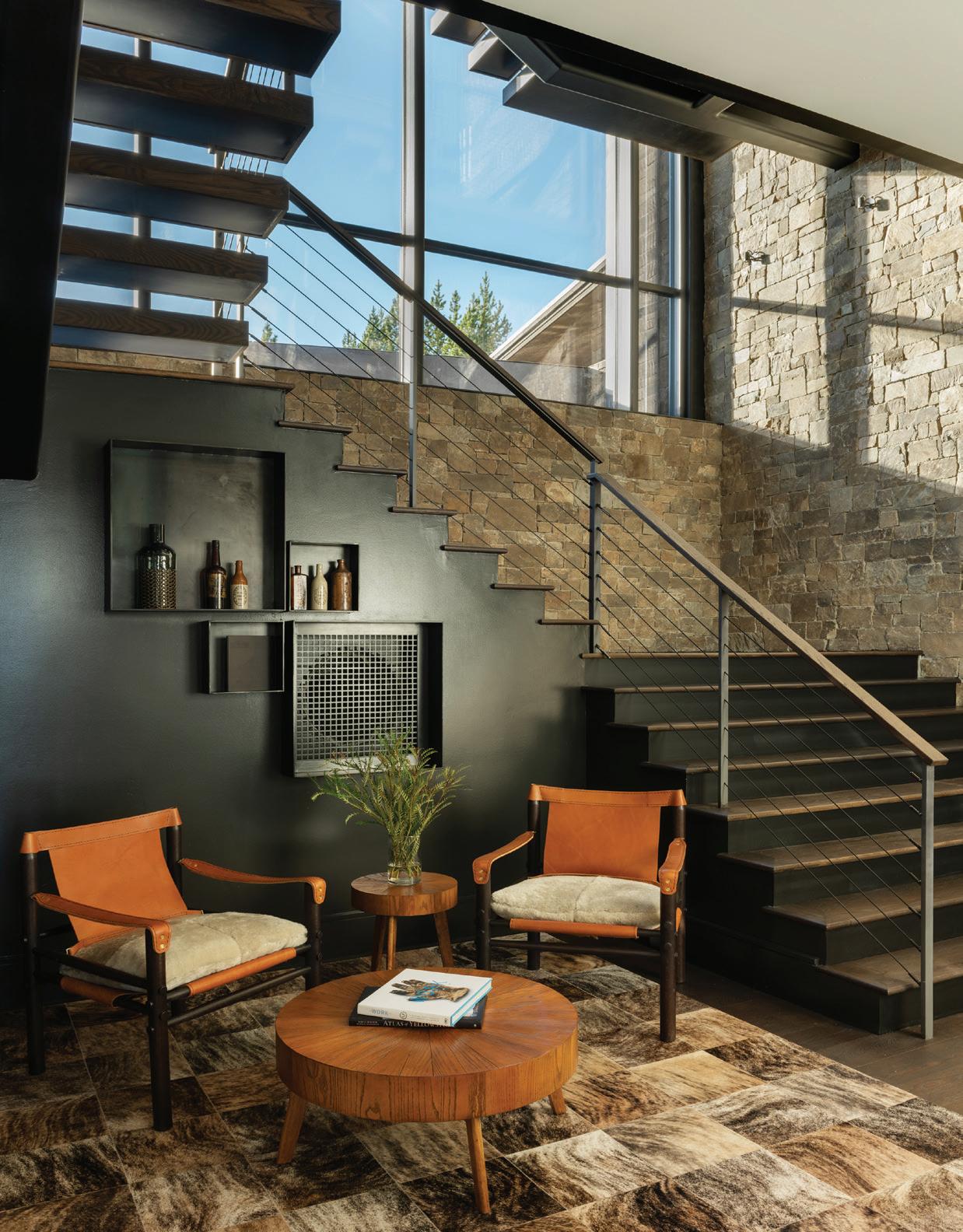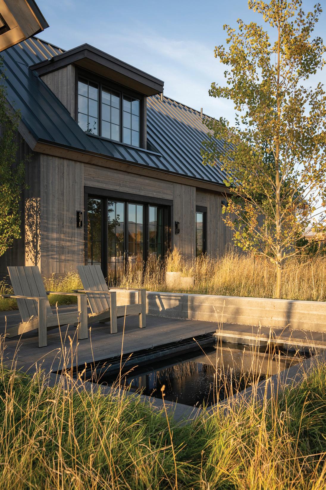 “The northwest-facing home has incredible views to the west, some Teton views to the north, and looks over ranchland that is in a protected agricultural conservation easement, so there will not be future development,” says principal architect Jamie Farmer of Farmer Payne Architects. “Its Westerncontemporary style is a mix of traditional gable forms, timeless materials, clean-lined modern glass walls, and steel trusses.”