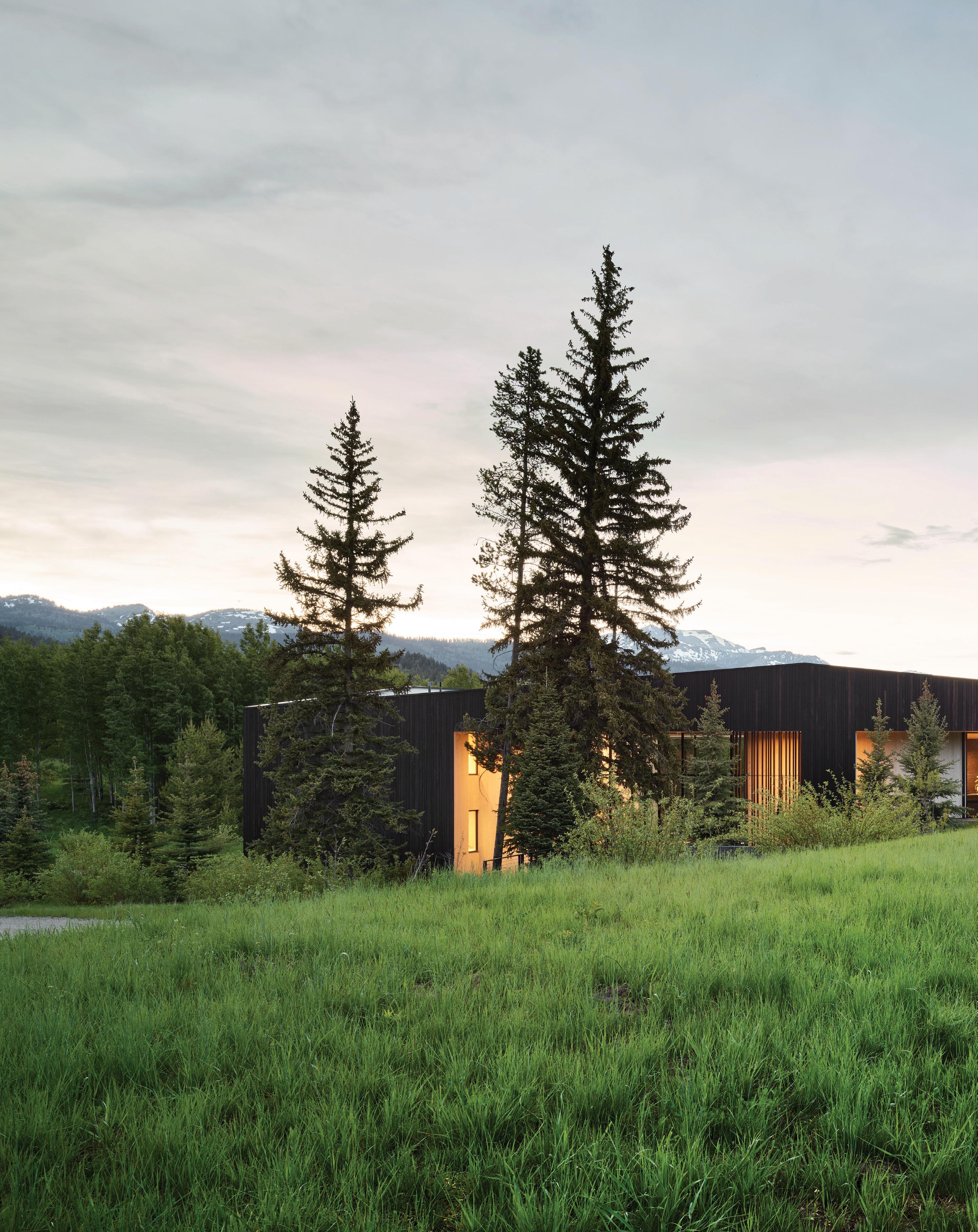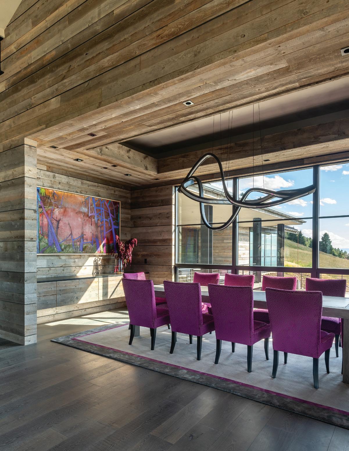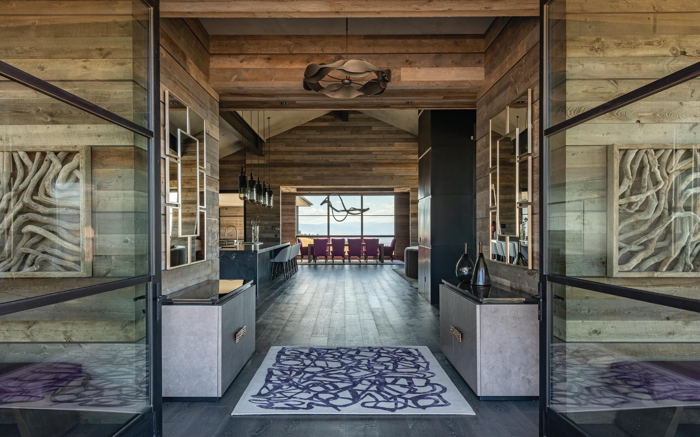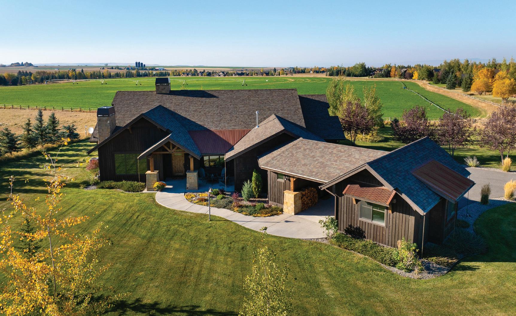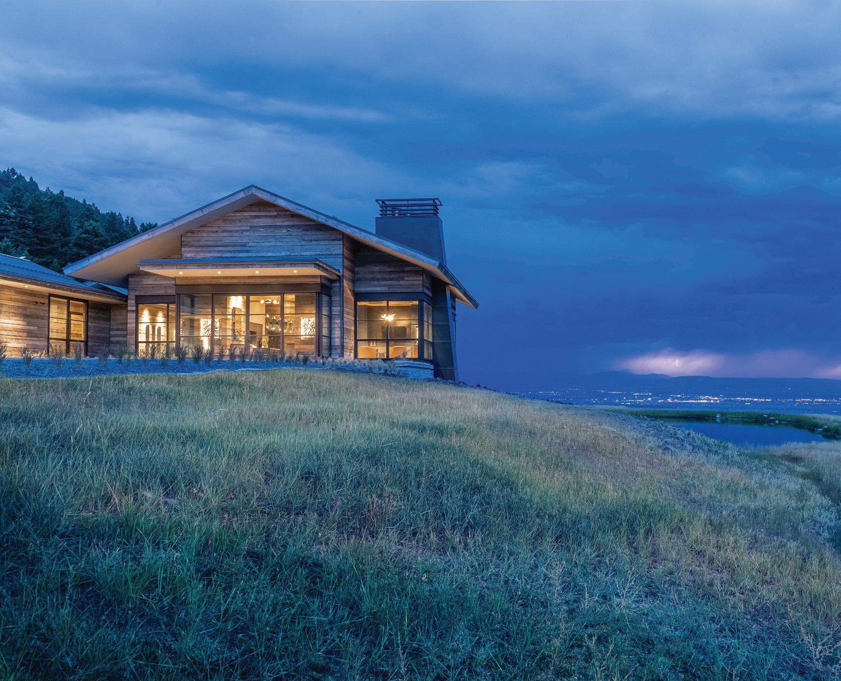 “The northwest-facing home has incredible views to the west, some Teton views to the north, and looks over ranchland that is in a protected agricultural conservation easement, so there will not be future development,” says principal architect Jamie Farmer of Farmer Payne Architects. “Its Westerncontemporary style is a mix of traditional gable forms, timeless materials, clean-lined modern glass walls, and steel trusses.”