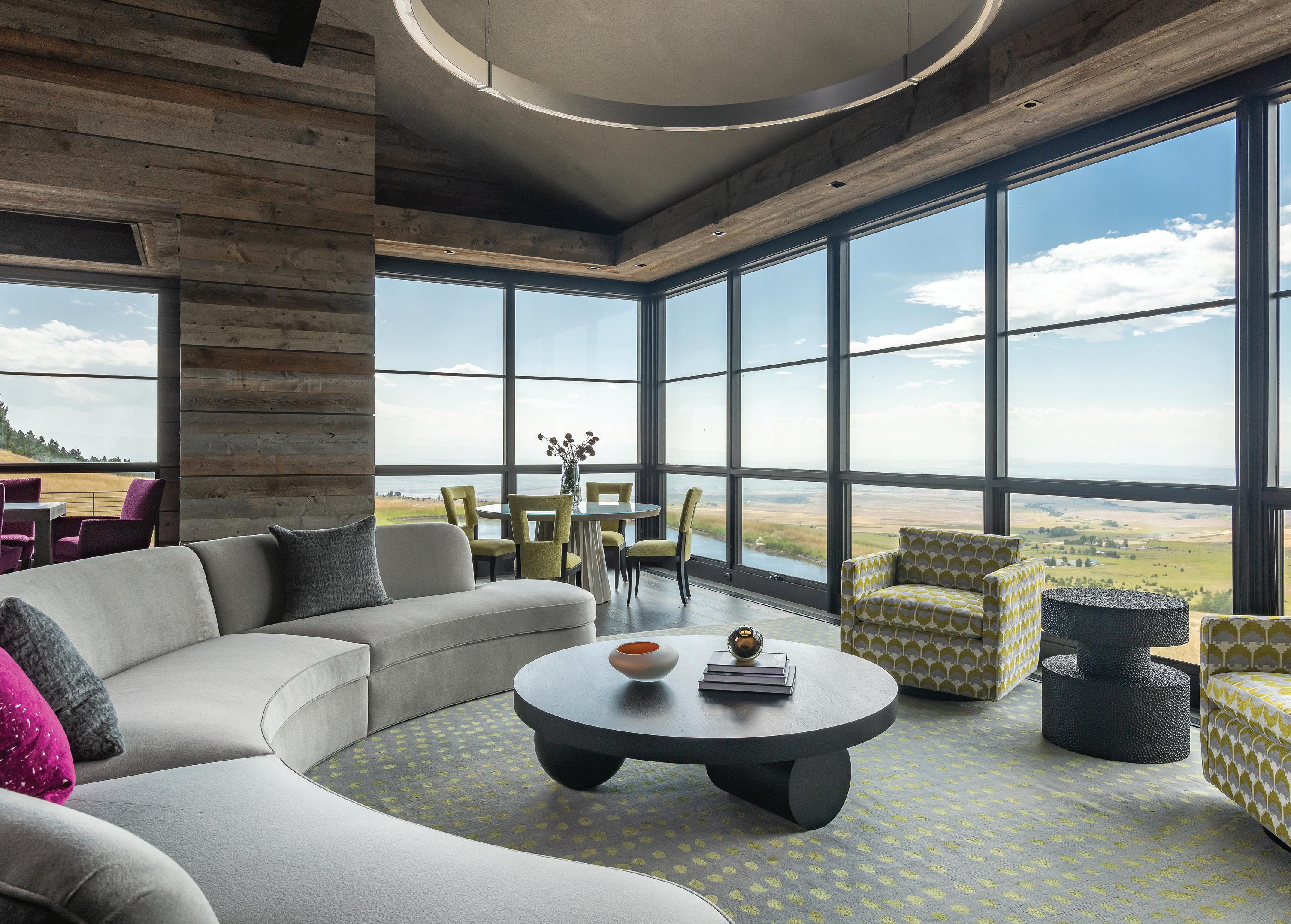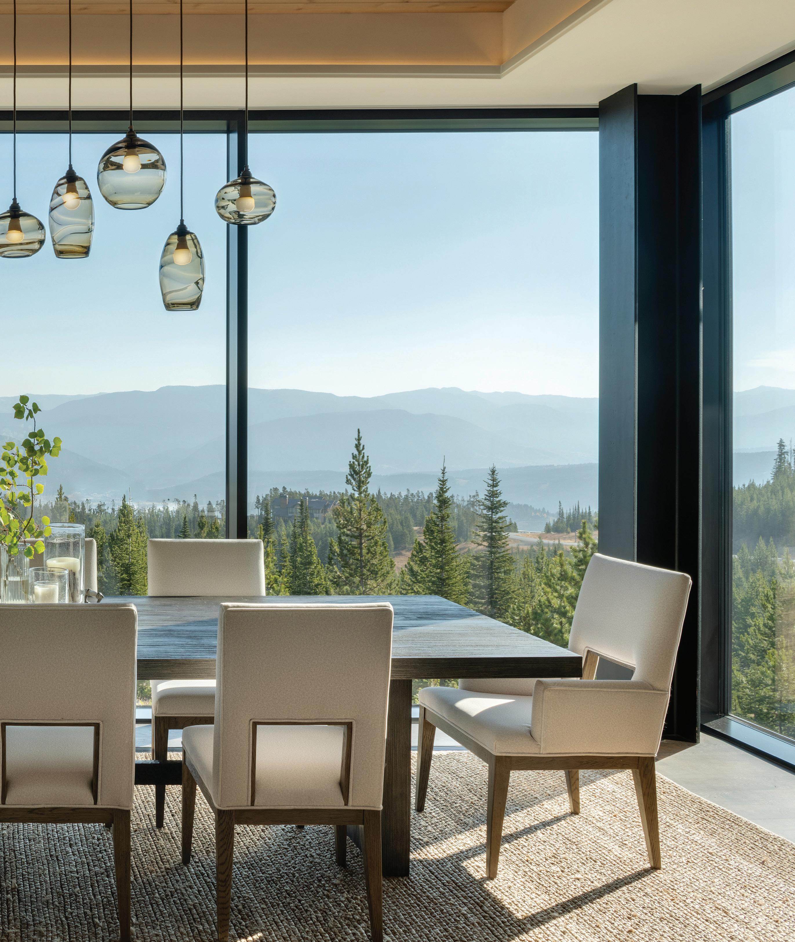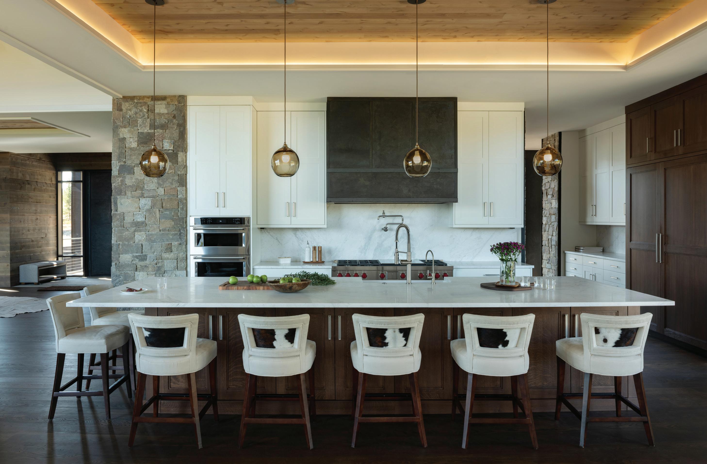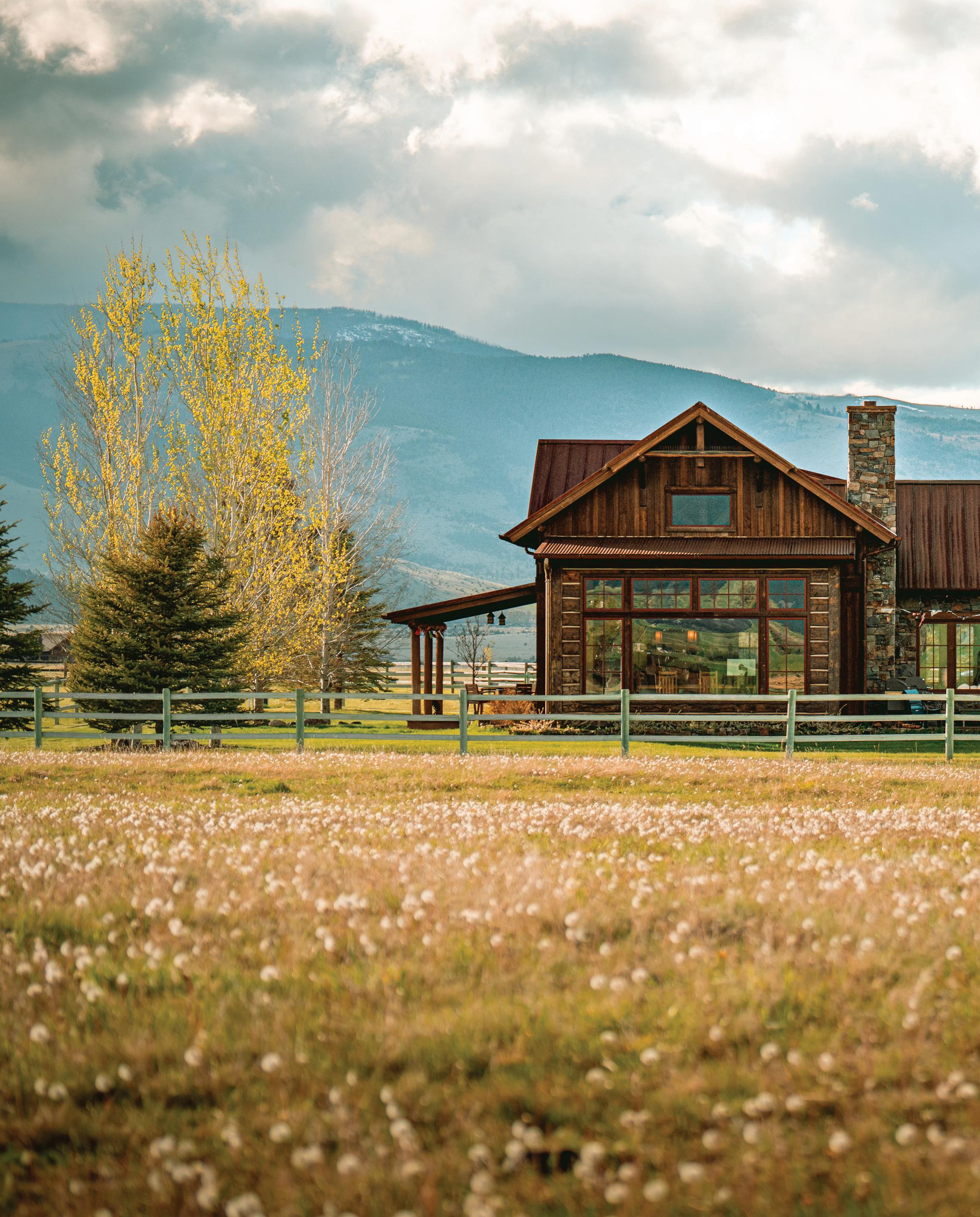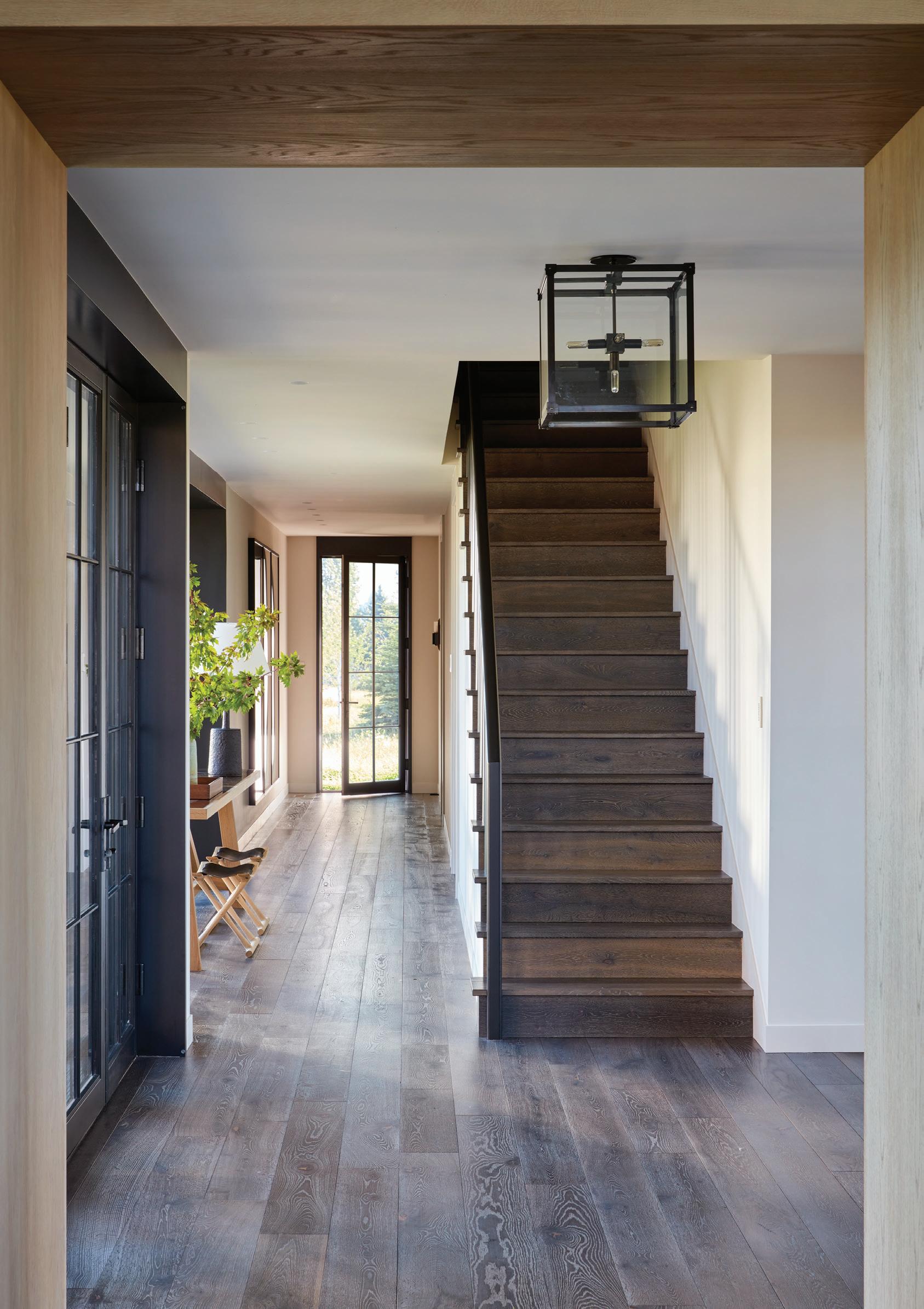 “The northwest-facing home has incredible views to the west, some Teton views to the north, and looks over ranchland that is in a protected agricultural conservation easement, so there will not be future development,” says principal architect Jamie Farmer of Farmer Payne Architects. “Its Westerncontemporary style is a mix of traditional gable forms, timeless materials, clean-lined modern glass walls, and steel trusses.”