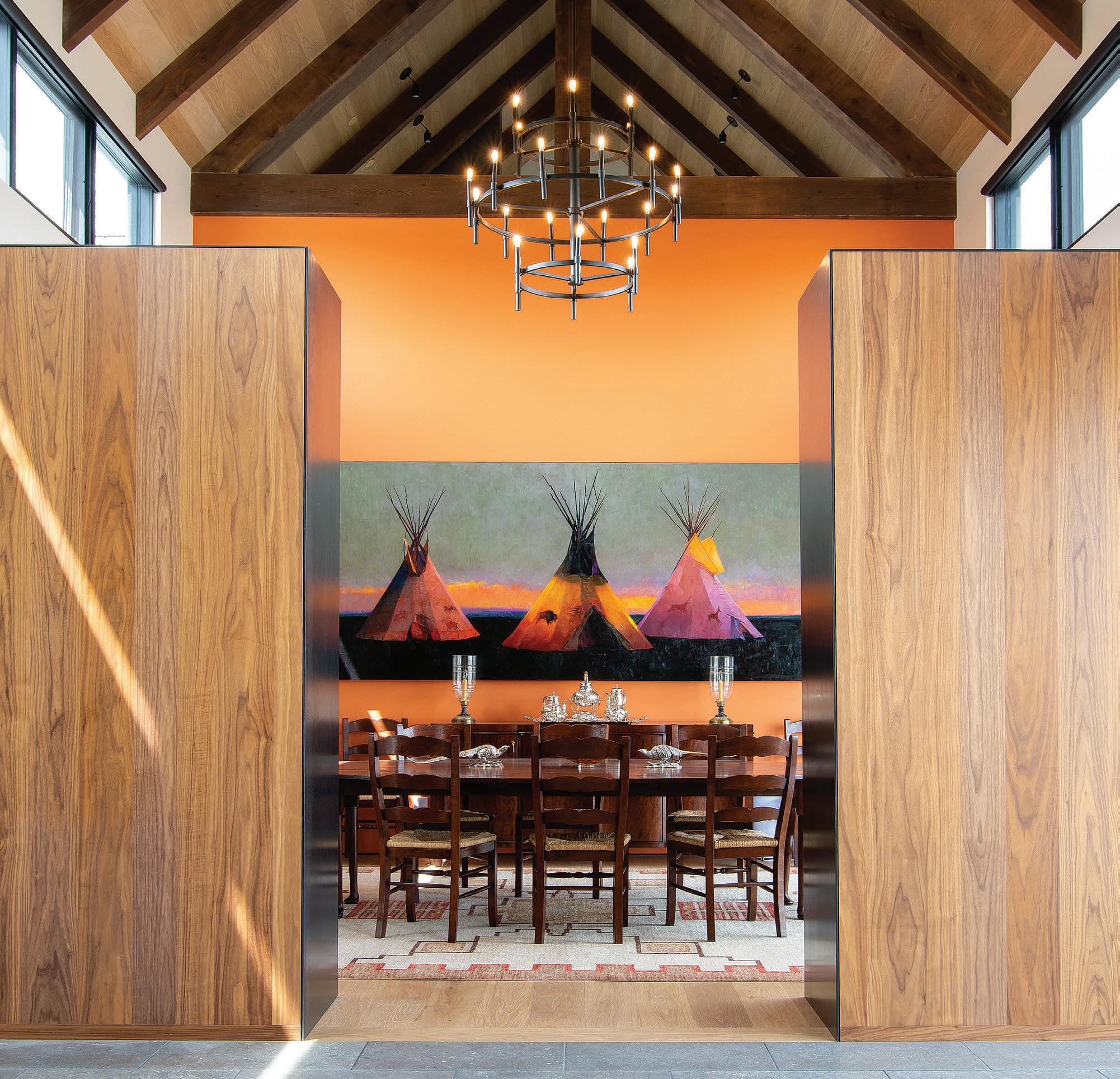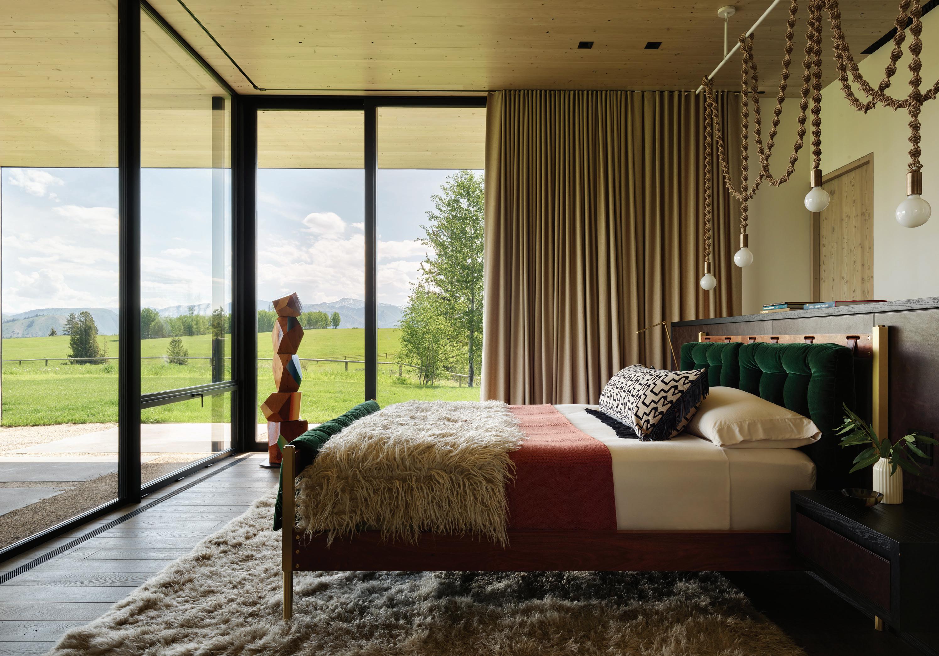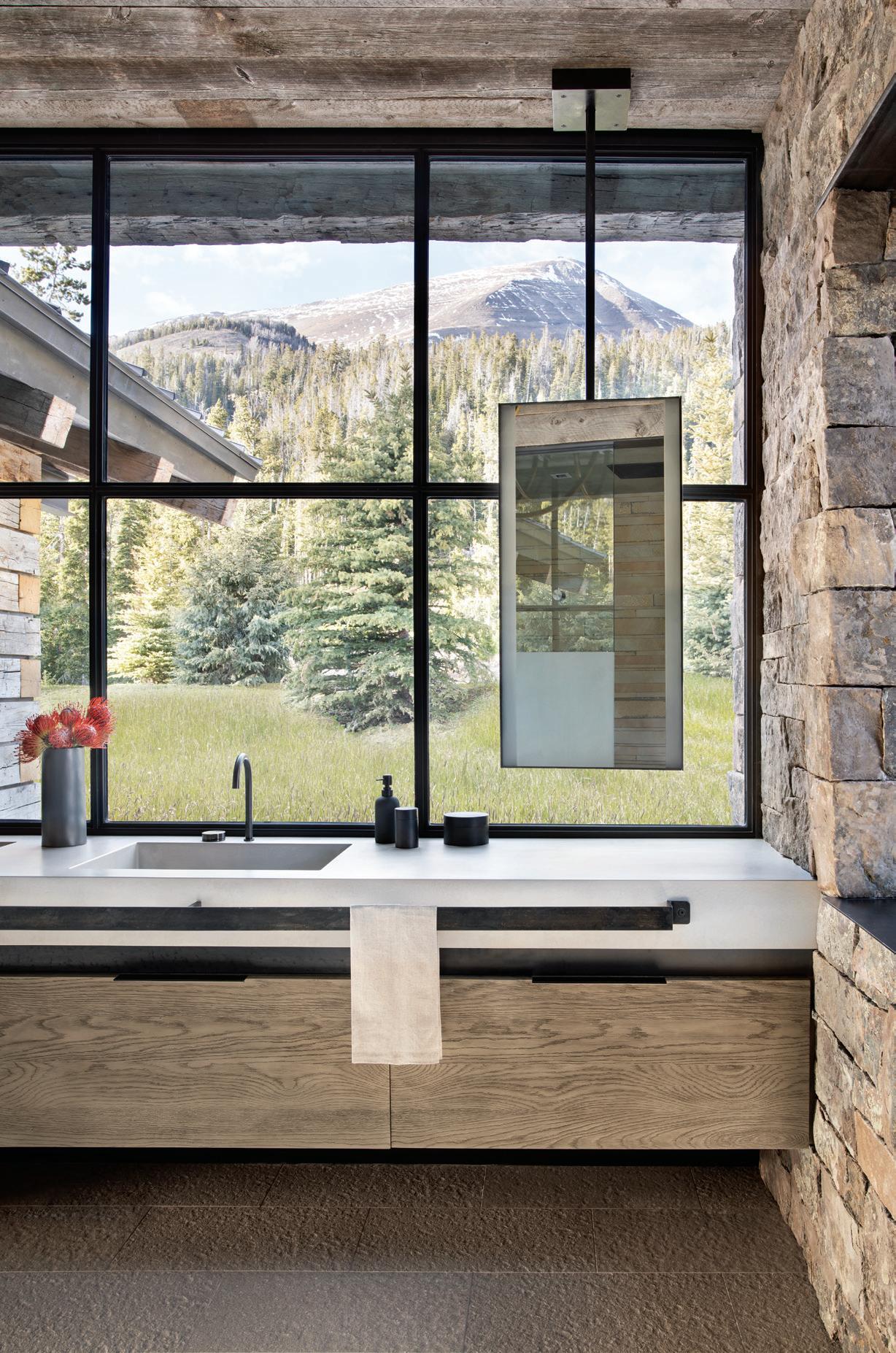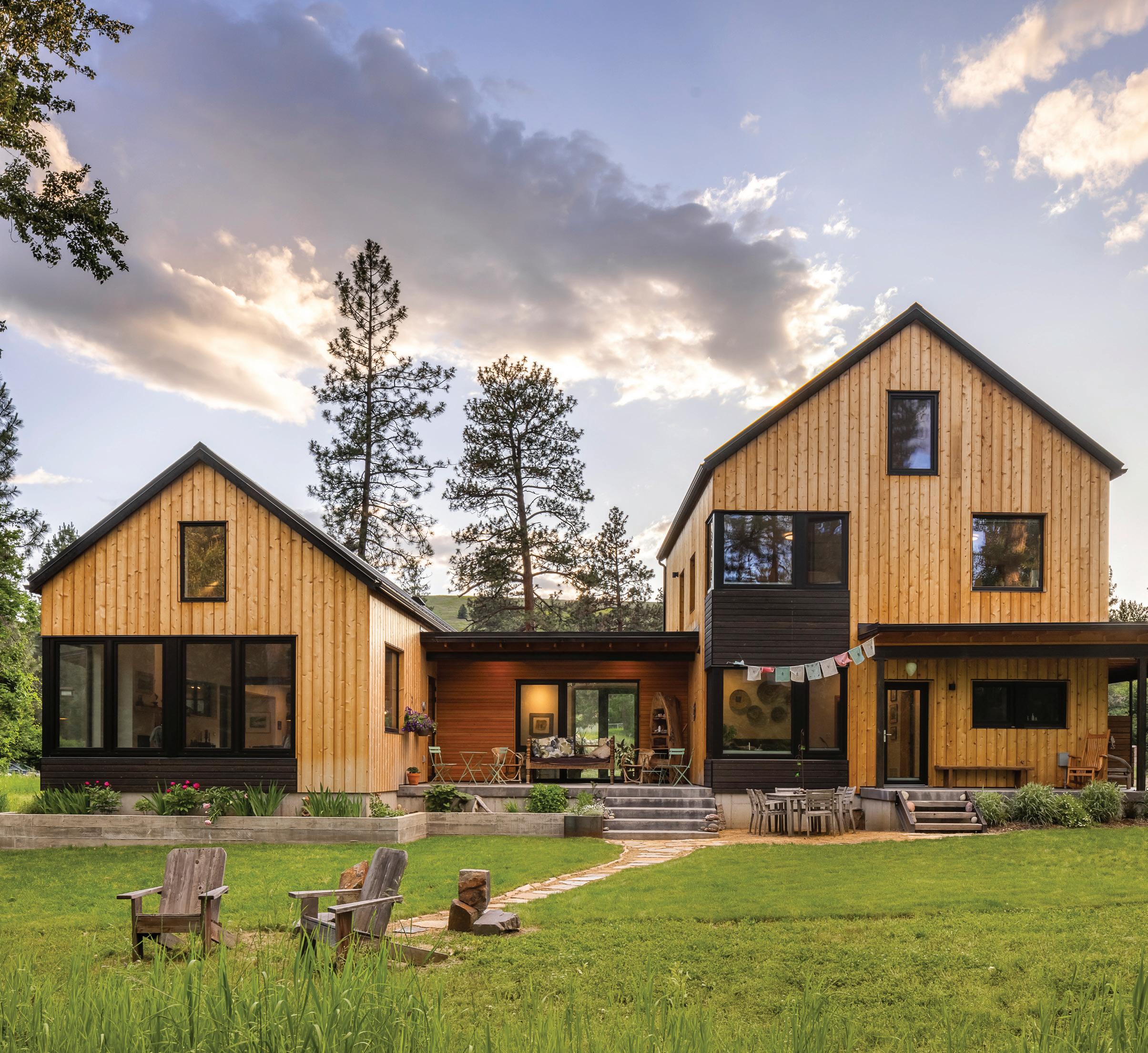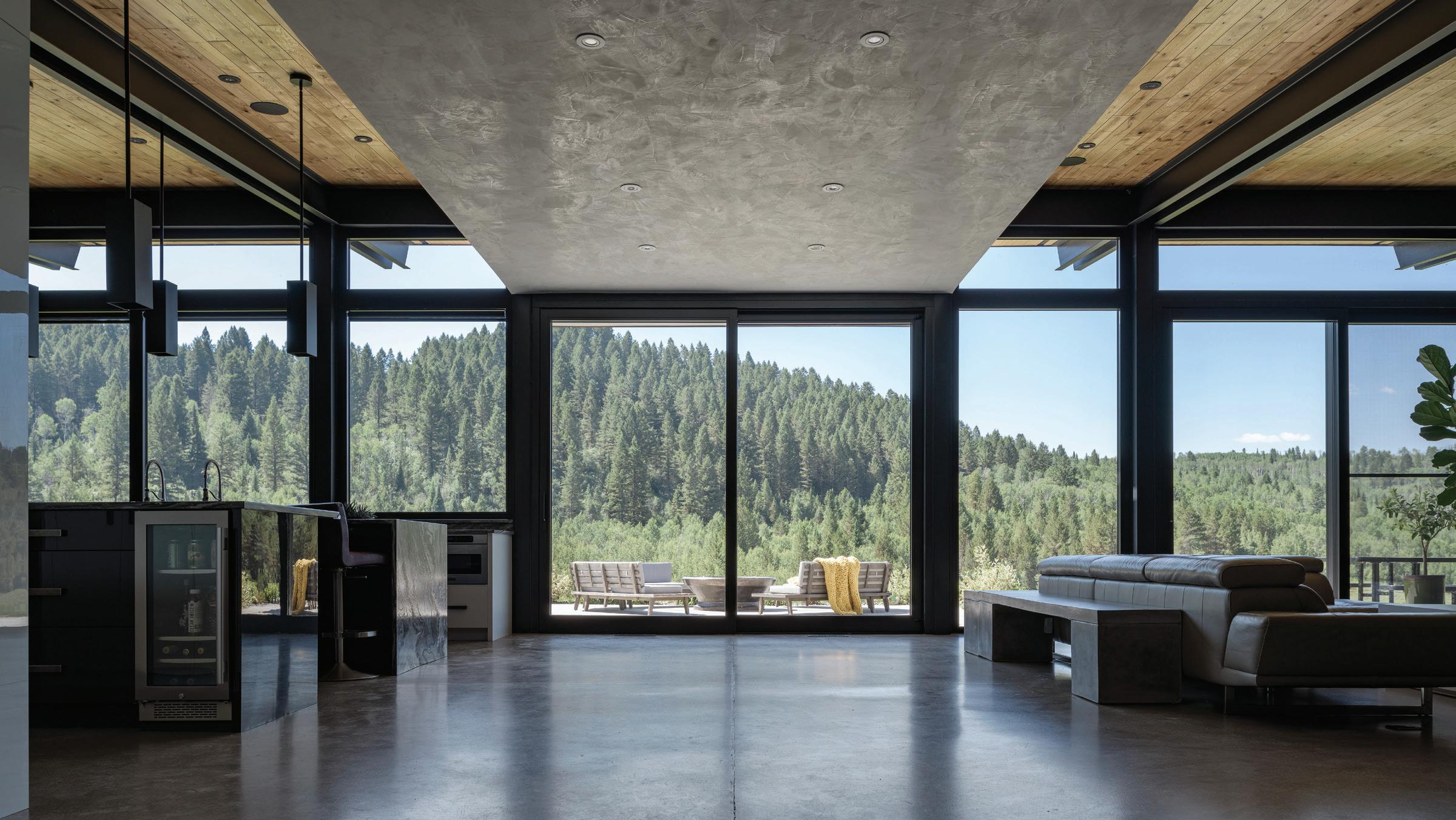 “The northwest-facing home has incredible views to the west, some Teton views to the north, and looks over ranchland that is in a protected agricultural conservation easement, so there will not be future development,” says principal architect Jamie Farmer of Farmer Payne Architects. “Its Westerncontemporary style is a mix of traditional gable forms, timeless materials, clean-lined modern glass walls, and steel trusses.”