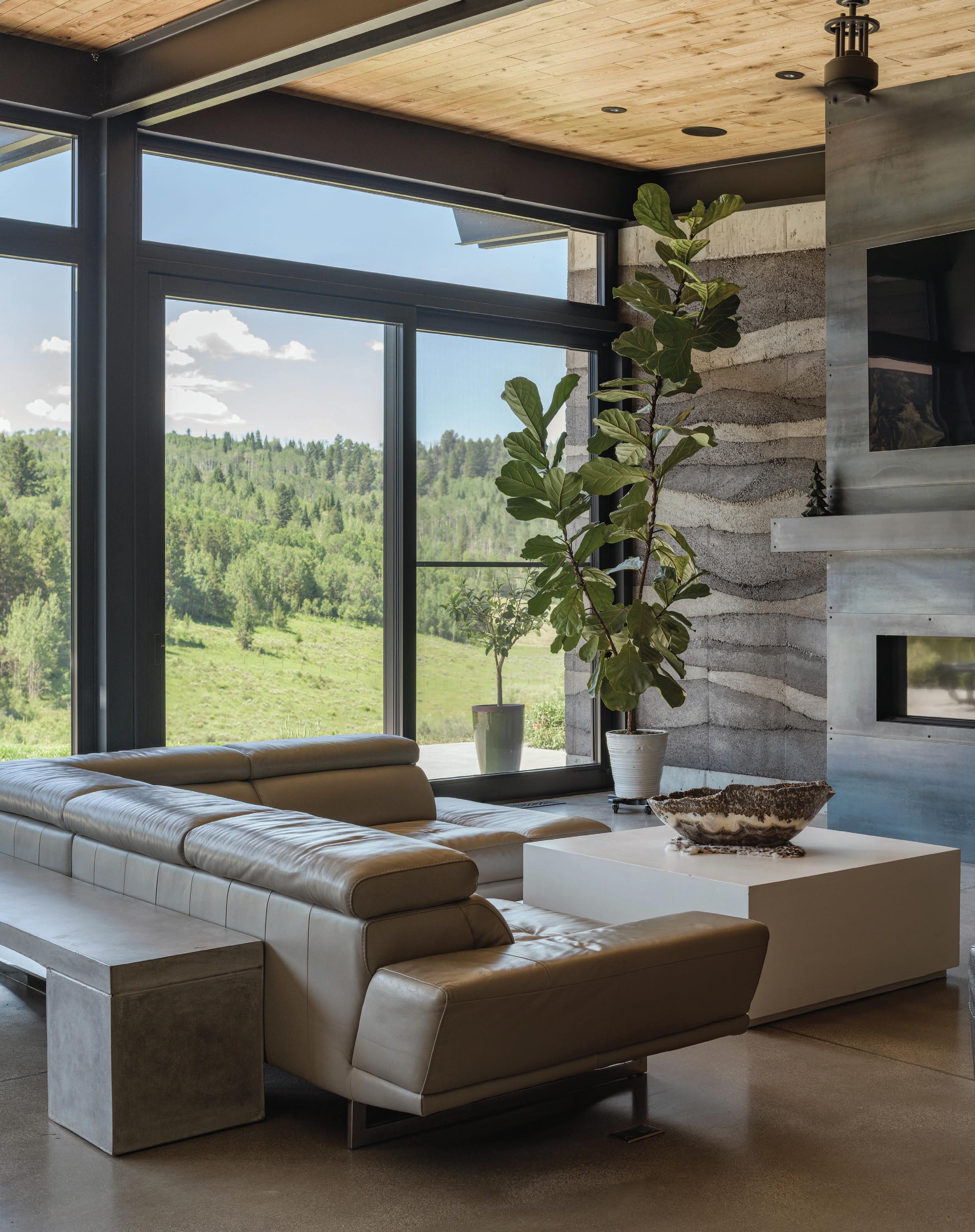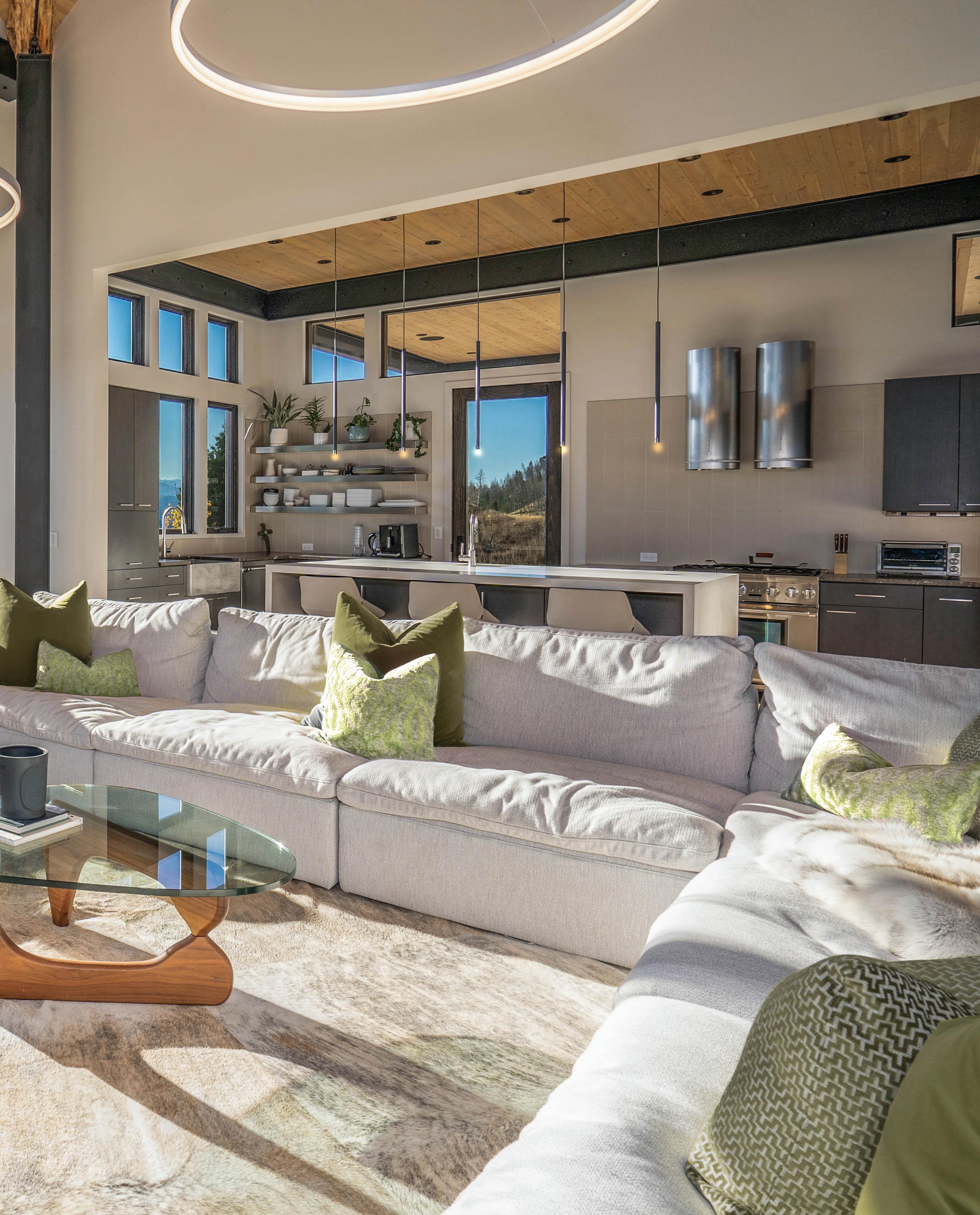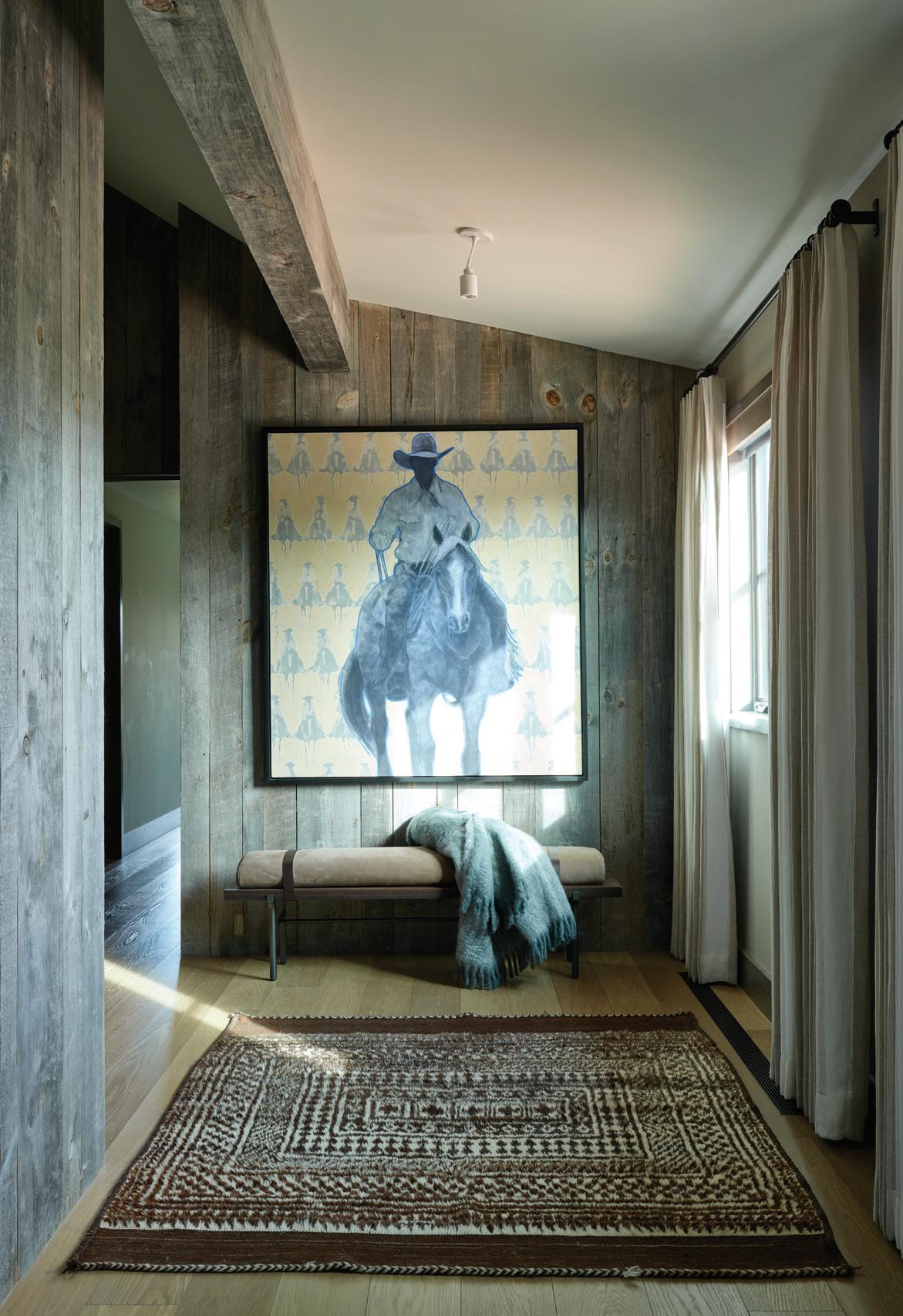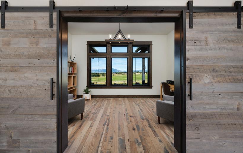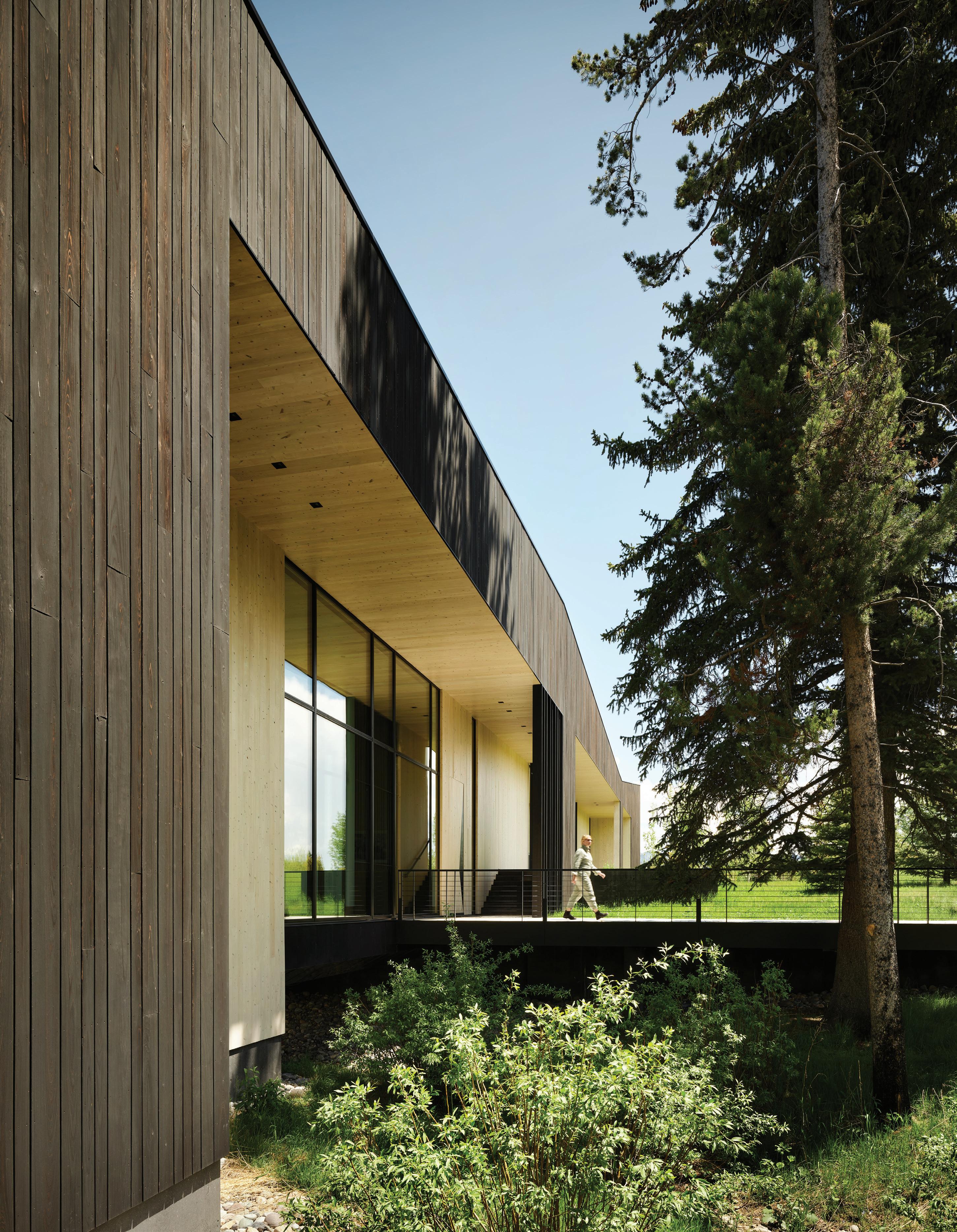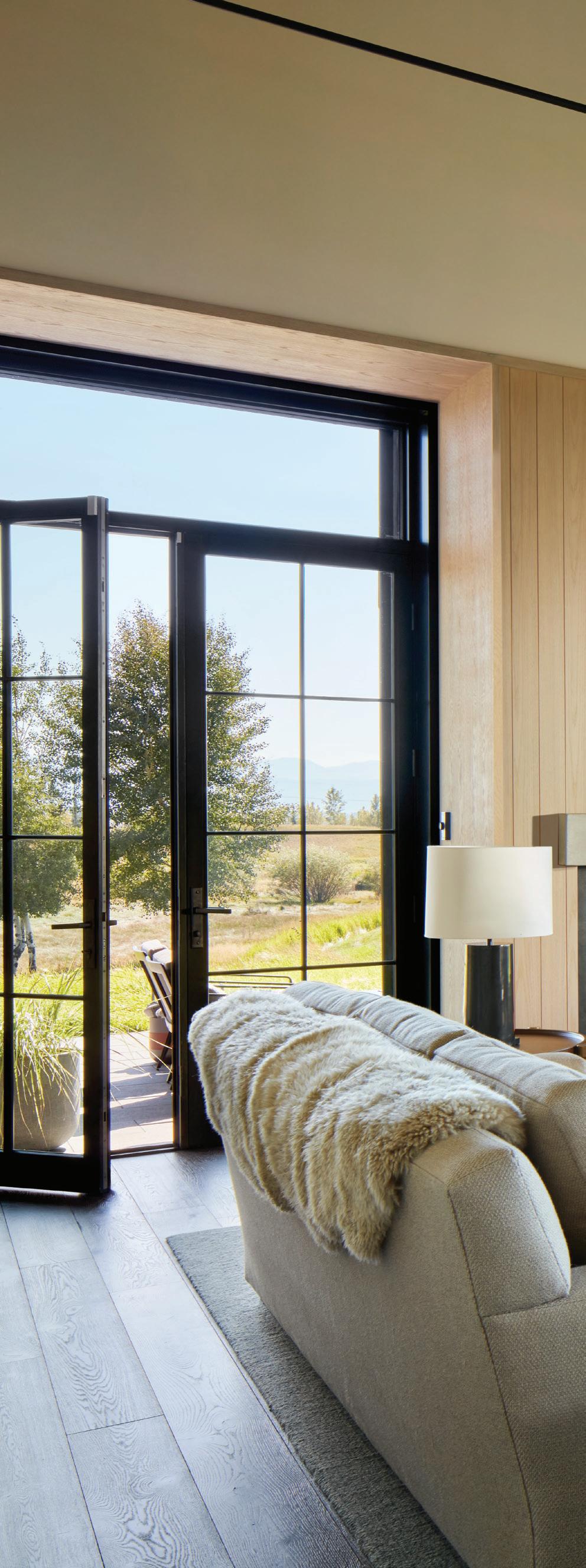 “The northwest-facing home has incredible views to the west, some Teton views to the north, and looks over ranchland that is in a protected agricultural conservation easement, so there will not be future development,” says principal architect Jamie Farmer of Farmer Payne Architects. “Its Westerncontemporary style is a mix of traditional gable forms, timeless materials, clean-lined modern glass walls, and steel trusses.”