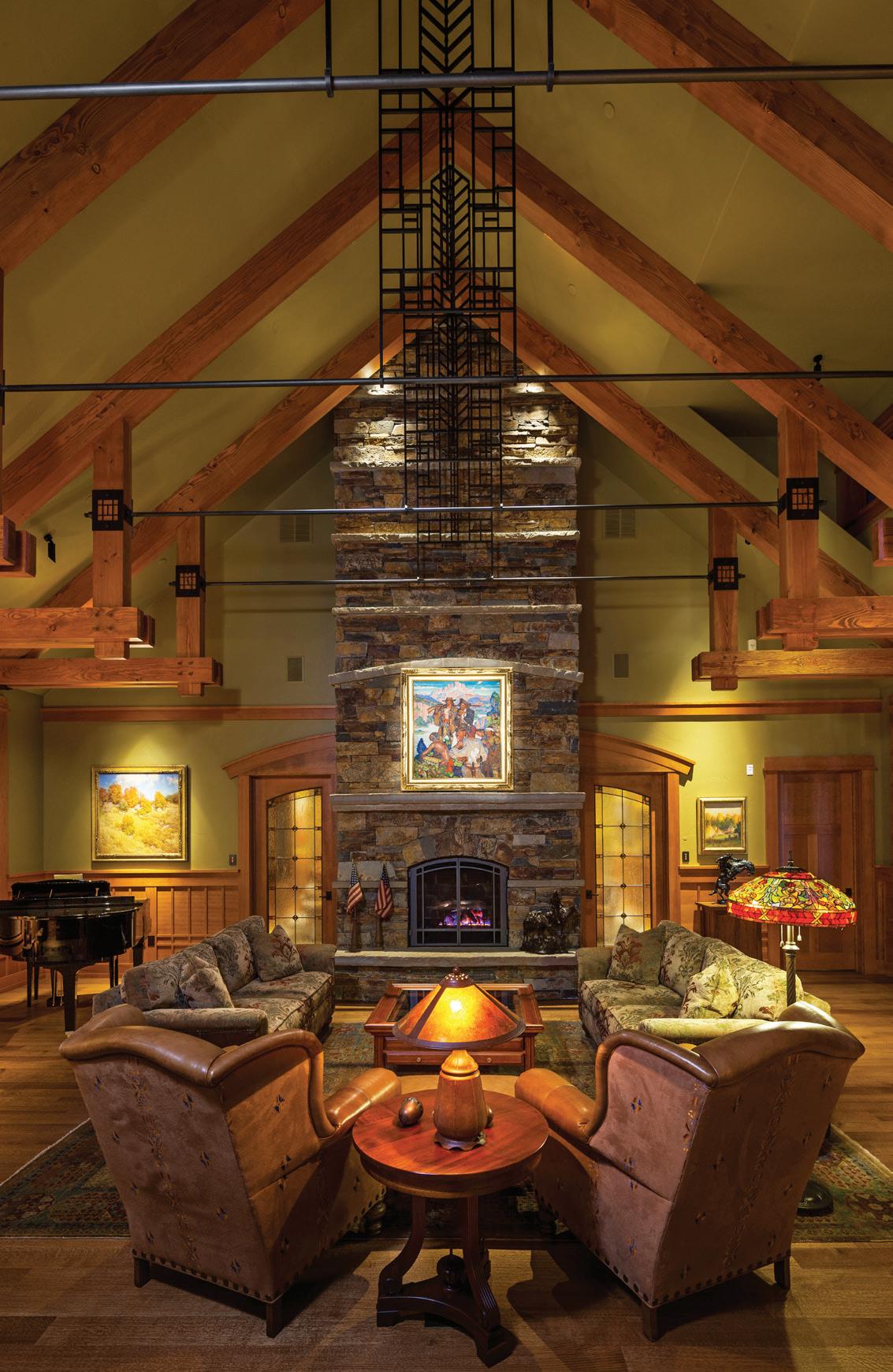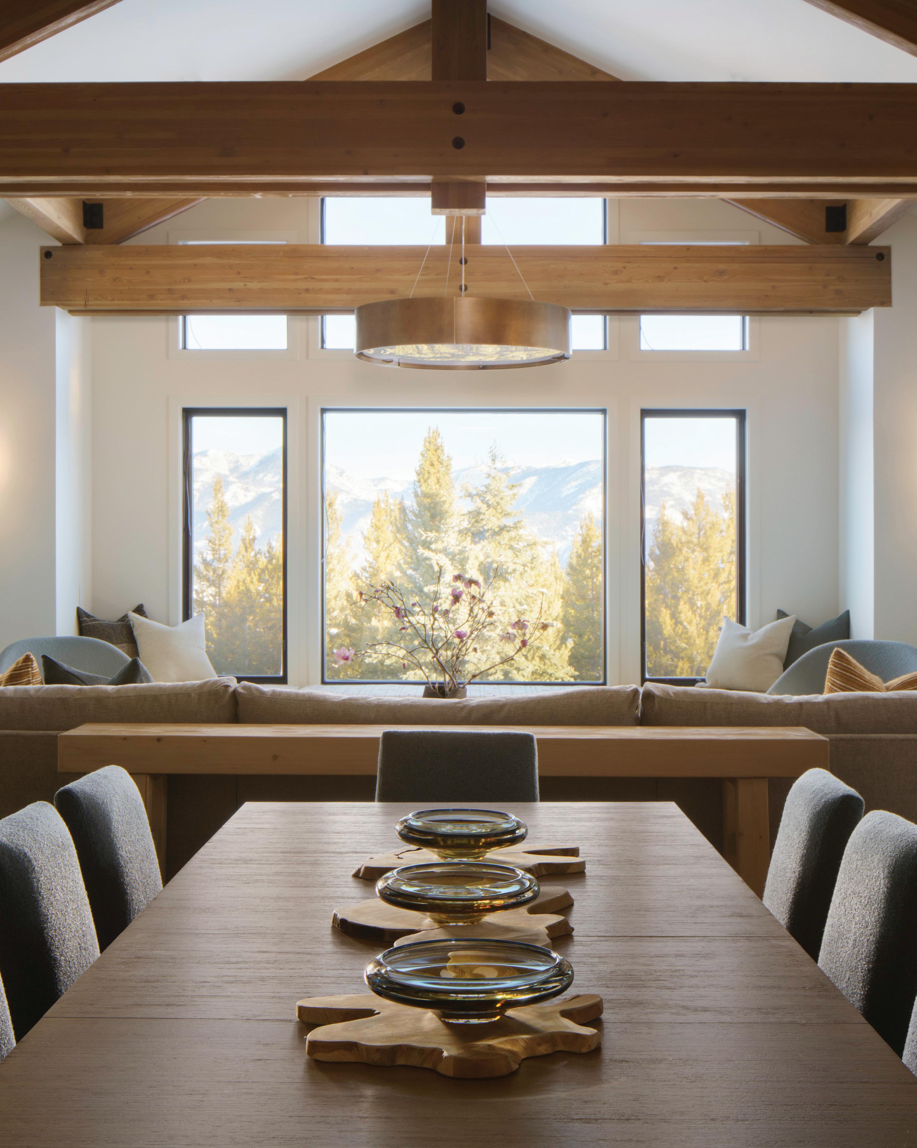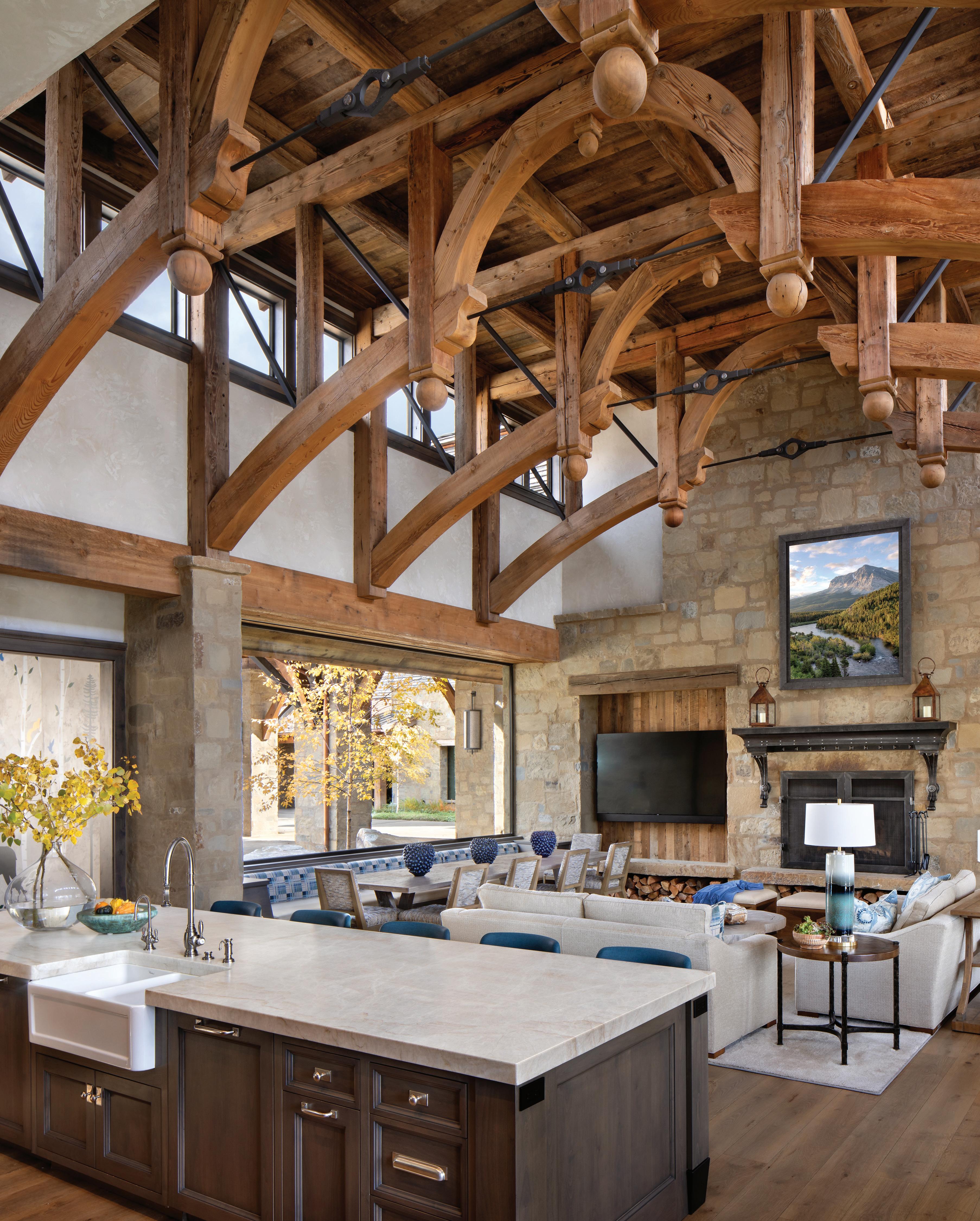 The firm designed the home to stand up to the grandeur of the surrounding Rocky Mountains. The architectural scale matches the magnificence of the landscape, with towering ceilings, voluminous rooms, massive timber trusses, and floor-to-ceiling windows that dissolve the boundary between indoors and outdoors, ensuring nature is everpresent. “Everything from stone elements to the scale of windows to the timber truss sizes, and the timbers in each one of those trusses, is proportional,” Steve explains. “And that’s where the artistic elements of architecture come into play.”