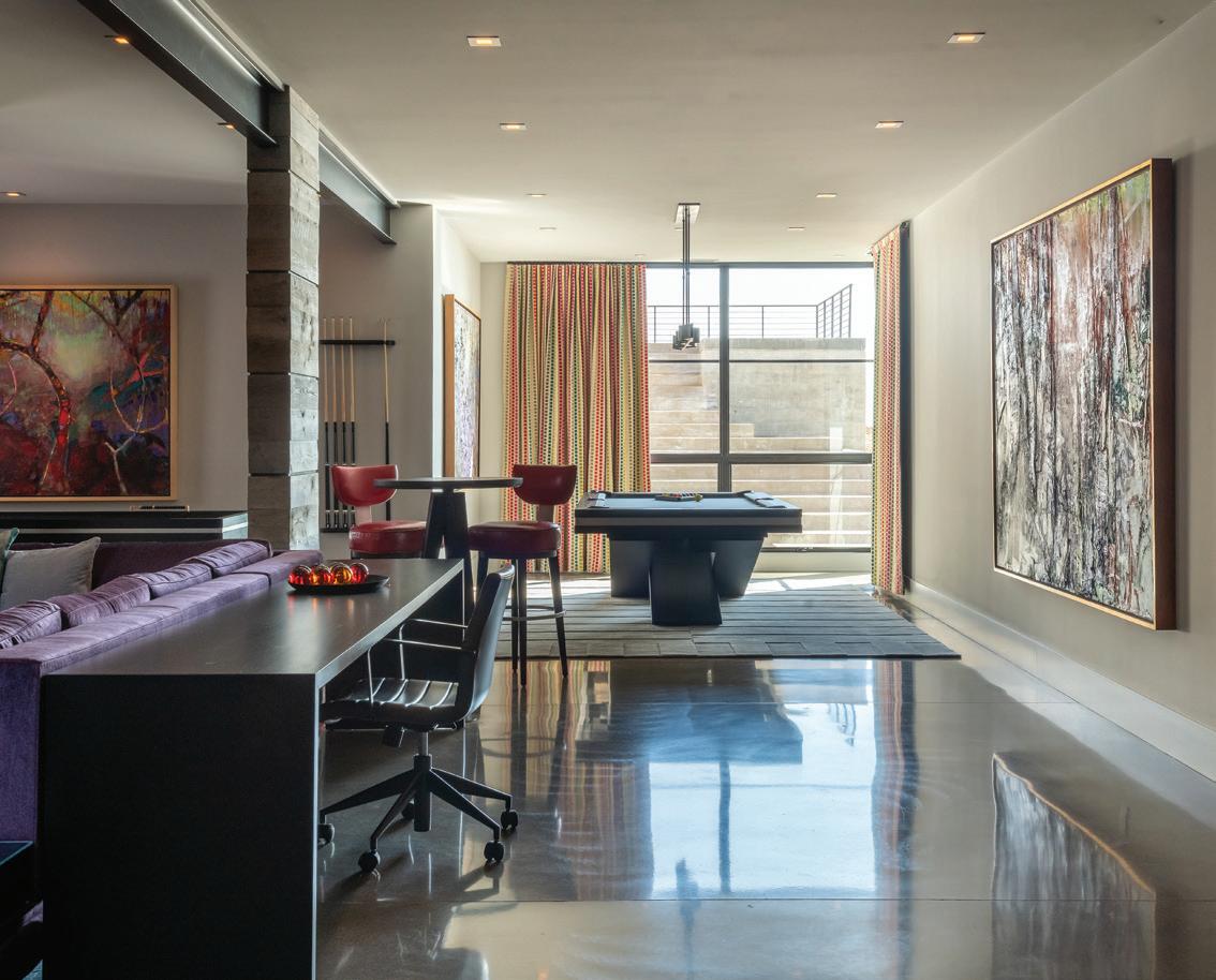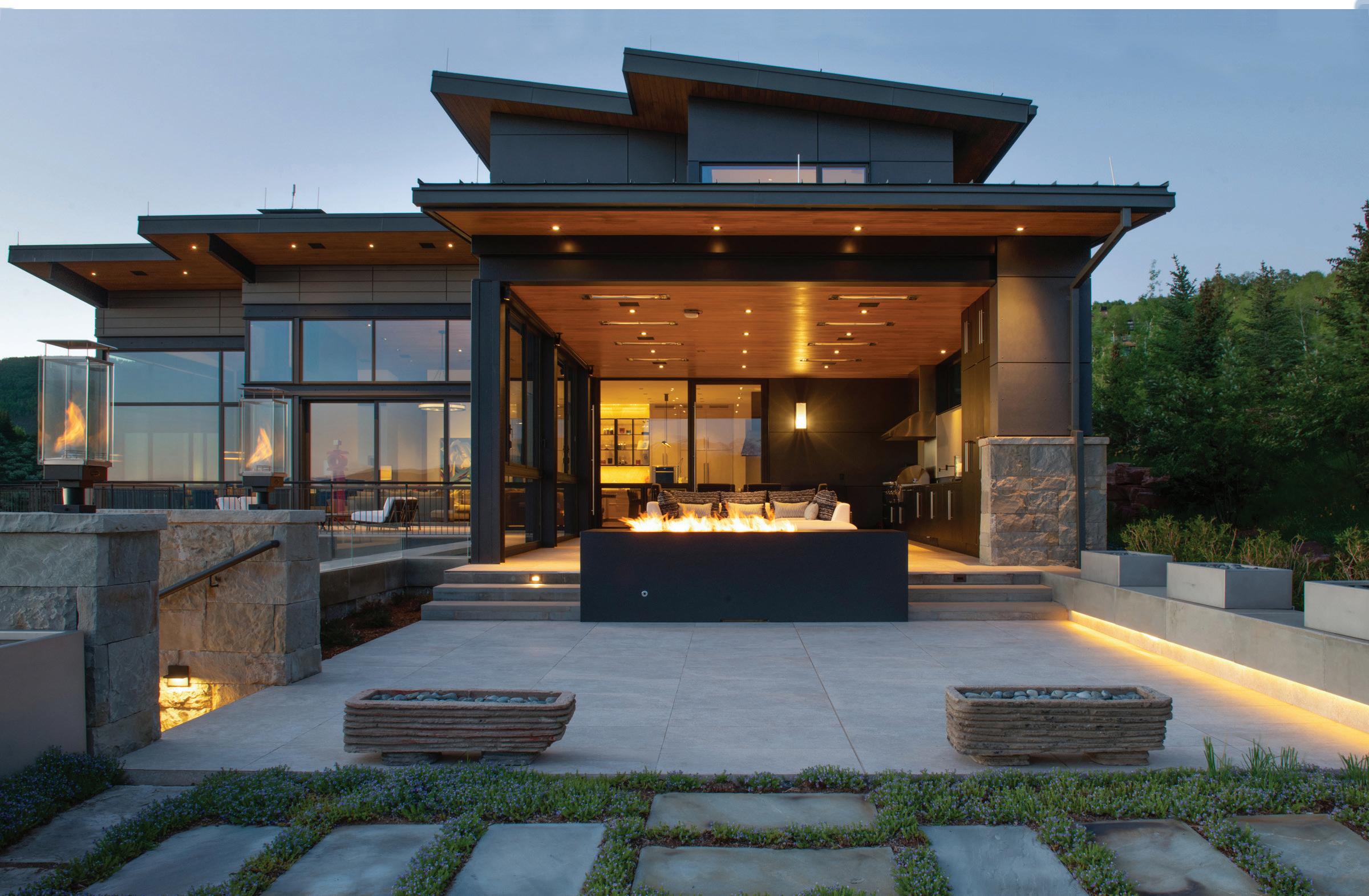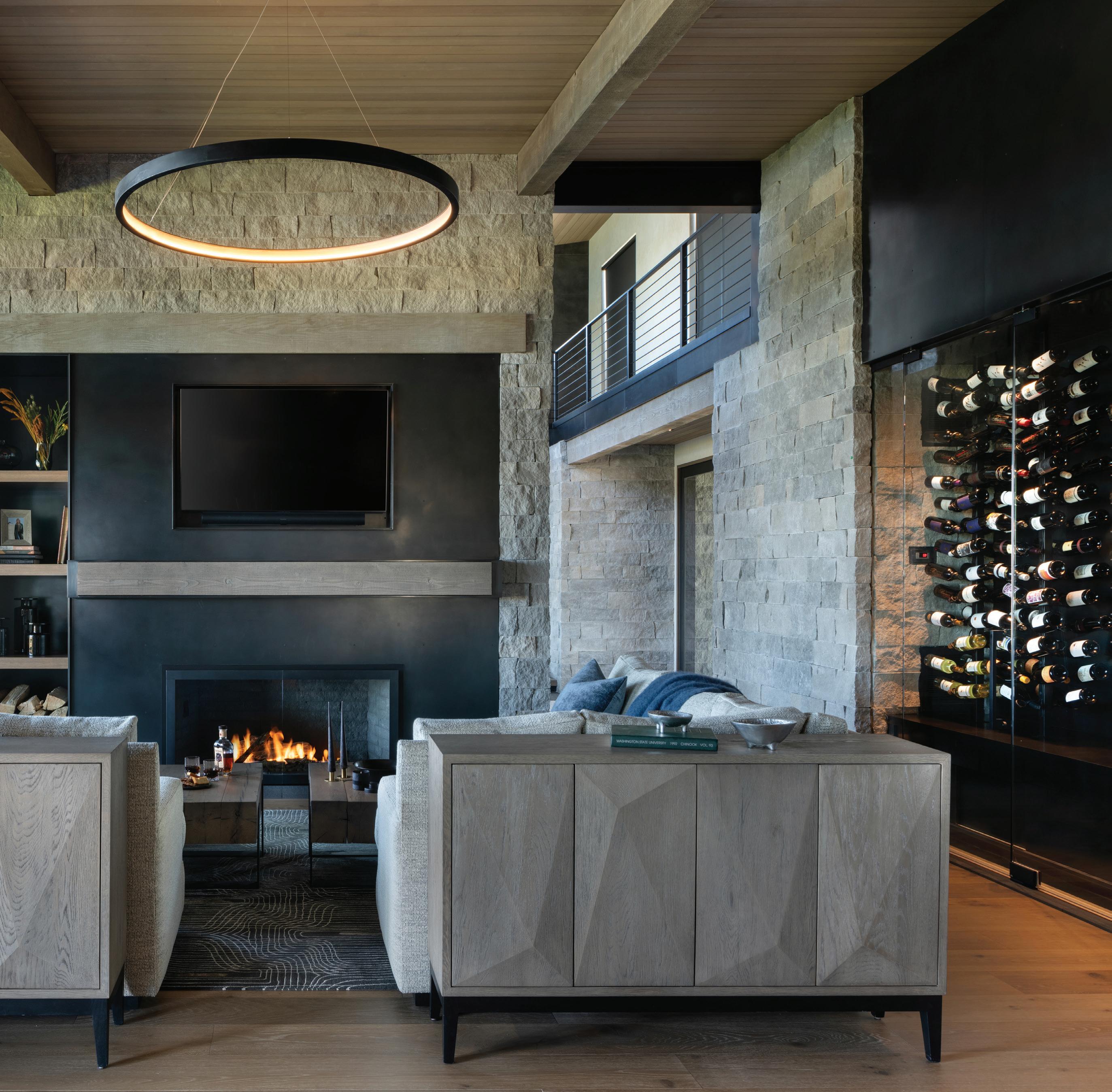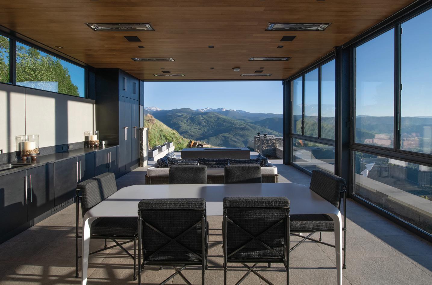 Thoughtful design offers every feature a family might want, including floor-to-ceiling windows on both levels to capture valley and mountain views, plenty of wide-open entertainment and living spaces for big family gatherings, guest rooms, and a wellness center. “Our numberone goal was to let the light in,” Caleo says. “There are unobstructed views out the kitchen and great room windows, which open via telescoping doors onto an expansive deck with covered outdoor dining and lounging space. It’s as easy to have a party outside as inside.”