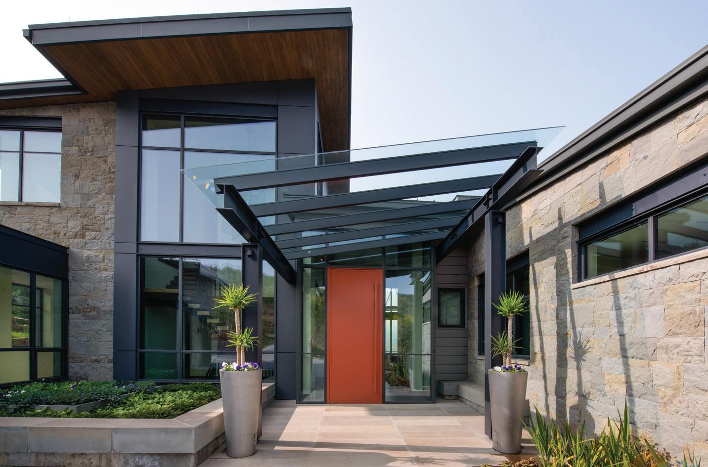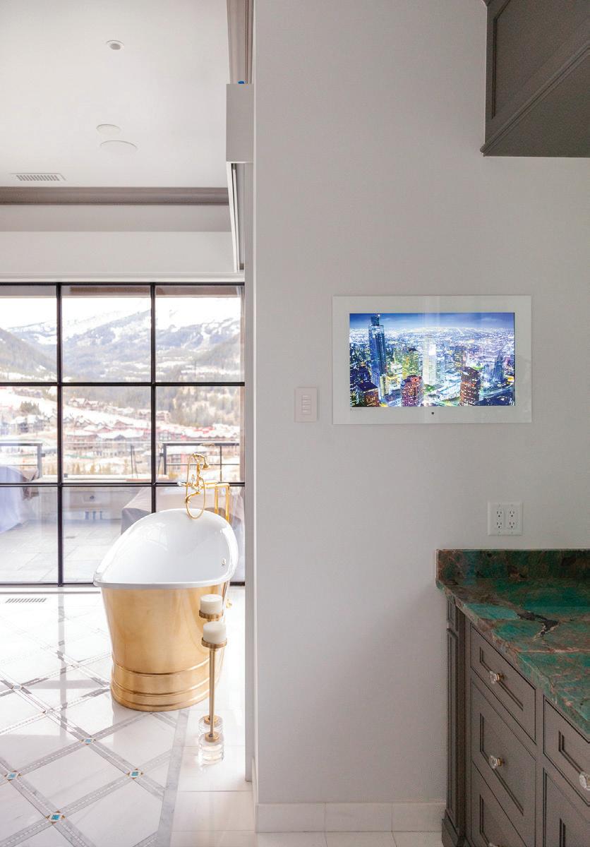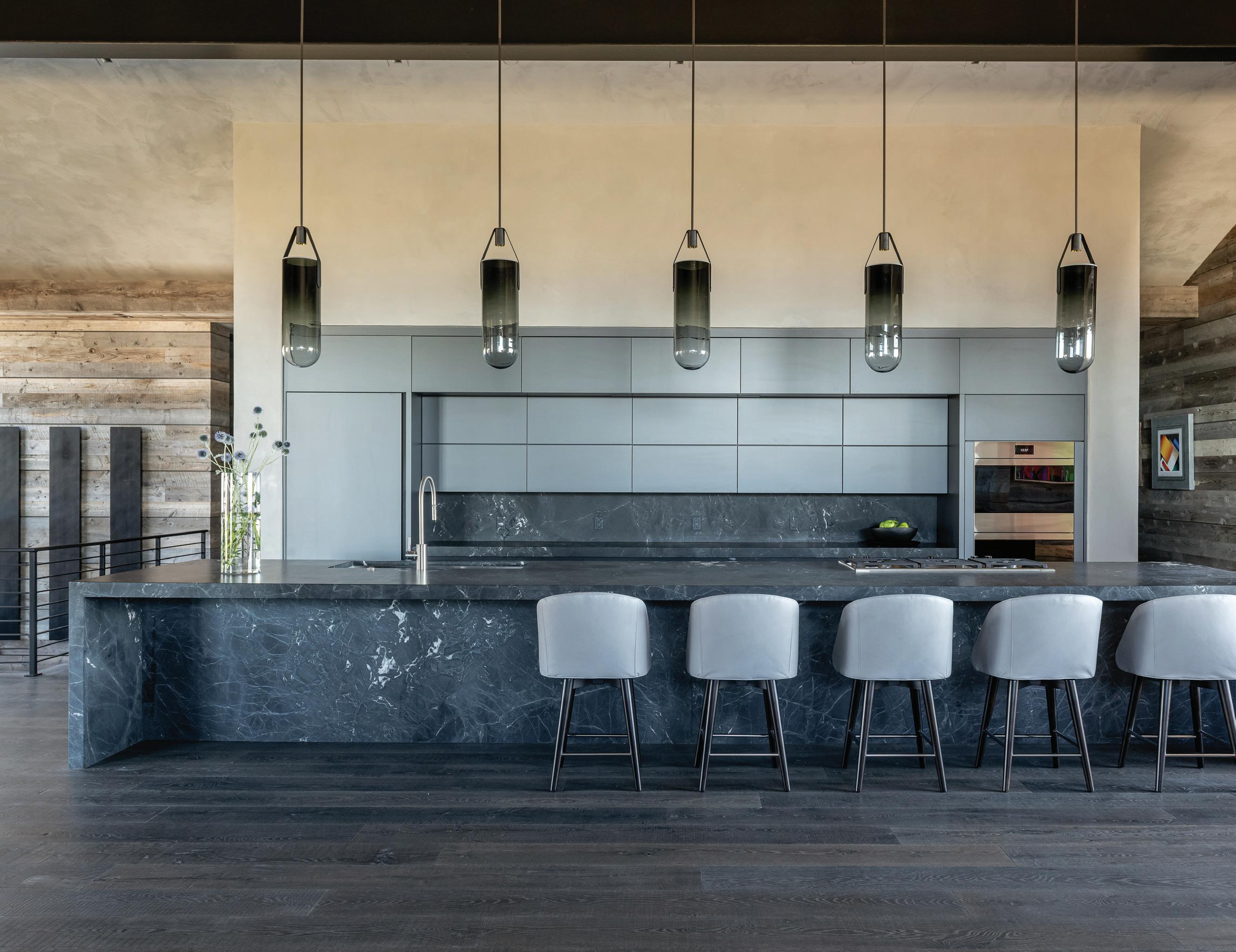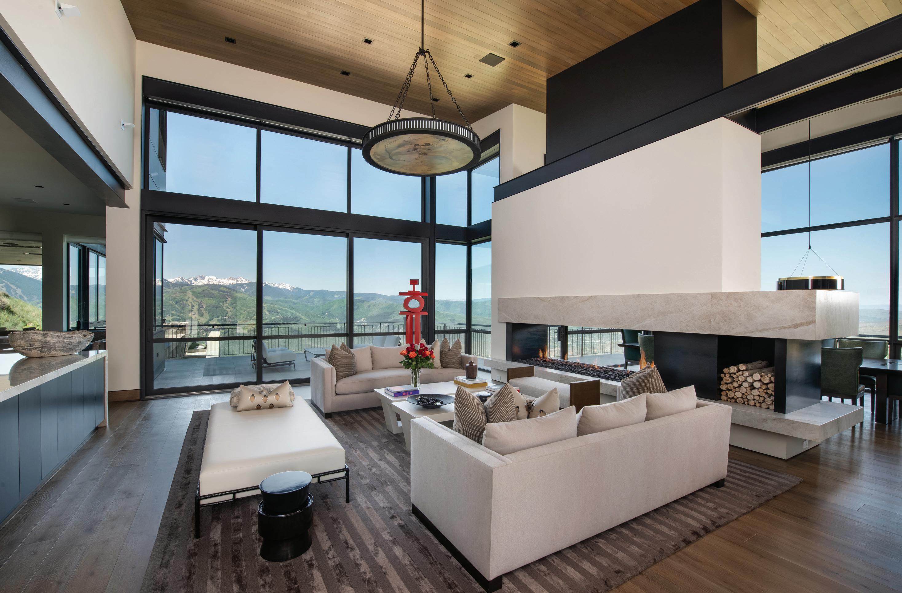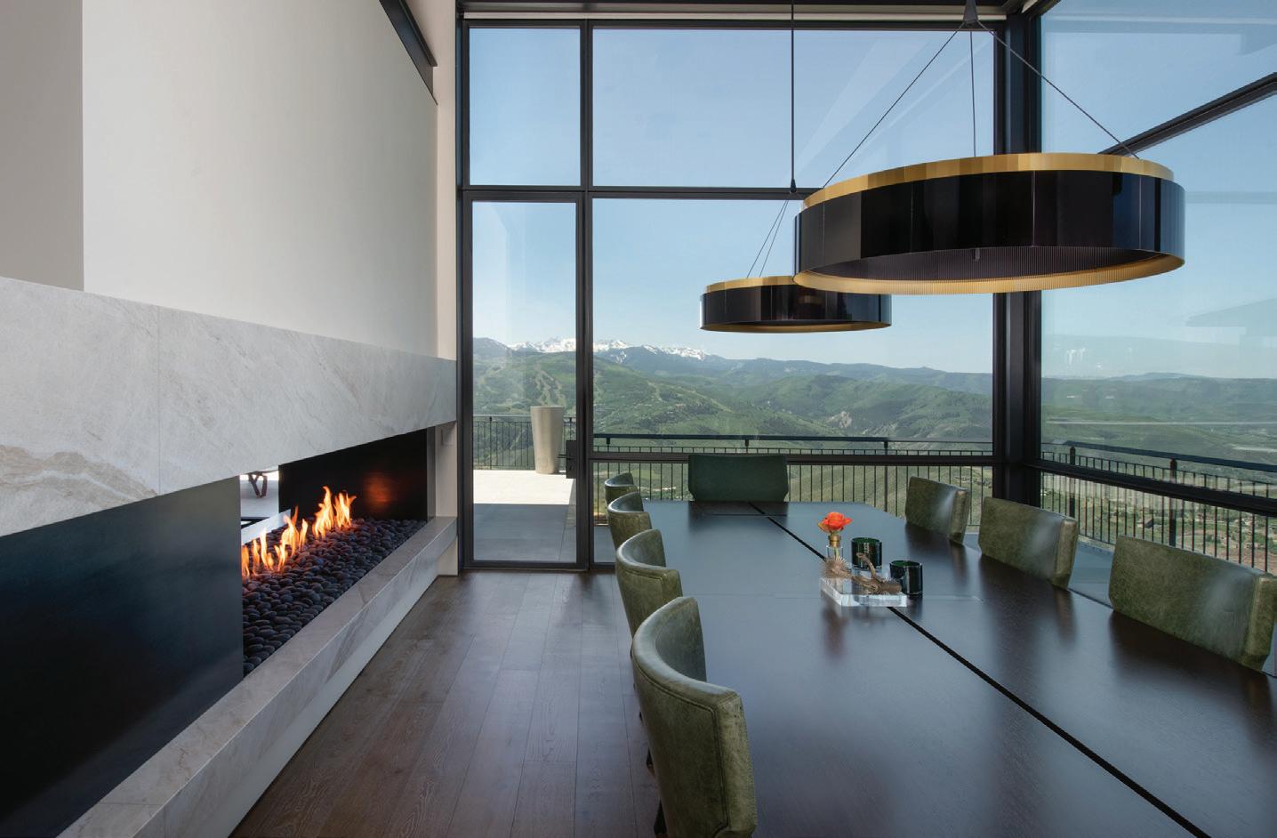 Thoughtful design offers every feature a family might want, including floor-to-ceiling windows on both levels to capture valley and mountain views, plenty of wide-open entertainment and living spaces for big family gatherings, guest rooms, and a wellness center. “Our numberone goal was to let the light in,” Caleo says. “There are unobstructed views out the kitchen and great room windows, which open via telescoping doors onto an expansive deck with covered outdoor dining and lounging space. It’s as easy to have a party outside as inside.”