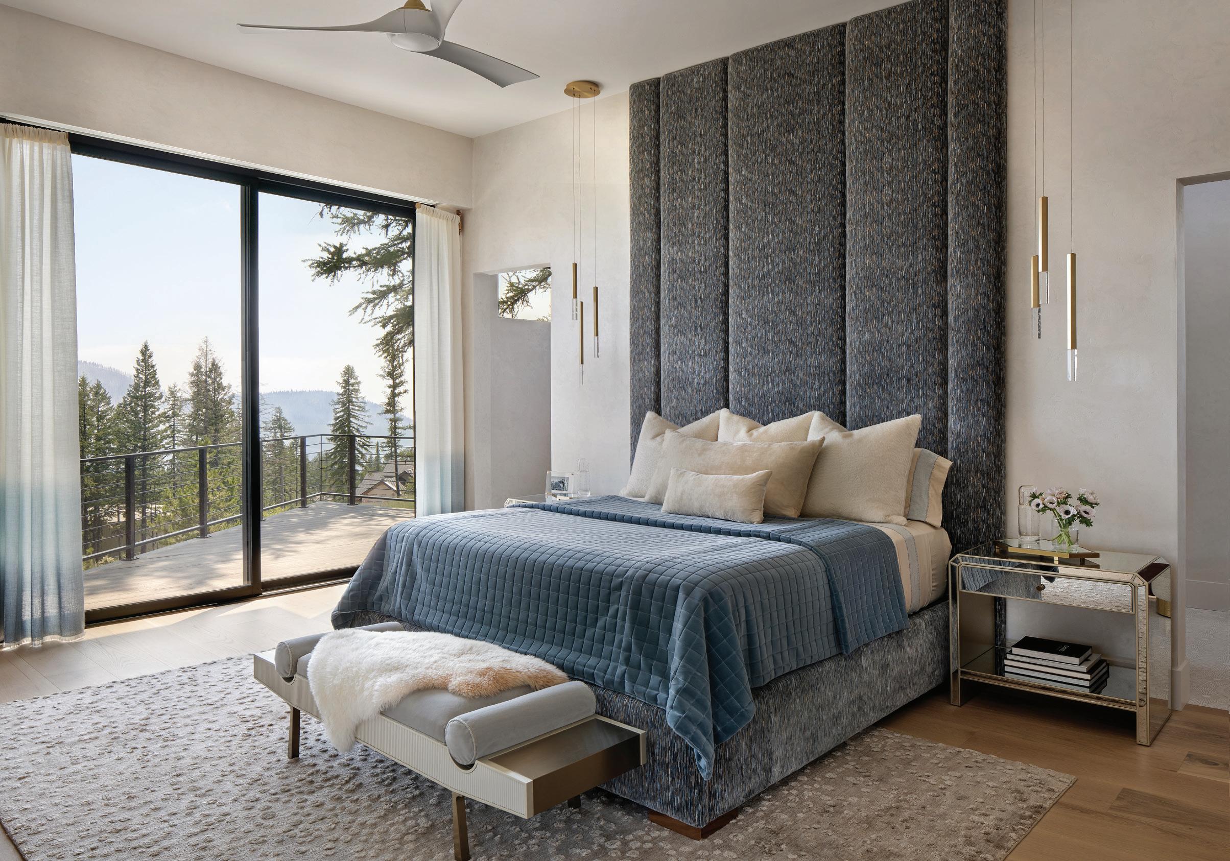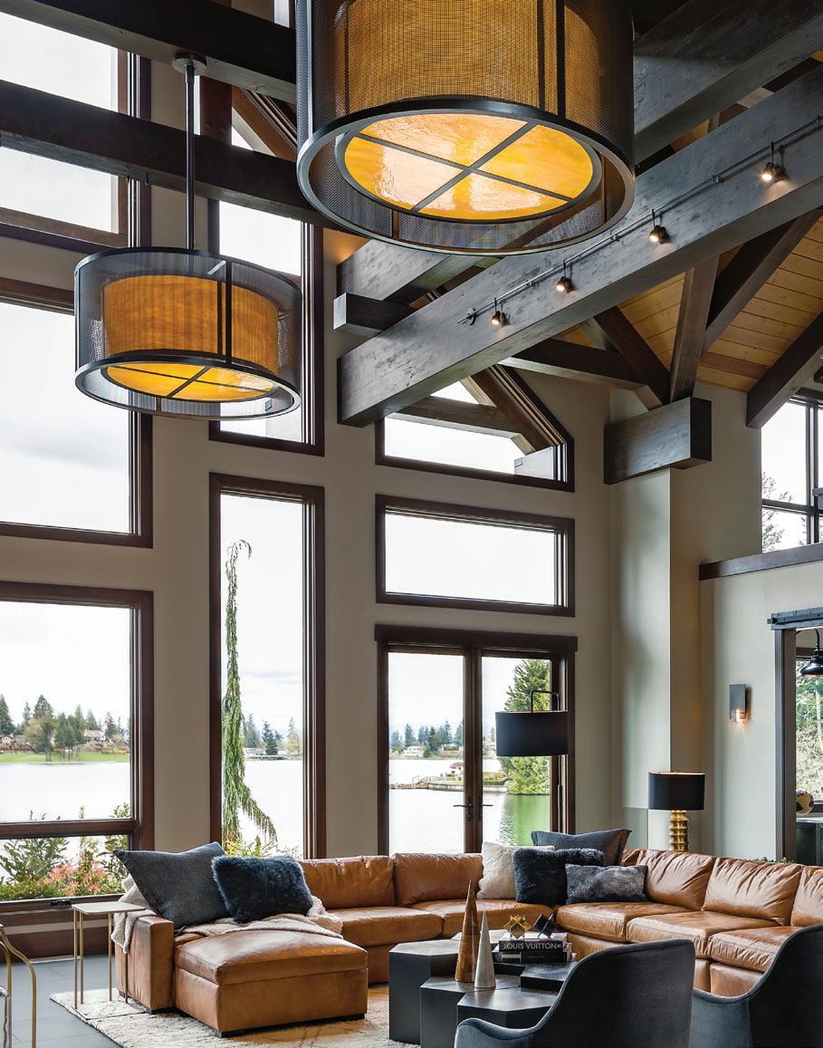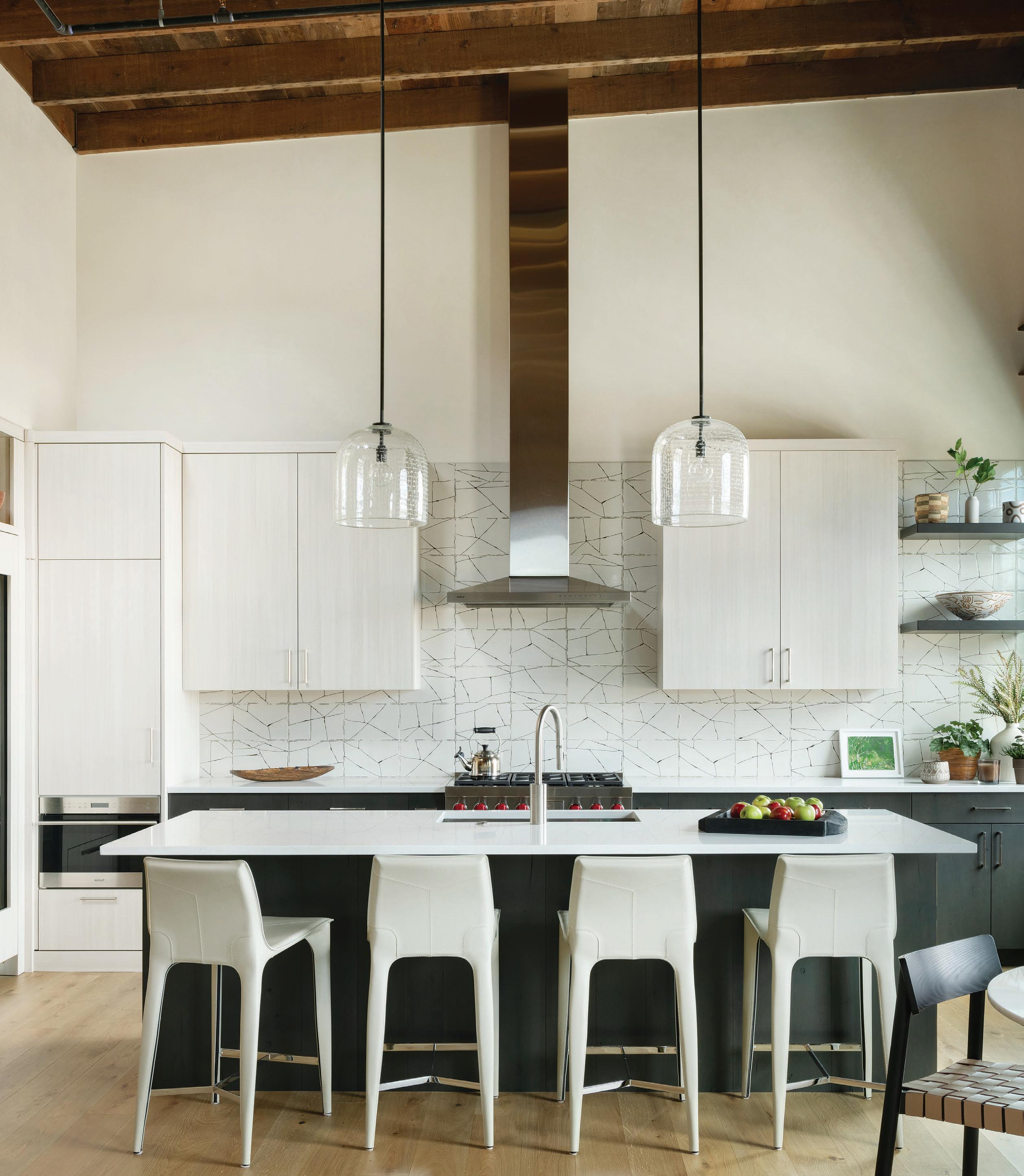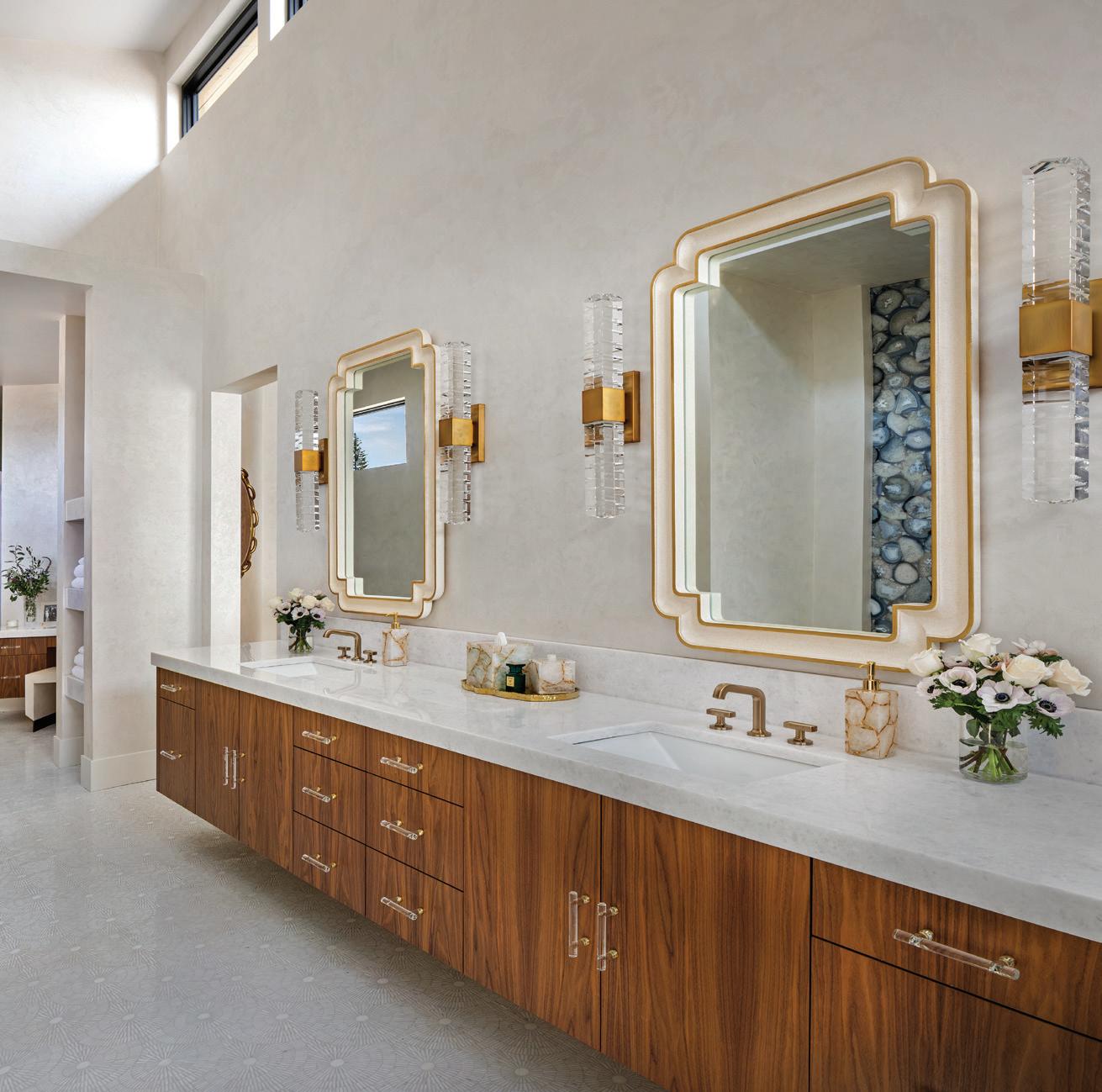 Thoughtful design offers every feature a family might want, including floor-to-ceiling windows on both levels to capture valley and mountain views, plenty of wide-open entertainment and living spaces for big family gatherings, guest rooms, and a wellness center. “Our numberone goal was to let the light in,” Caleo says. “There are unobstructed views out the kitchen and great room windows, which open via telescoping doors onto an expansive deck with covered outdoor dining and lounging space. It’s as easy to have a party outside as inside.”