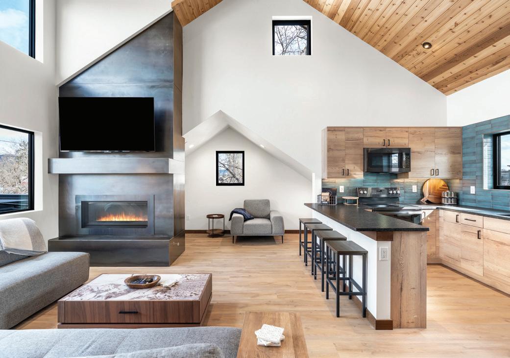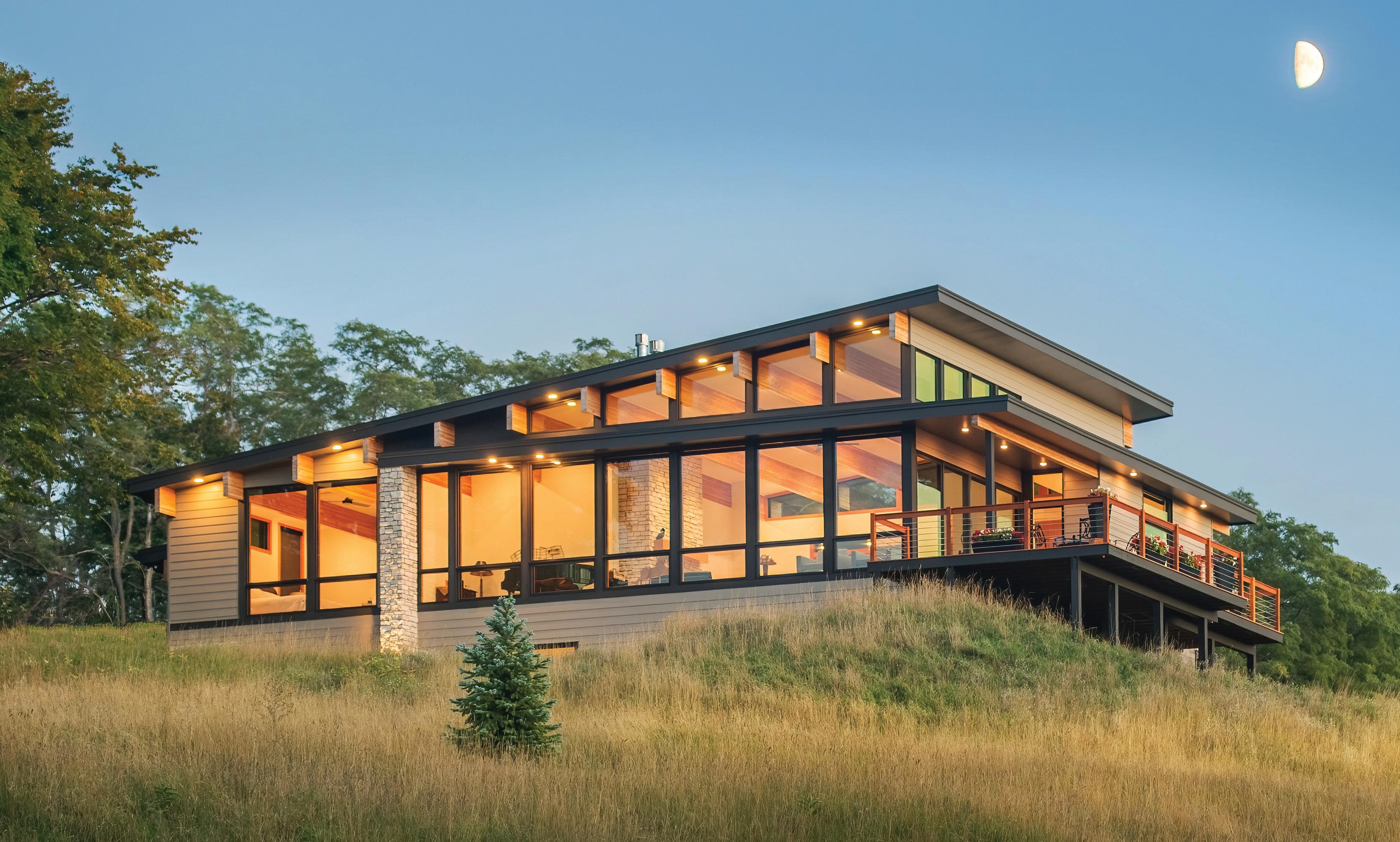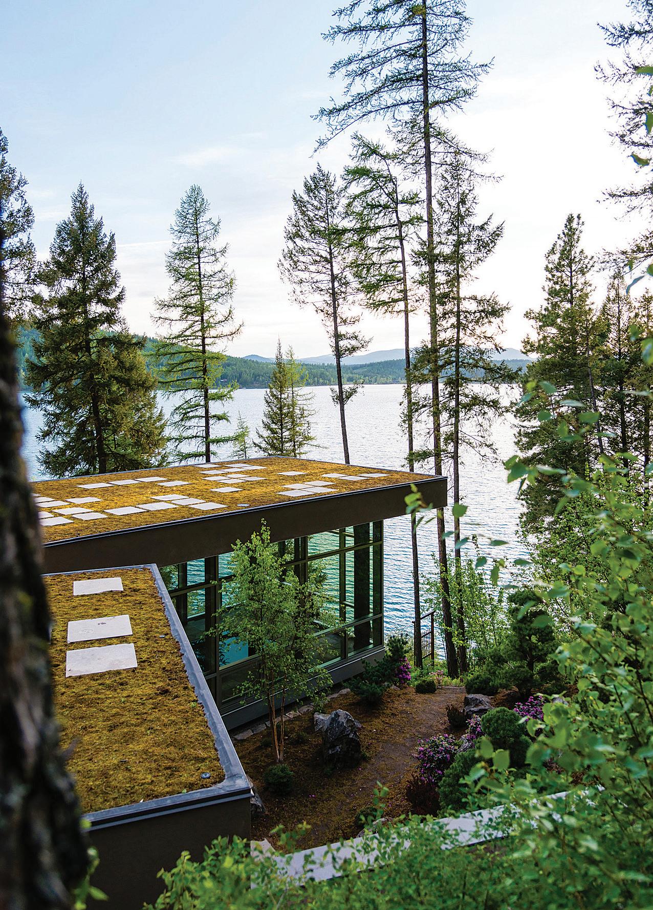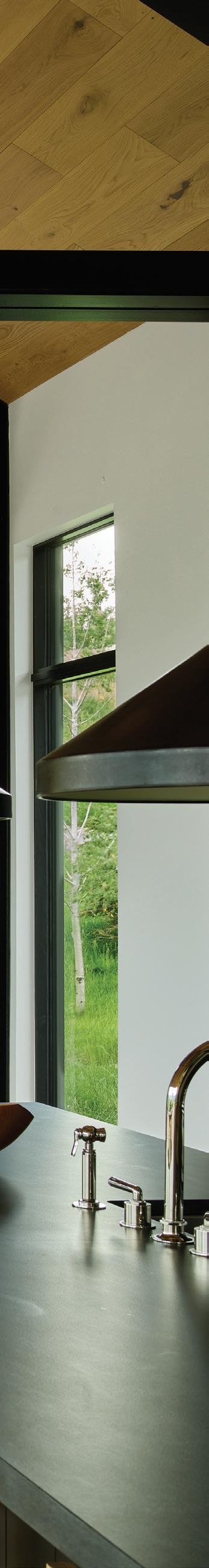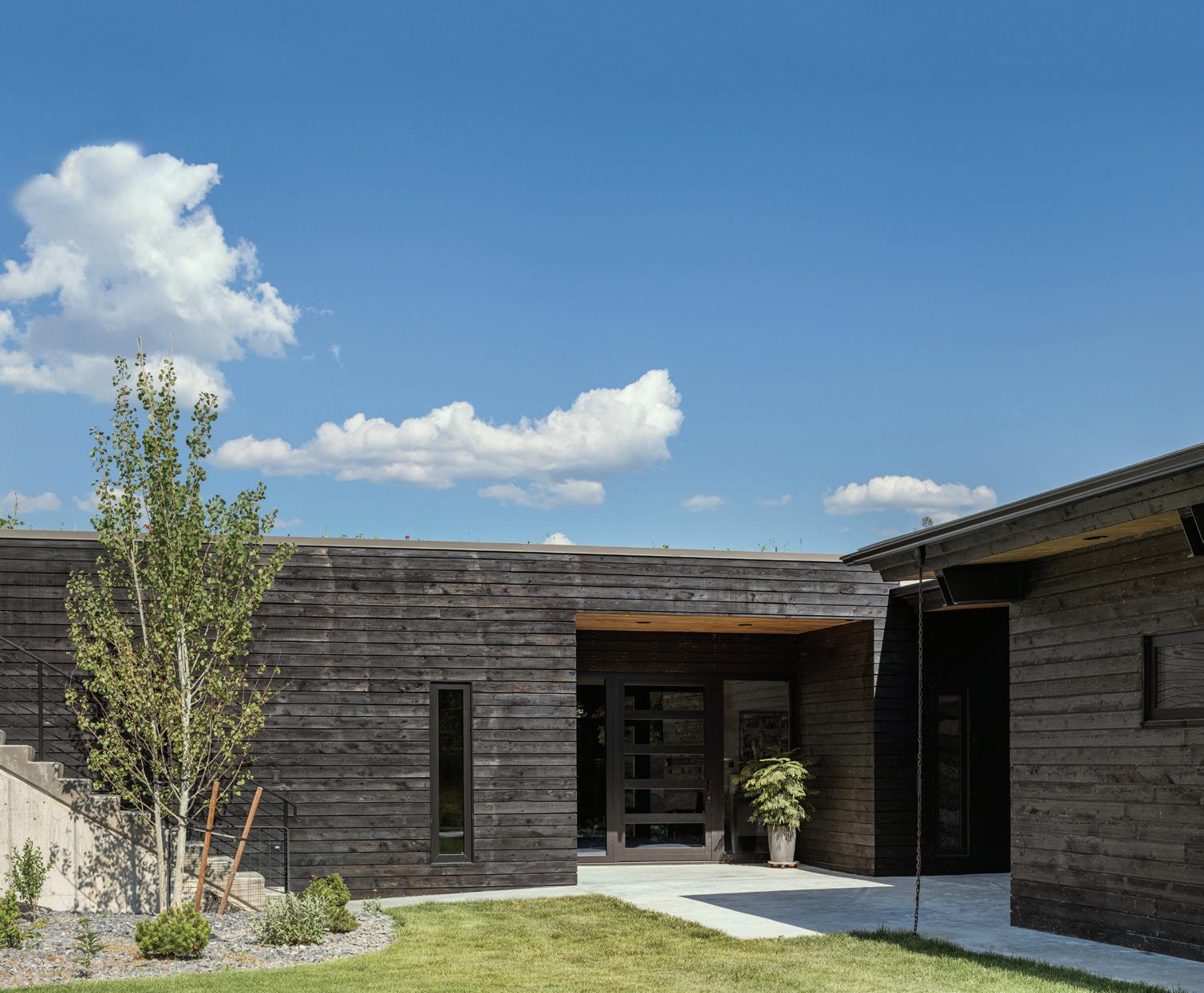 THE SYNERGISTIC TEAM CAME UP with the concept of a home that overlooked the valley while tucking into the sloped topography. It features a walkout basement nestled into the hillside and a pitched green roof on the garage that flows into the terrain and literally connects the building to the land. “As you approach on the steeply sloped driveway, the structure appears as a humble singlestory home and reveals itself as you get closer,” says Farmer about the 7, 234-square-foot house.