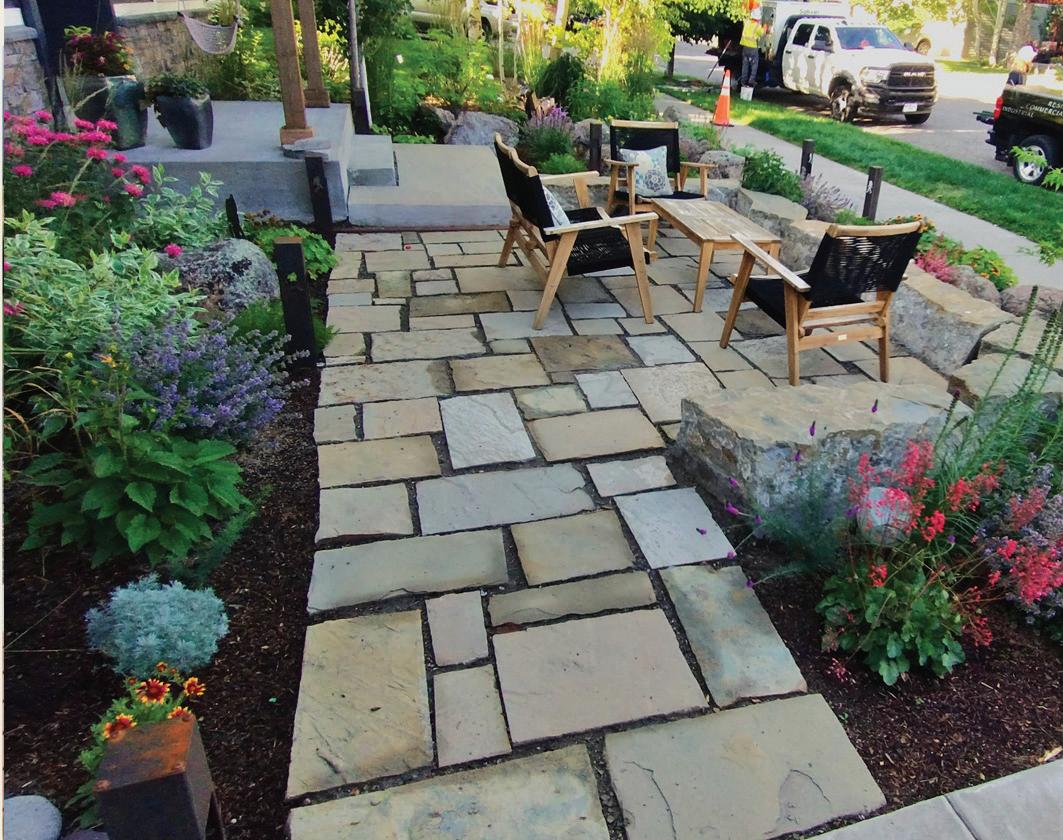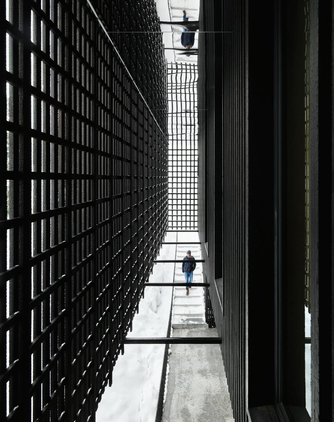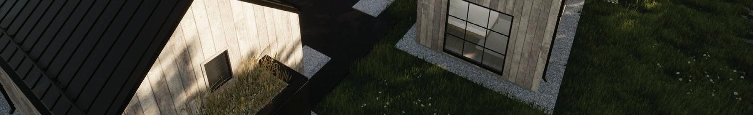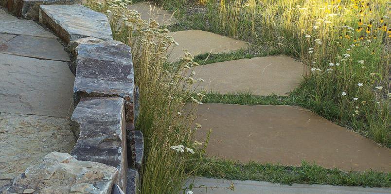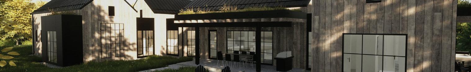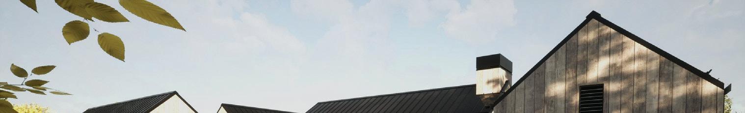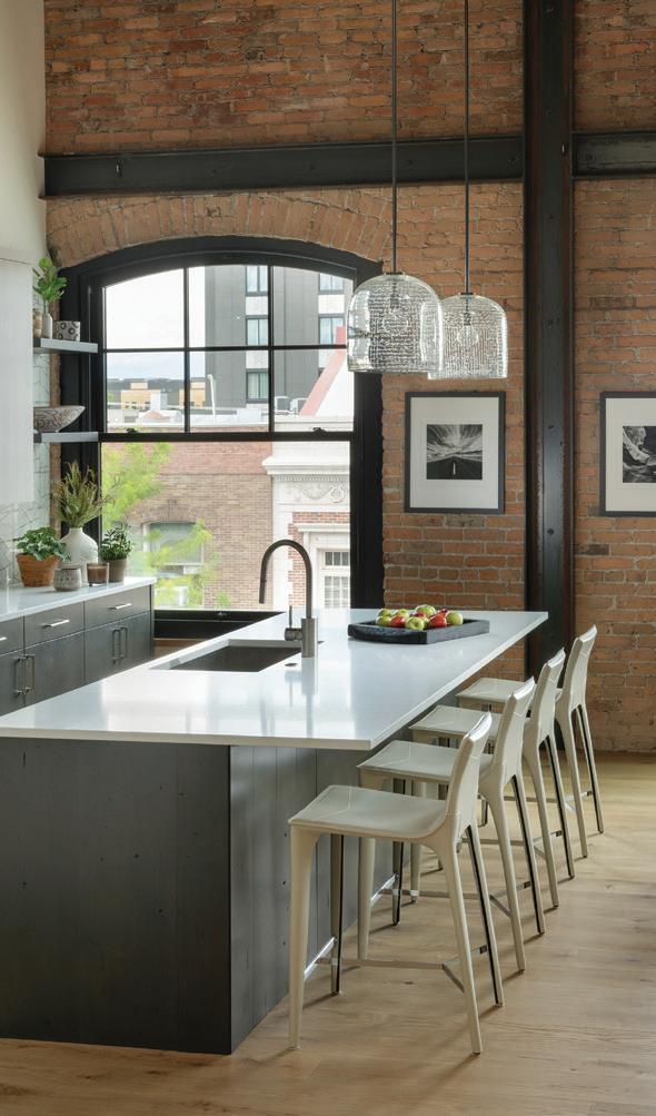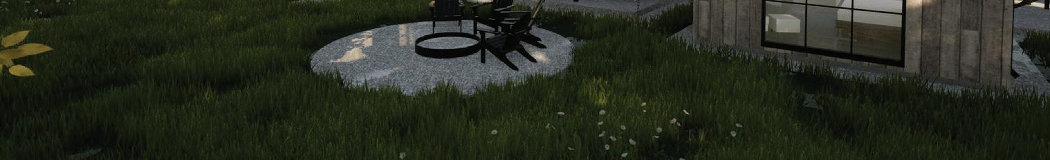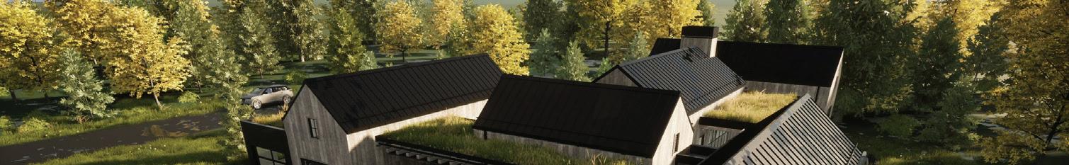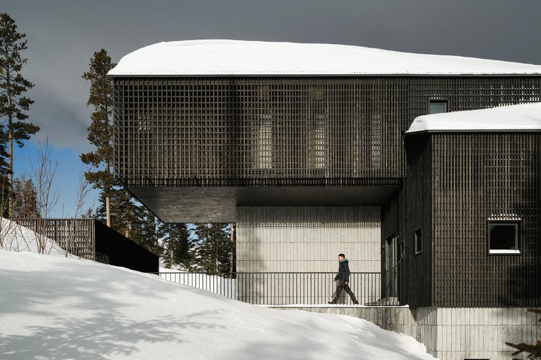 THE SYNERGISTIC TEAM CAME UP with the concept of a home that overlooked the valley while tucking into the sloped topography. It features a walkout basement nestled into the hillside and a pitched green roof on the garage that flows into the terrain and literally connects the building to the land. “As you approach on the steeply sloped driveway, the structure appears as a humble singlestory home and reveals itself as you get closer,” says Farmer about the 7, 234-square-foot house.