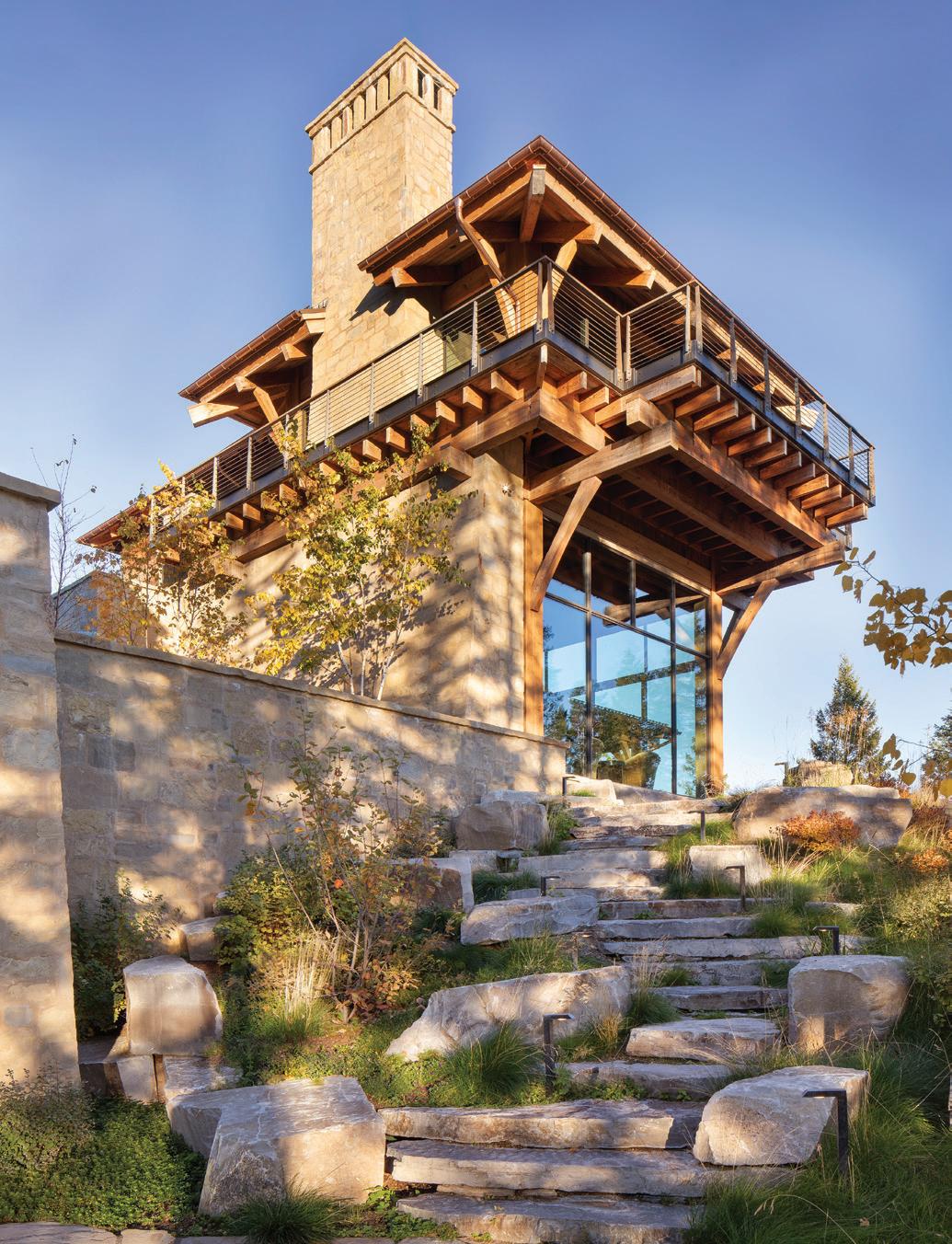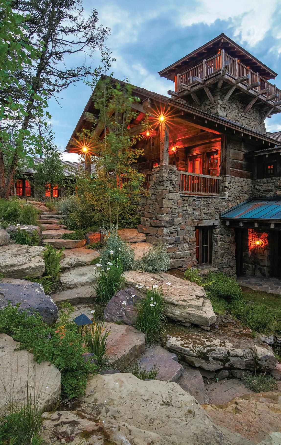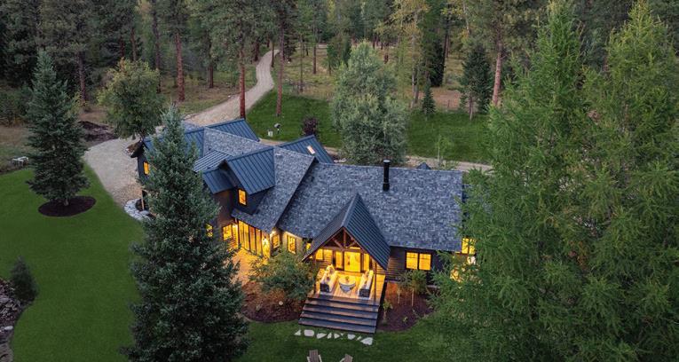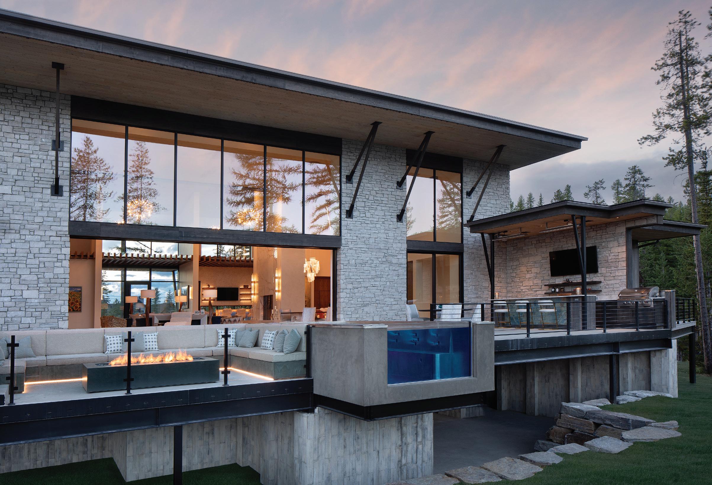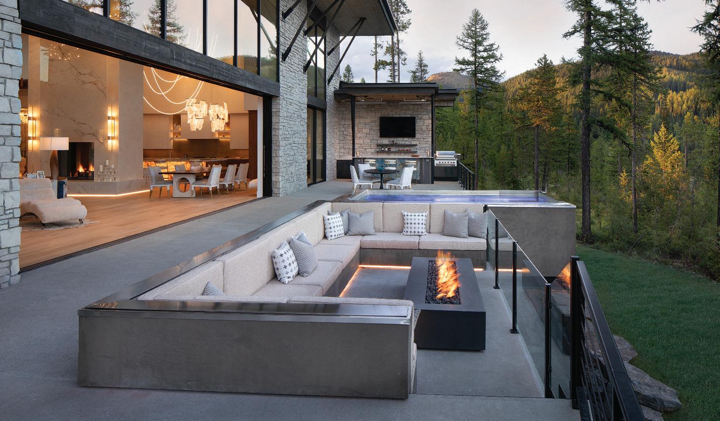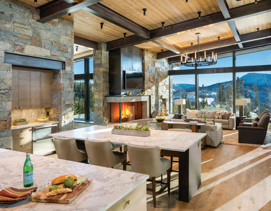 The inspiration for this R o cky Mountain retreat was rooted in nature. The interior design balances scale with intimacy, ensuring the home feels welcoming rather than overwhelming. • Locati Architects designed the home to facilitate enjoyment of the outdoors for multiple generations. A pool house with three-story waterslides does the trick for the grandchildren during the summertime.